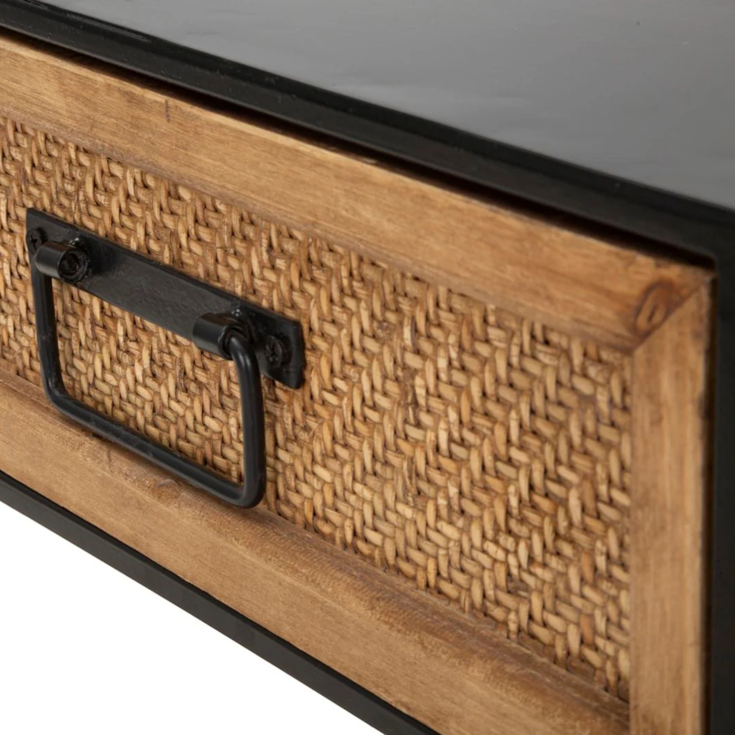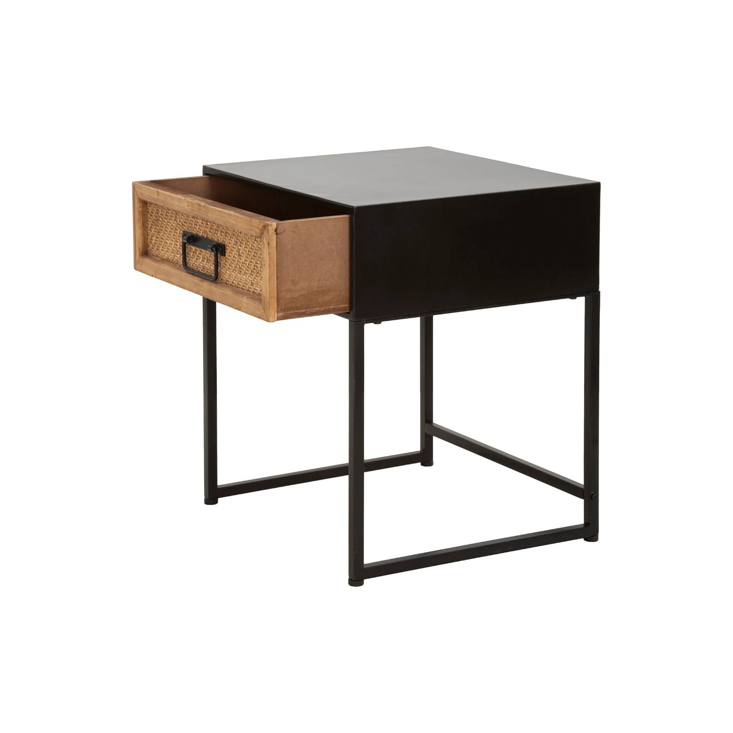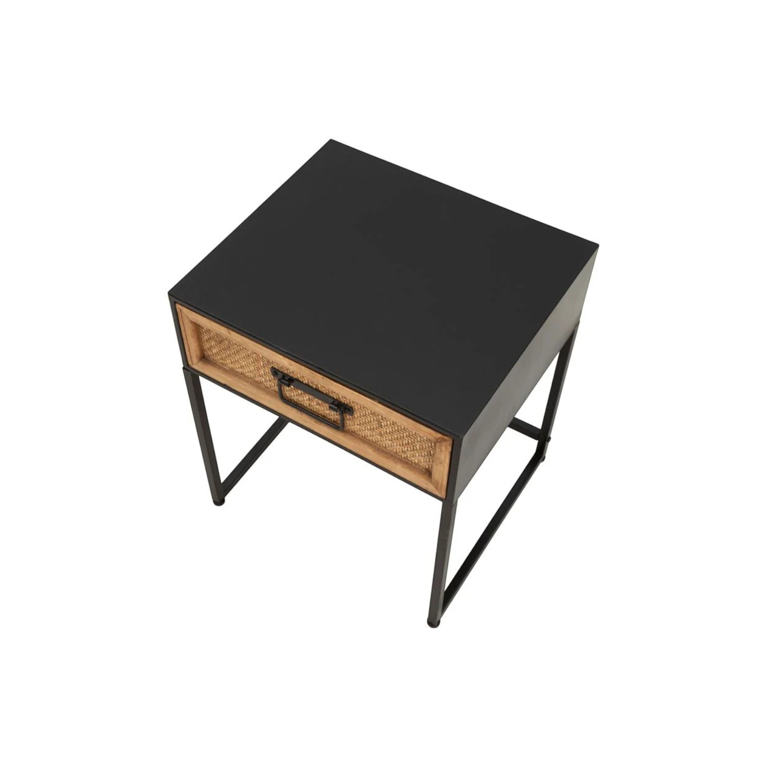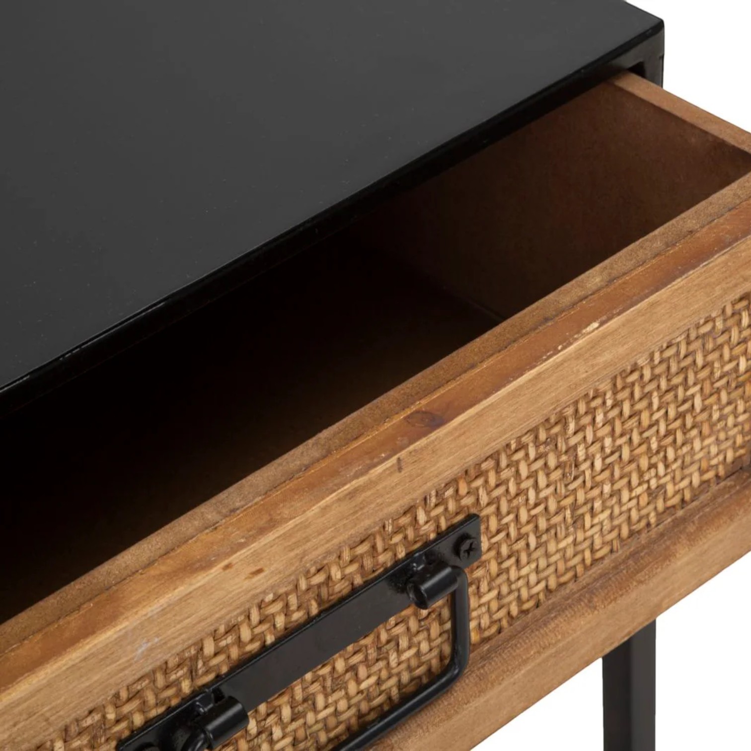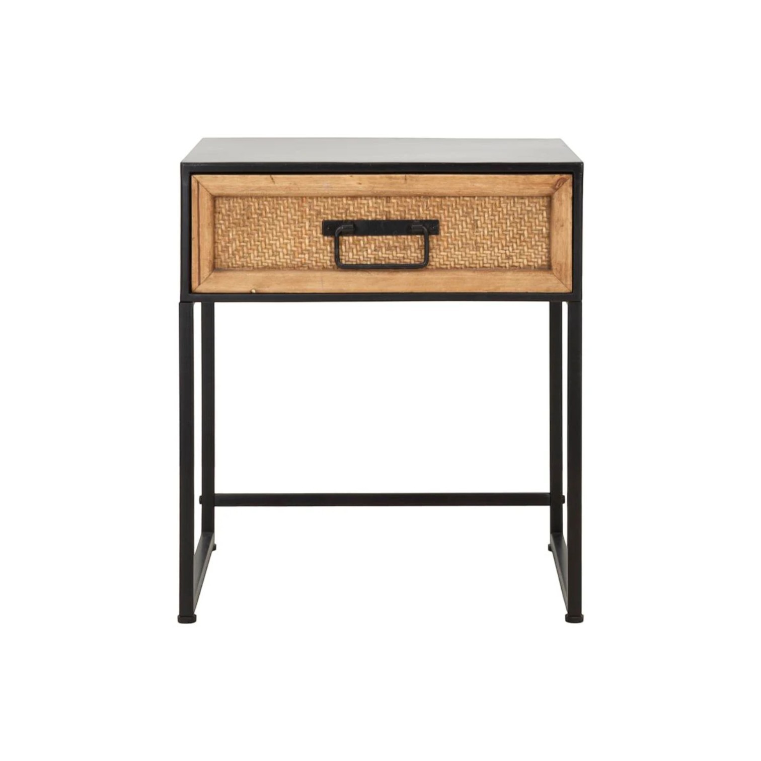 Noćni ormarić s crnom metalnom strukturom i drvenom ladicom izrade koja podsjeća na tkanje ratana. Jednostavan i linearan dizajn čini ga pogodnim za kombiniranje s bilo kojom vrstom namještaja.