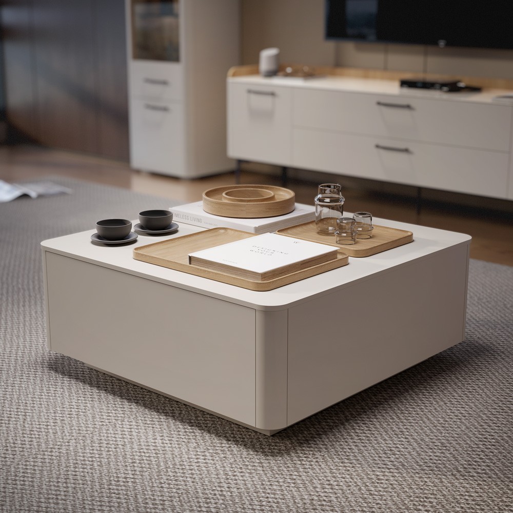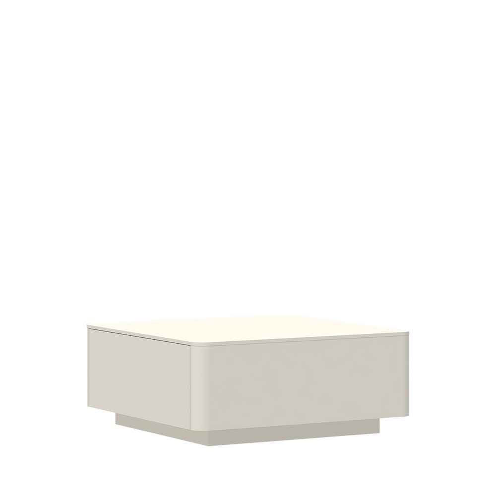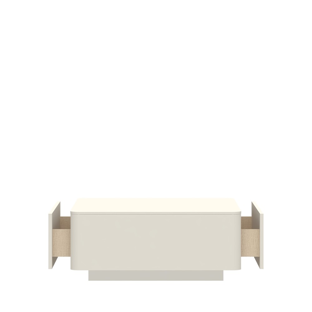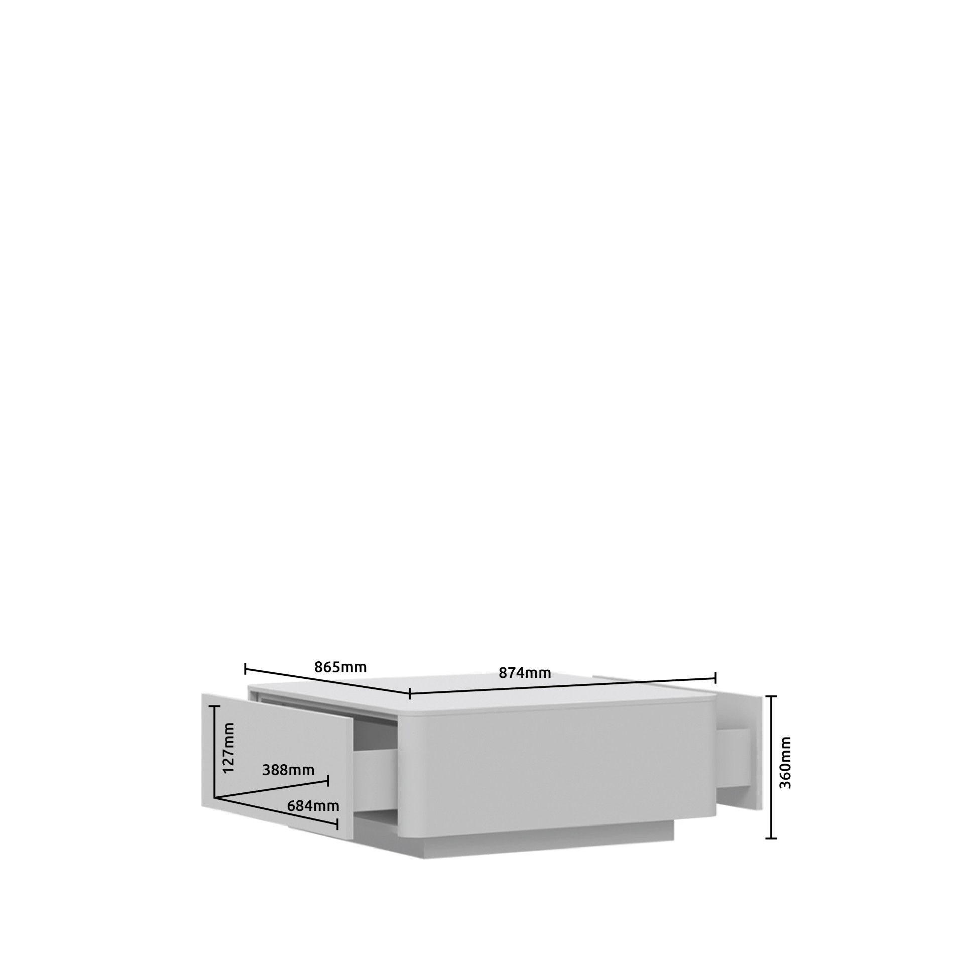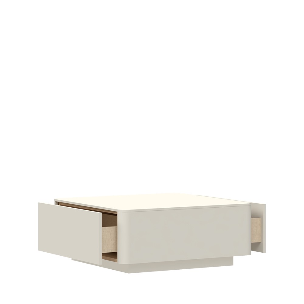 Klub stol sa dvije ladice za dnevni boravak iz kolekcije Air. Ladice stola s mehanizmom za lagano zatvaranje. Unutrašnjost ladice je u tekstil dekoru. Strop, fronta i stranice ladica su lakirane UV lakom u dekoru pepper white. Push-to-open mehanizam. Soft-close klizači.