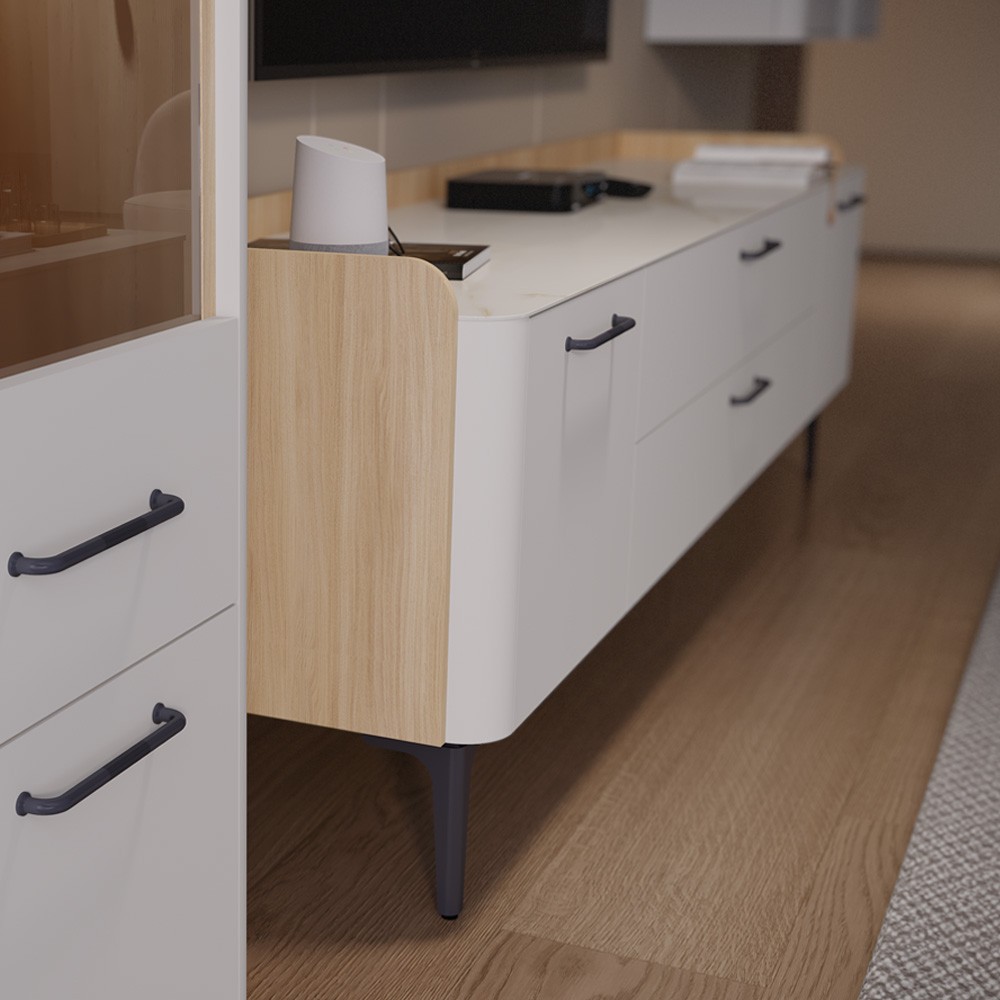 TV komoda za dnevni boravak iz kolekcije Air sa dva krila i dvije ladice. Fronte su lakirane mat UV lakom u dekoru pepper white. Duple stranice čiji je vidljivi dio i unutrašnjost elementa su u dekoru furneo hrast. Unutrašnjost ladice je u tekstil dekoru. Ukrasna lajsna je od MDF-a, na stropu staklo 4 mm je u mramornom dekoru Calacatta Oro. Metalne ručkice, nogice i metalni okvir su u antracit dekoru. Skriveni klizači s usporivačima, soft-close šarke su crne boje.