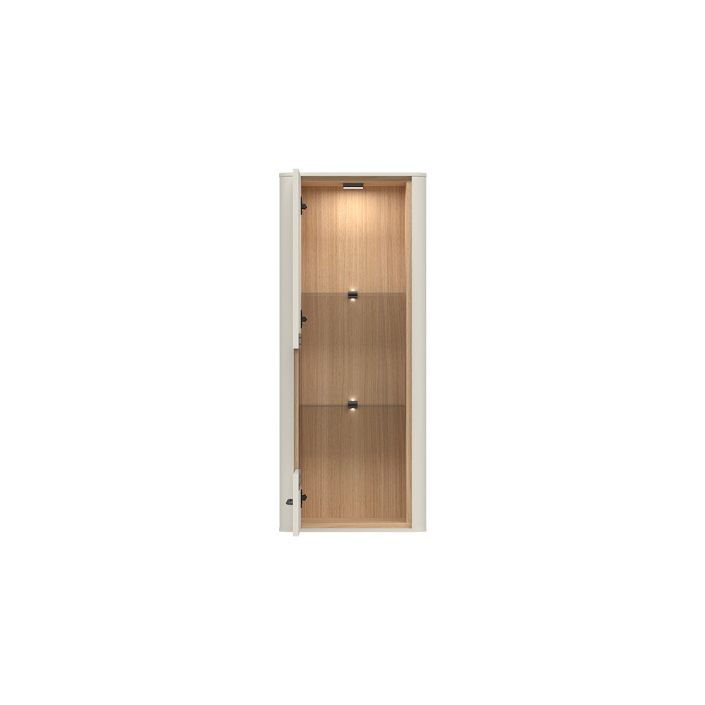 Viseća vitrina za dnevni boravak iz kolekcije Air jednokrilna sa staklom. Fronta lakirana mat UV lakom u dekoru pepper white staklo parsol gey 4 mm. Unutrašnjost elementa u dekoru furneo hrast. Ukrasna lajsna od MDF-a, 2 police od kaljenog parsol grey stakla 6 mm. LED rasvjeta 2.4W, metalne ručkice u antracit dekoru, soft-close šarke su crne boje.