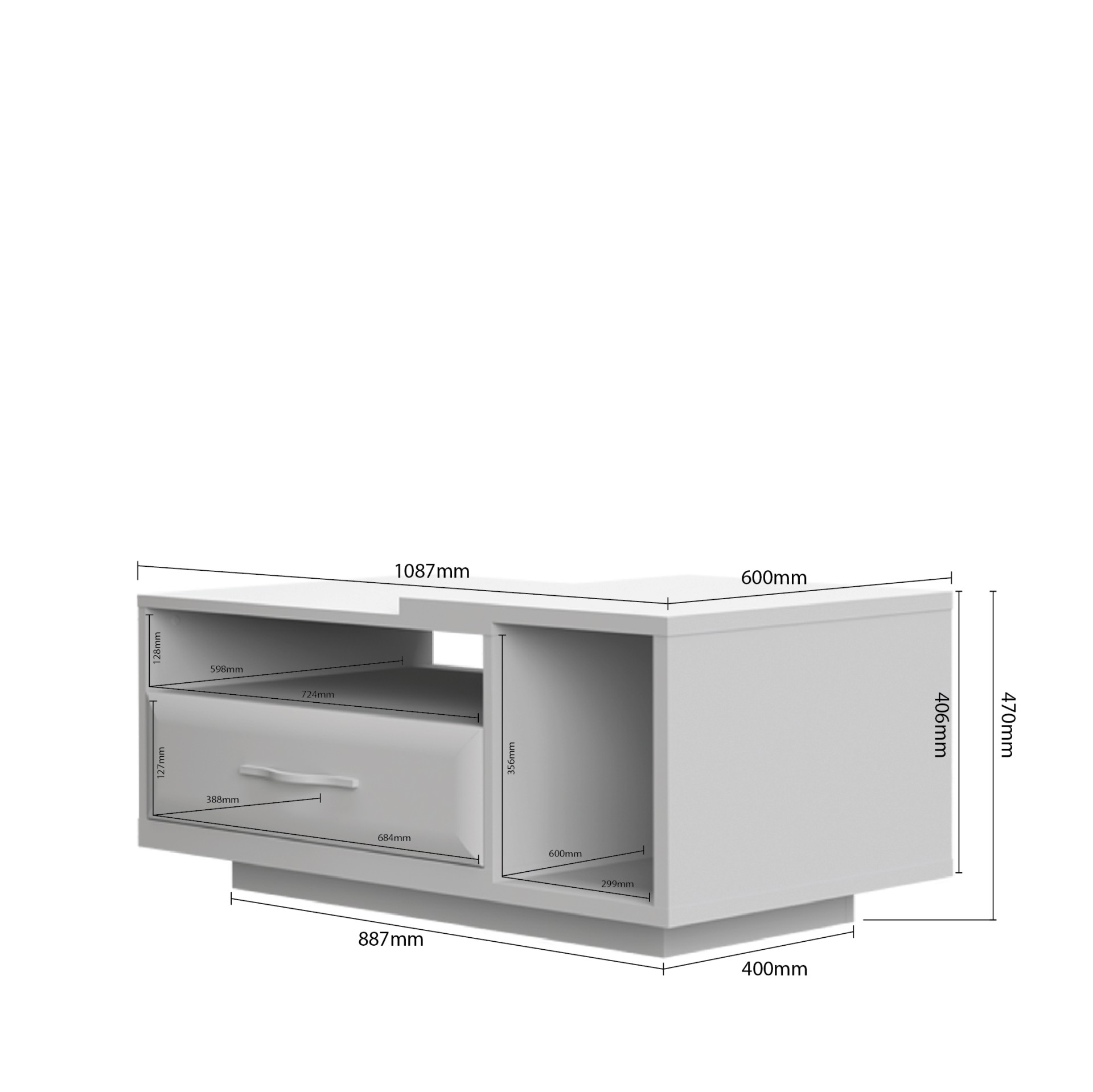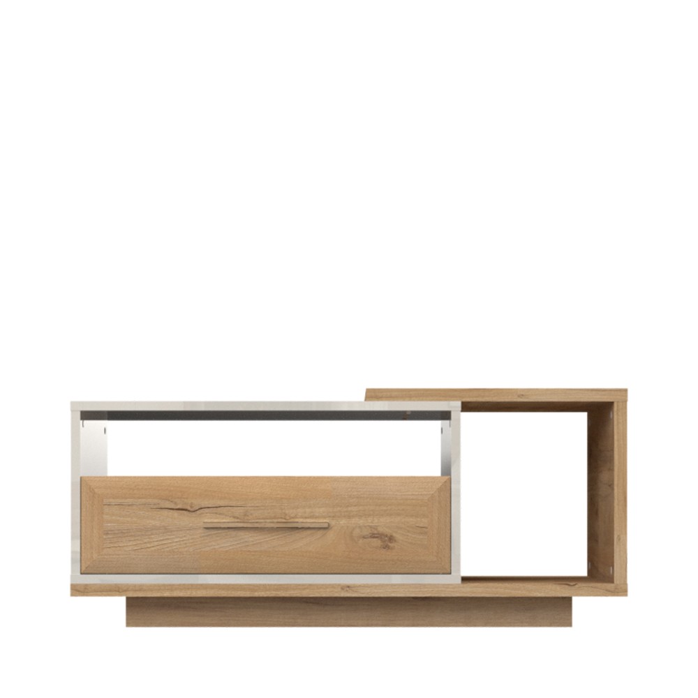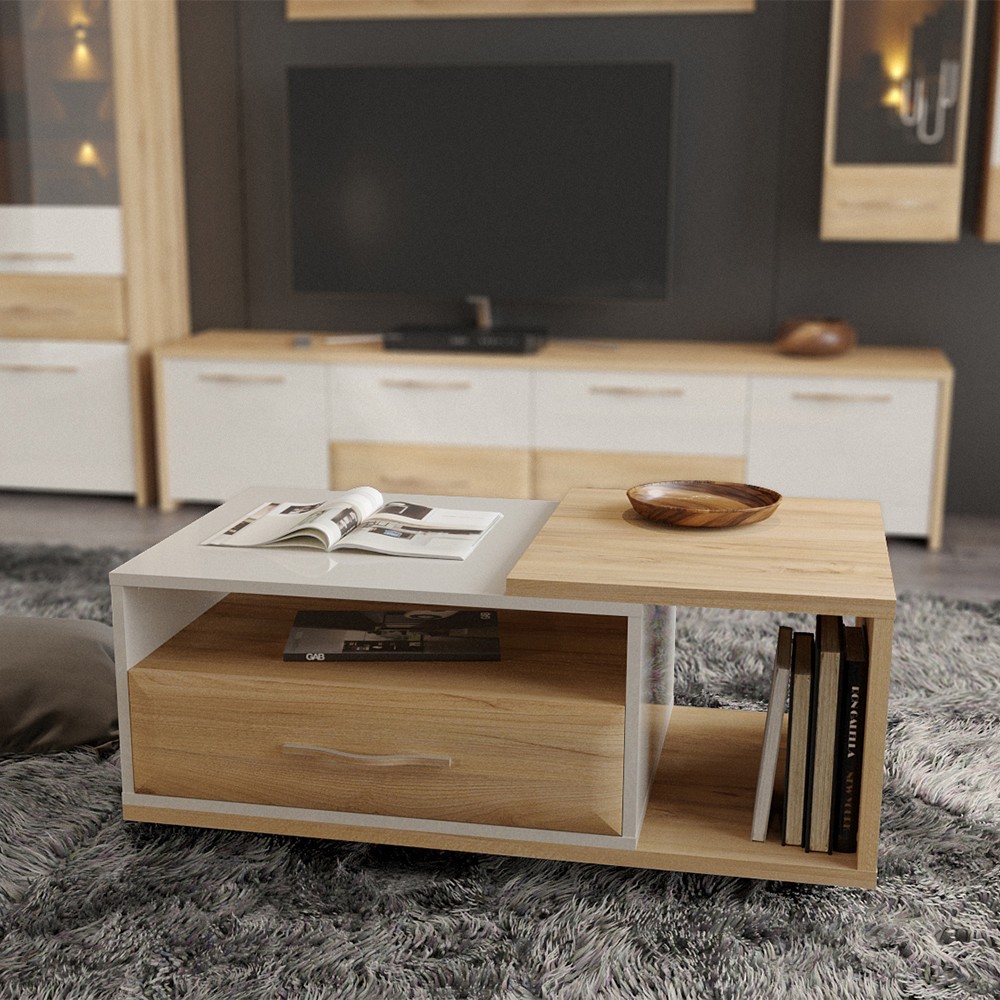 Funkcionalan i moderan klub stol za dnevni boravak iz kolekcije Gala, sa jednom ladicom. Prednja strana ladice izrađena je od profiliranog medijapana, presvučena folijom u dekoru pacifik orah. Ploča stola u kombinaciji UV laka visokog sjaja u bež boji i dekora pacfik orah. Klizači ladica s mekim zatvaranjem smanjuju trenje tijekom uporabe, imaju veću otpornost na habanje i osiguravaju maksimalnu dugovječnost u svakodnevnoj uporabi. Ukrasne kromirane ručke s aplikacijom u drvo dekoru pacifik orah. Skriveni kotačići omogućuju lakšu manipulaciju.