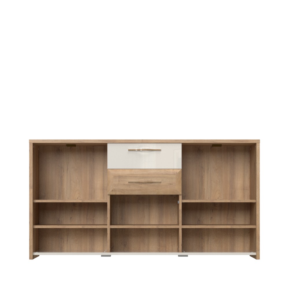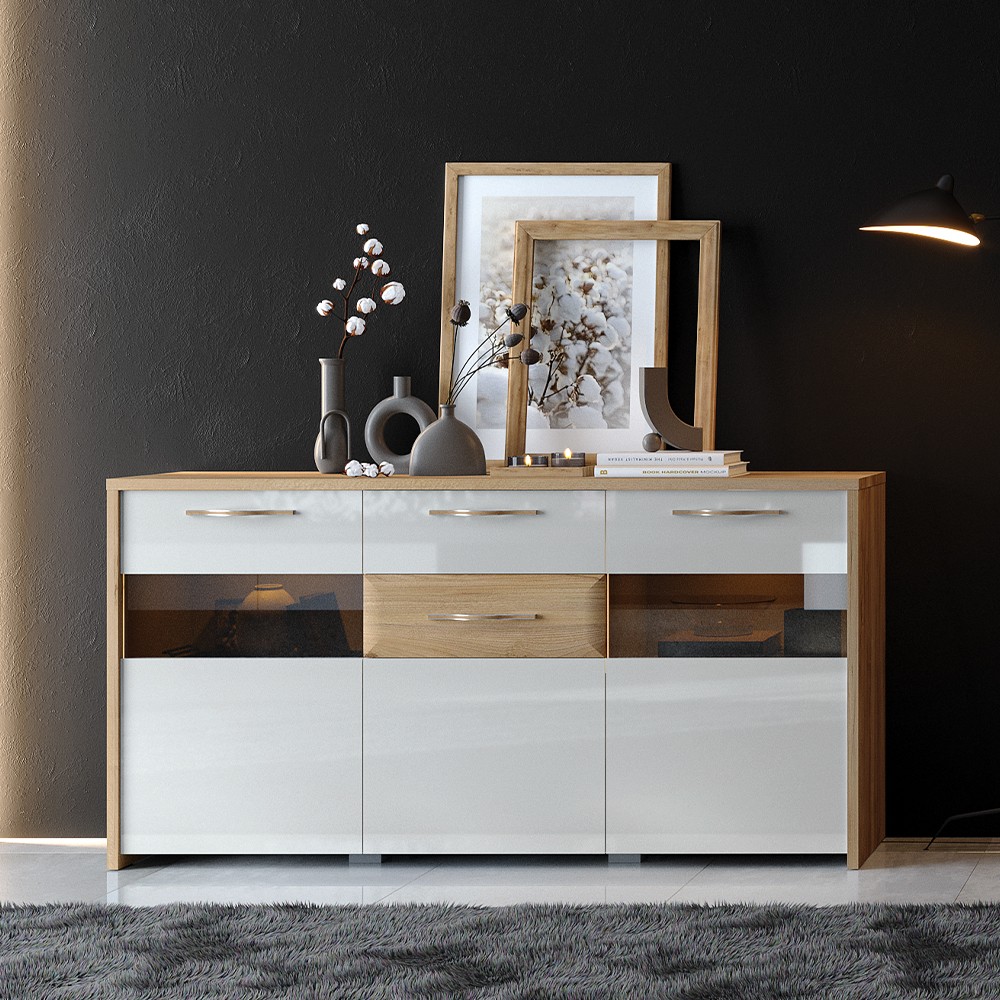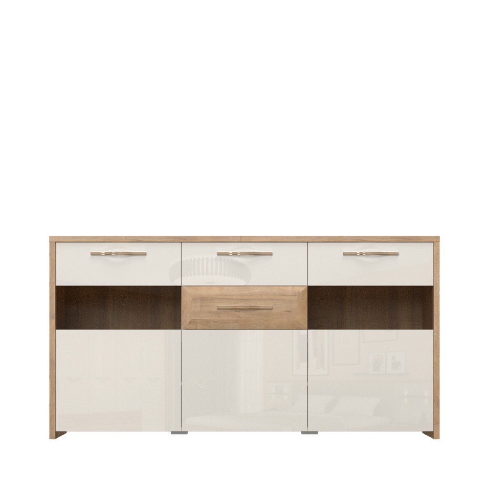 Funkcionalna trokrilna komoda za dnevni boravak iz kolekcije Gala, sa dva staklena, jednim punim krilom i dvije ladice. Krila i fronta gornje ladice su lakirane UV lakom u visokom sjaju, u toploj bež boji. Fronta donje ladice izrađena je od profiliranog medijapana, presvučena folijom u dekoru pacifik orah. Korpus elementa izrađen je od iverala u dekoru pacifik orah. Unutrašnjost elementa ima pet polica koje su uključene u cijenu elementa. Stopsol staklo i ambijentalna topla LED rasvjeta stvaraju ugodnu atmosferu u prostoru. Soft-close šarke omogućuju tiho zatvaranje krila što pruža dodatnu udobnost tijekom stalne uporabe. Soft-close klizači ladica smanjuju trenje tijekom uporabe, imaju veću otpornost na habanje i osiguravaju maksimalnu dugovječnost u svakodnevnoj uporabi. Ukrasne kromirane ručke s aplikacijom u drvo dekoru pacifik orah.