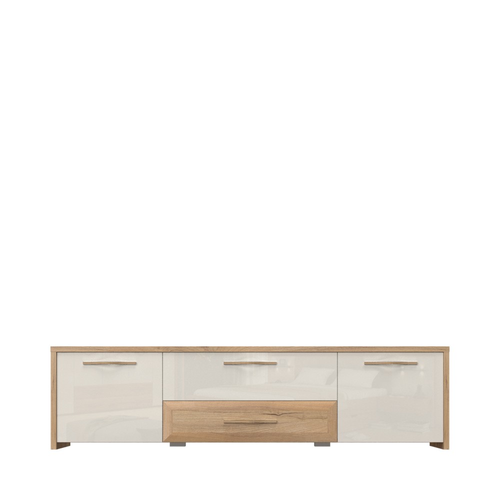TV komoda za dnevni boravak iz kolekcije Gala sa dva krila i dvije ladice. Krila i fronta gornje ladice lakirana UV lakom u visokom sjaju, u toploj bež boji. Fronta donje ladice izrađena je od profiliranog medijapana, presvučena folijom u dekoru pacifik orah. Korpus elementa izrađen je od iverala u dekoru pacifik orah. Unutrašnjost elementa ima dvije police koje su uključene u cijenu elementa. Soft-close šarke omogućuju tiho zatvaranje krila što pruža dodatnu udobnost tijekom stalne uporabe. Klizači ladica s mekim zatvaranjem smanjuju trenje tijekom uporabe, imaju veću otpornost na habanje i osiguravaju maksimalnu dugovječnost u svakodnevnoj uporabi. Ukrasne kromirane ručke s aplikacijom u drvo dekoru pacifik orah.