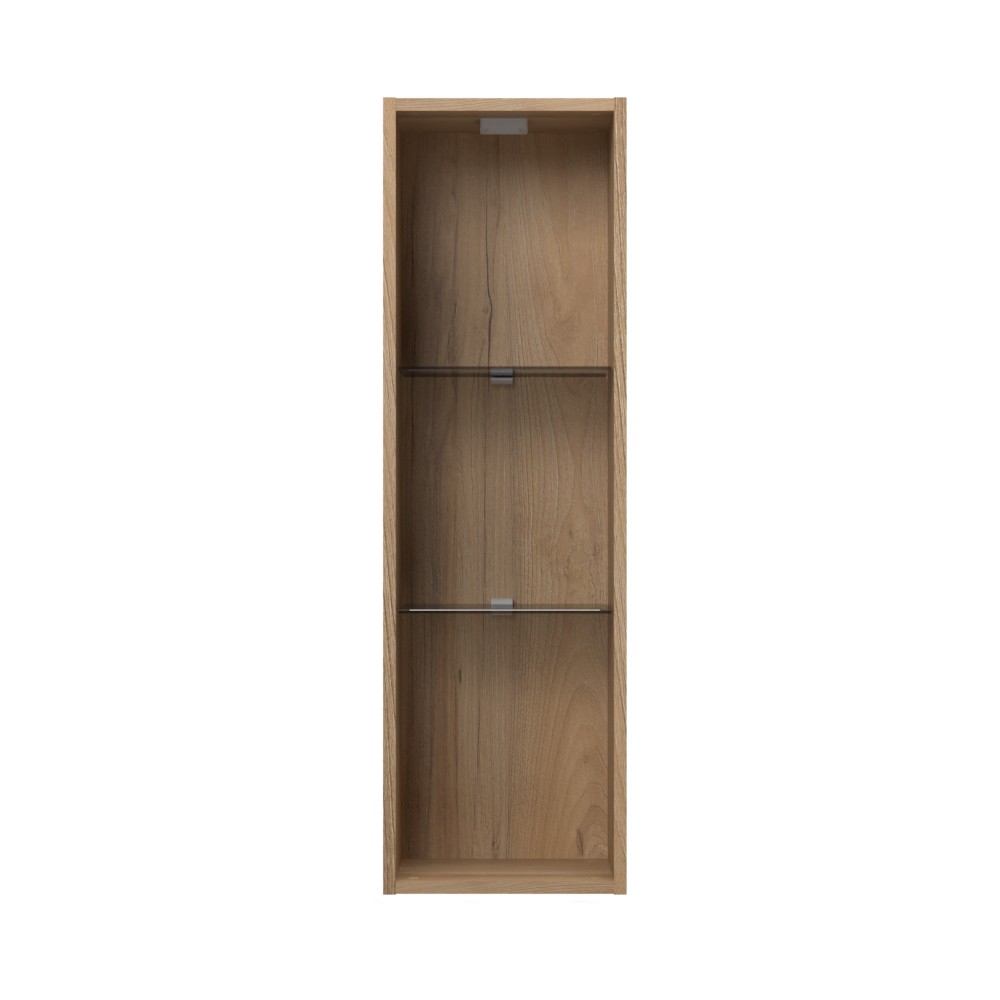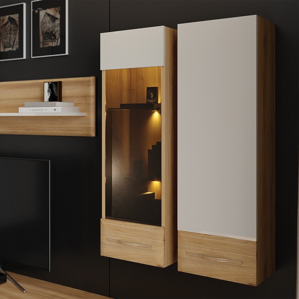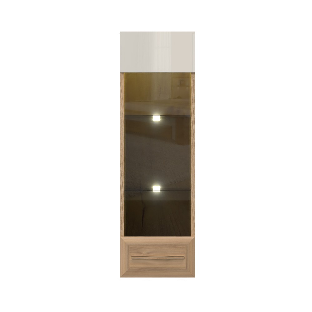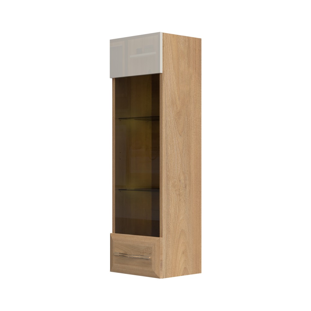 Viseća komoda za dnevni boravak iz kolekcije Gala sa jednim staklenim krilom. Krilo je lakirano UV lakom u visokom sjaju, u toploj bež boji. Korpus elementa izrađen je od iverala u dekoru pacifik orah. Unutrašnjost elementa ima dvije staklene unutarnje police koje su uključene u cijenu elementa. Stopsol staklo i LED rasvjeta u vitrini doprinose ugodnom ambijentu dnevnog boravka. Soft-close šarke omogućuju tiho zatvaranje krila što pruža dodatnu udobnost tijekom stalne uporabe. Ukrasne kromirane ručke s aplikacijom u drvo dekoru pacifik orah.