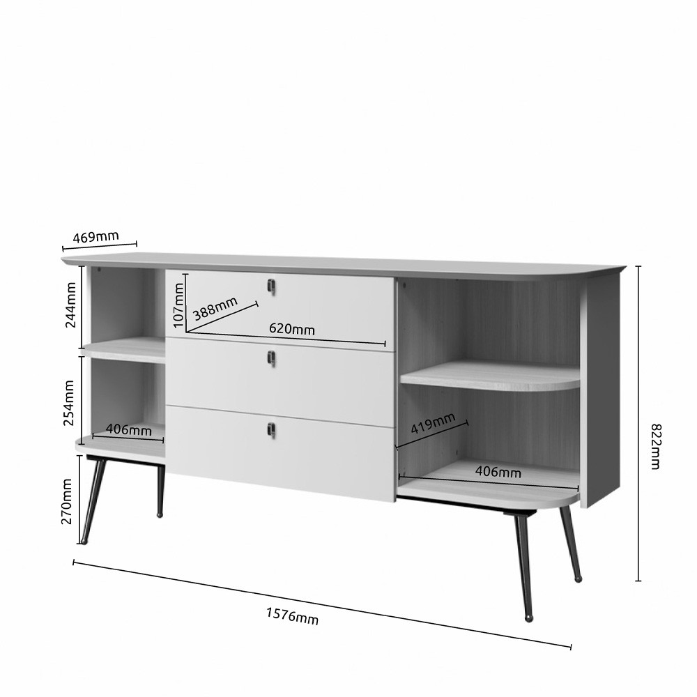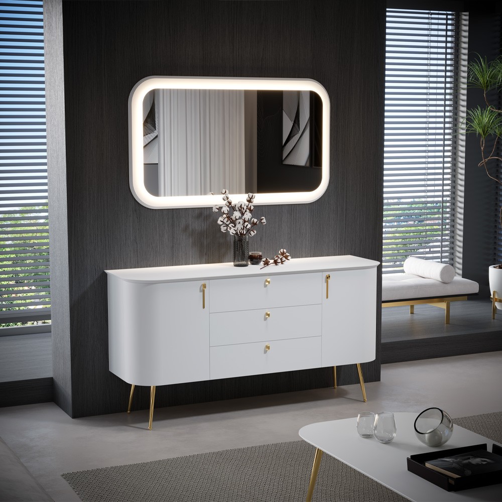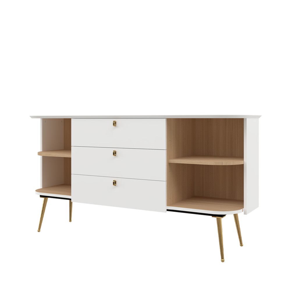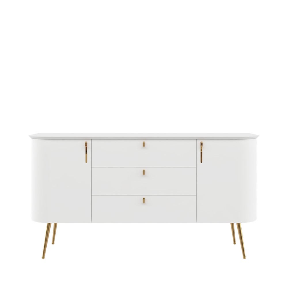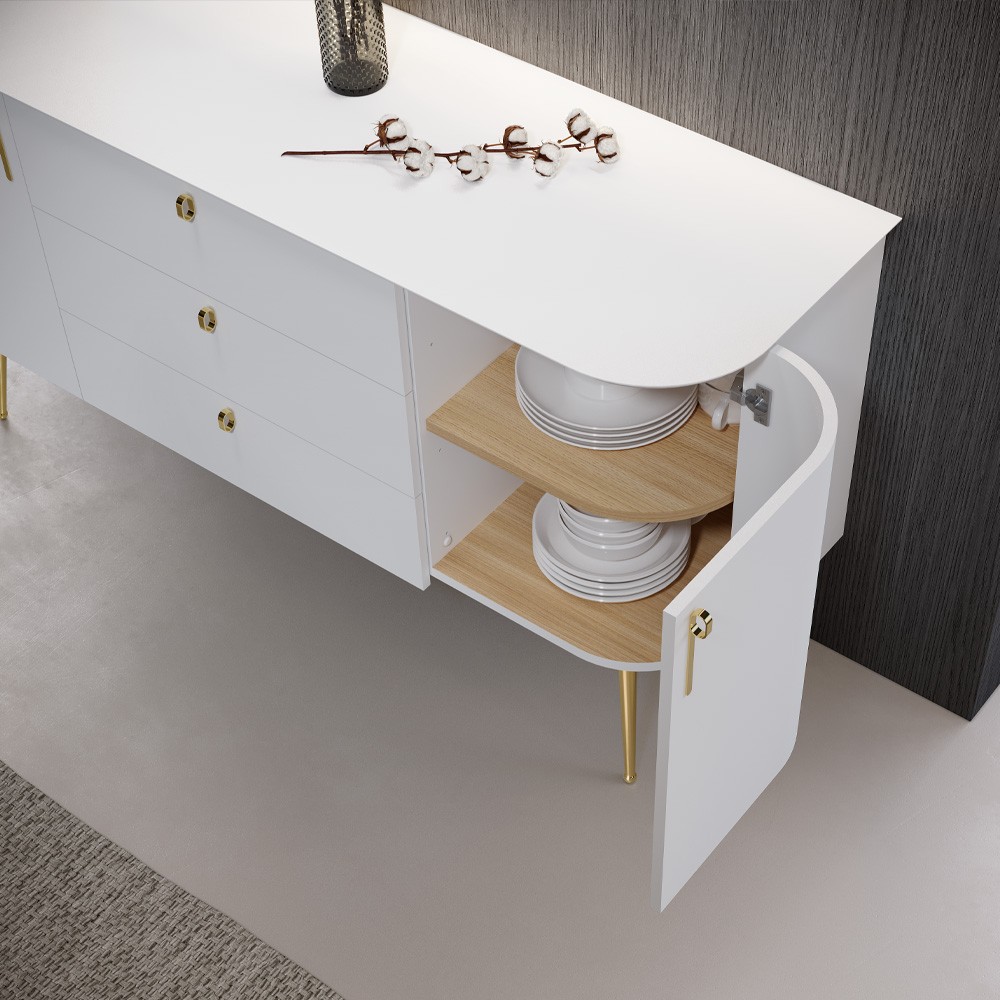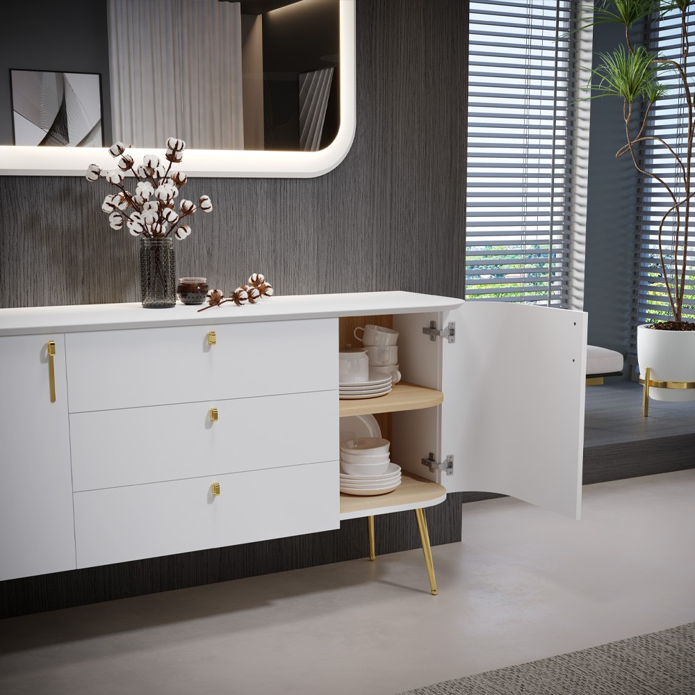 Komoda za dnevni boravak iz kolekcije Galet sa dva krila i tri ladice. Zaobljene fronte izrađene od prirodnog drvenog furnira. Krila i fronte lakirane UV lakom u bijeli soft mat dekor. Unutrašnjost elementa u dekoru furneo hrast. Unutrašnjost ladice u tekstil dekoru. Strop MDF, u dekoru bijeli soft mat UV lak. Stranice i pod od iverala, metalne ručke u neon gold dekoru. Metalne nogice u neon gold dekoru. Metalni okvir kao osnova elementa, soft-close šarke.