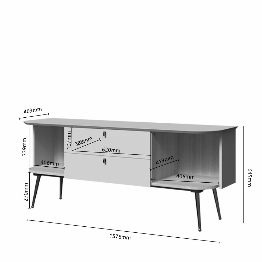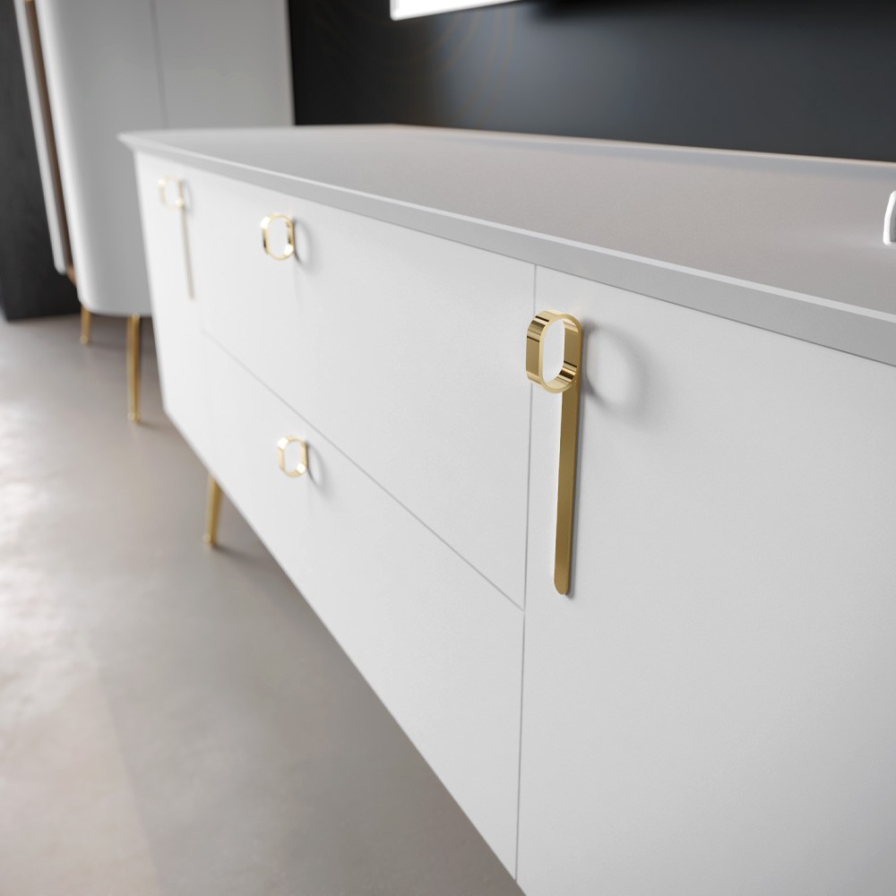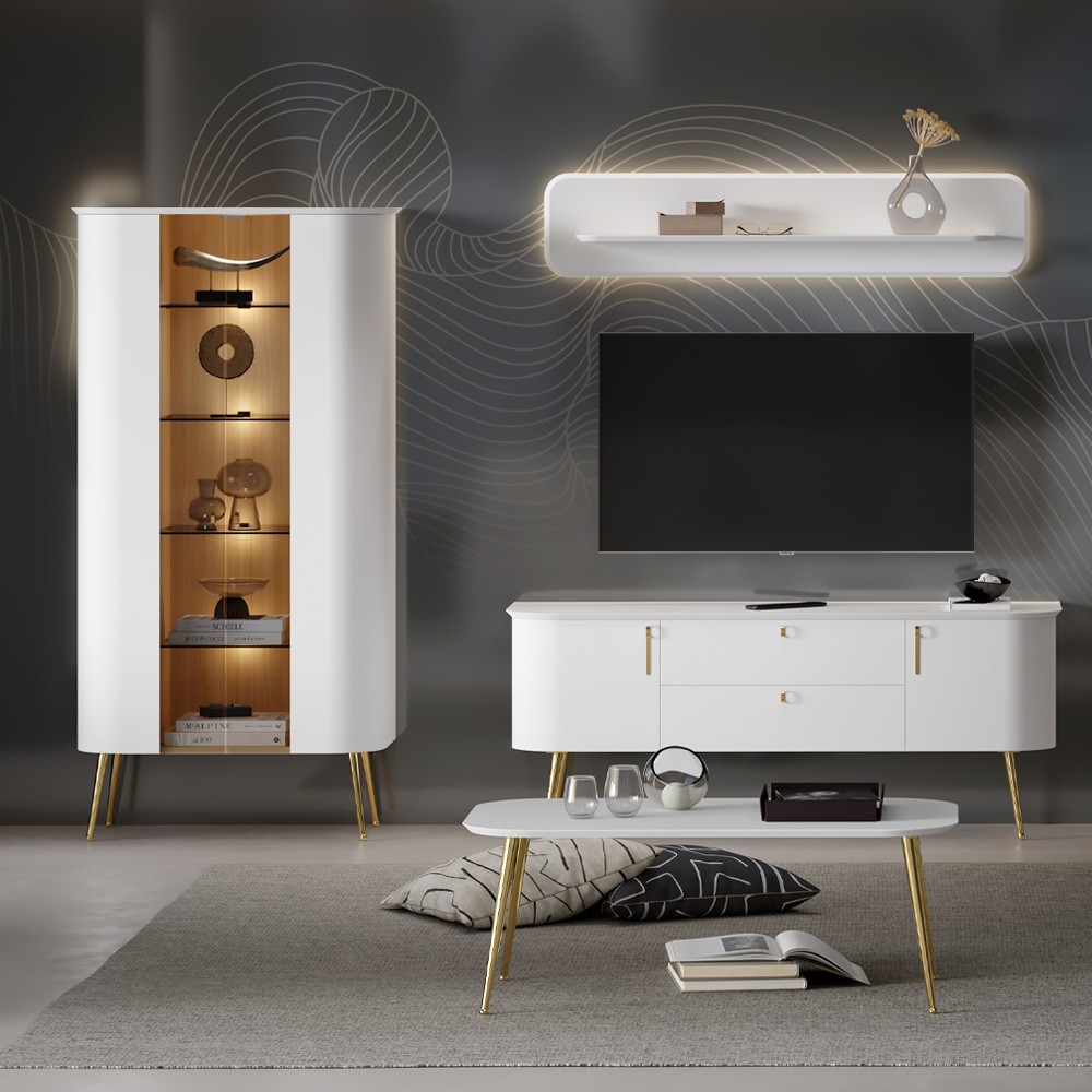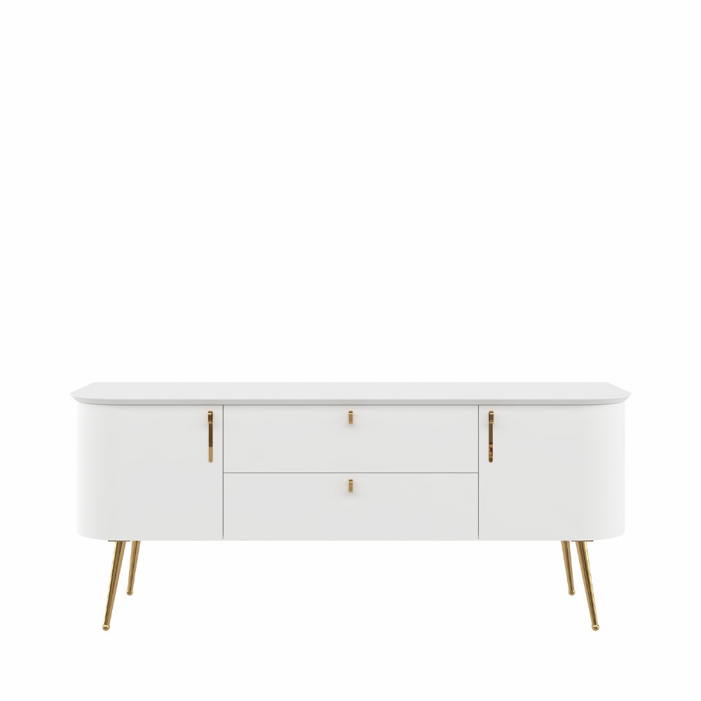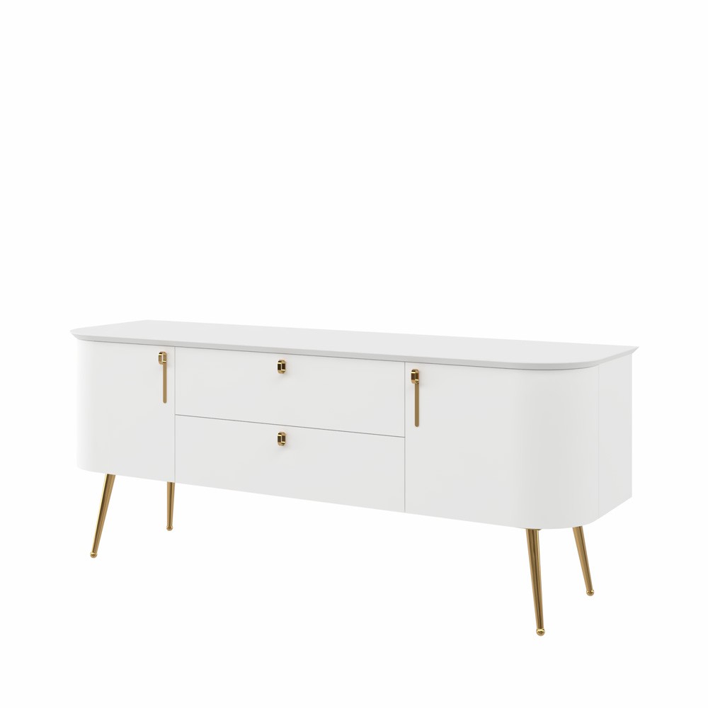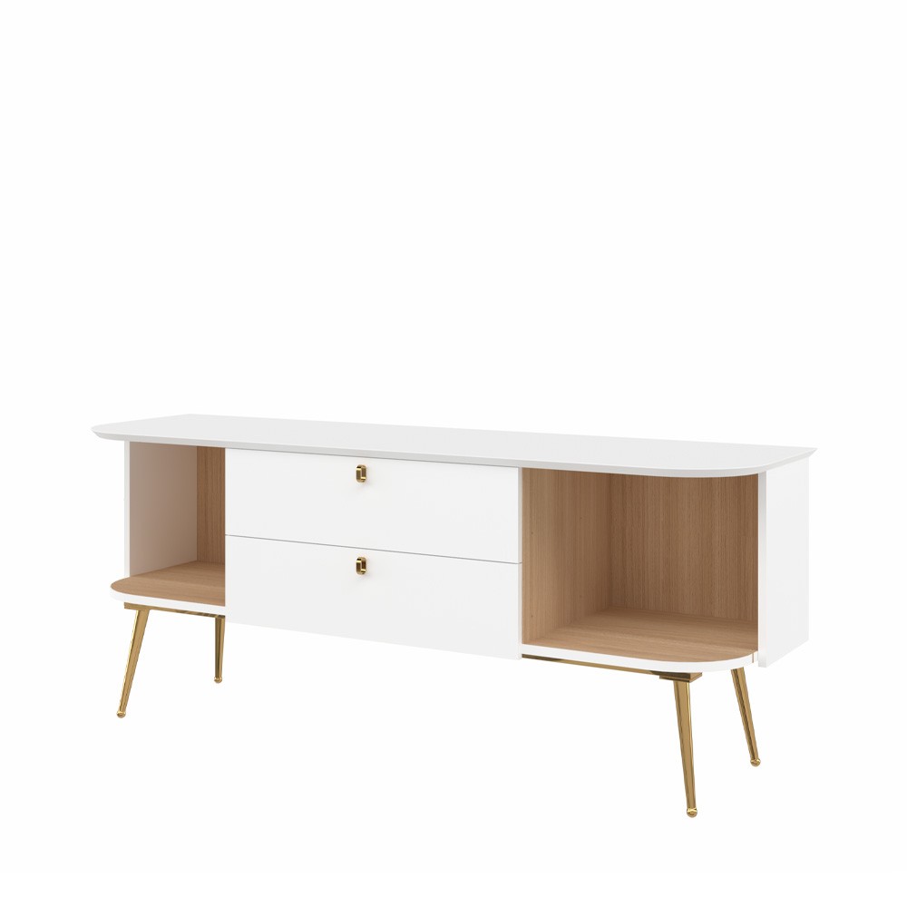 TV komoda za dnevni boravak iz kolekcije Galet sa dva krila i dvije ladice. Zaobljene fronte izrađene su od furnira od prirodnog drveta. Krila i fronte lakirani UV lakom u dekoru bijela soft mat. Unutrašnjost elementa u dekoru furneo hrast. Unutrašnjost ladica u tekstil dekoru. Strop MDF, u dekoru bijela soft mat UV lak. Stranice i pod od iverala. Metalne ručke u neon gold dekoru, metalne nogice u neon gold dekoru, metalni okvir kao osnova elementa, soft-close šarke.