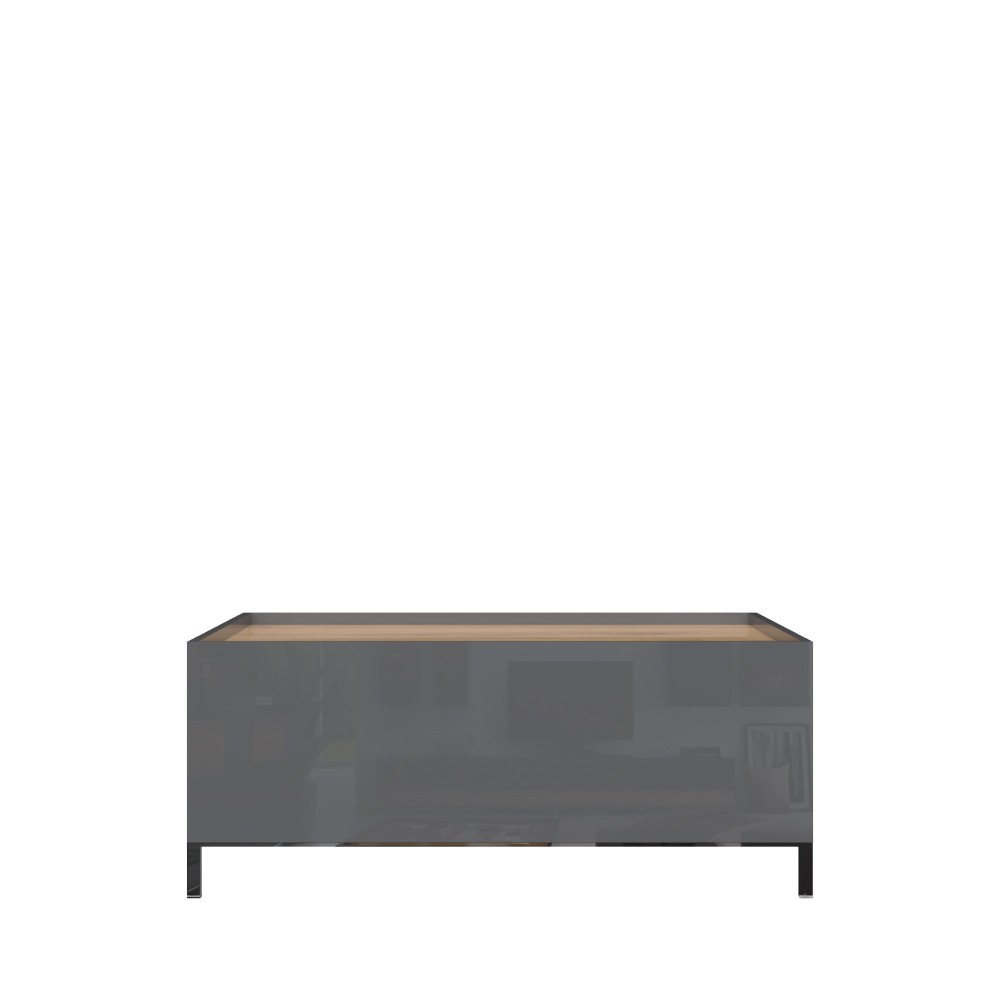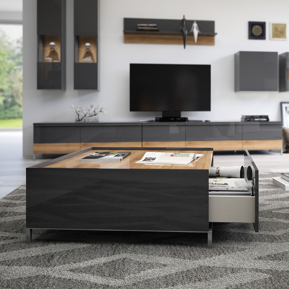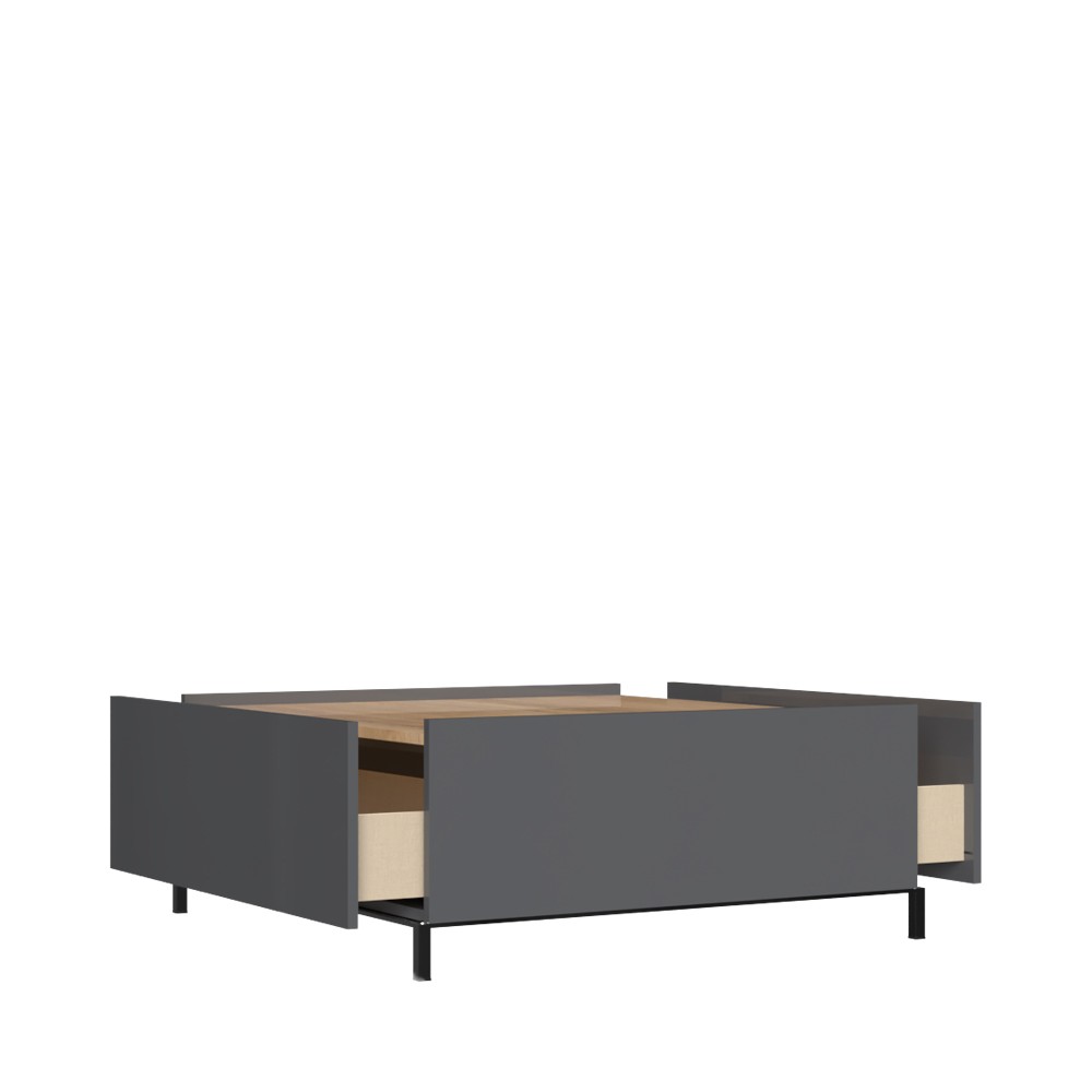Funkcionalan i moderan klub stol za dnevni boravak iz kolekcije Onyx, sa dvije ladice. Stranice stola i fronte ladica lakirane UV lakom visokog sjaja u atraktivnoj antracit boji. Ploča stola lakirana UV lakom u visokom sjaju u drvo dekoru pacifik orah. Soft-close klizači ladica s mekim zatvaranjem smanjuju trenje tijekom uporabe, imaju veću otpornost na habanje i osiguravaju maksimalnu dugovječnost u svakodnevnoj uporabi. Element ima kromirane elegantne nogice s konstrukcijom okvira.