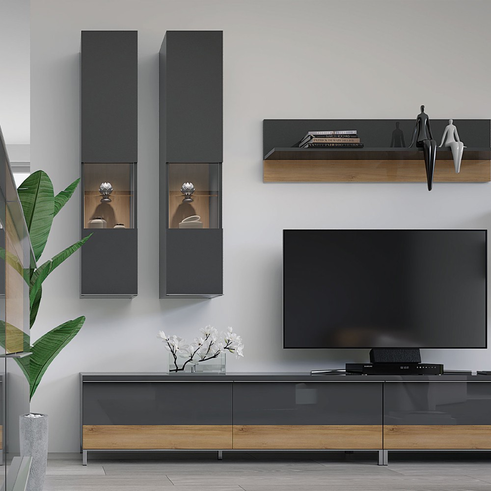 Viseća komoda za dnevni boravak iz kolekcije Onyx, sa jednim staklenim krilom, kompletno lakirana UV lakom. Vidljivi dijelovi elementa lakirani su visokosjajnim UV lakom u atraktivnoj antracit boji. Unutarnji dijelovi elementa su u toplom tekstil dekoru. Stopsol staklo i ambijentalna topla LED rasvjeta stvaraju ugodnu atmosferu u prostoru. Soft-close šarke omogućuju tiho zatvaranje krila što pruža dodatnu udobnost tijekom stalne uporabe. Zbog unutarnje police koja je dio standardne opreme vrlo je praktična. Element ima ukrasnu kromiranu ručku.