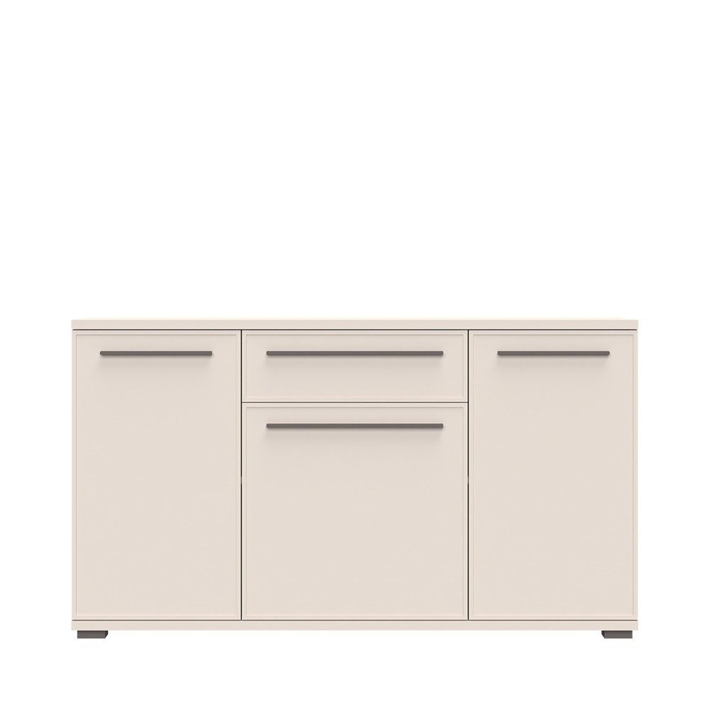 Funkcionalna komoda iz kolekcije Opera. Korpus i fronta lakirani soft mat UV lakom u boji kašmira. Unutrašnjost u textil dekoru. Fronta s ukrasnim profiliranim MDF okvirom. Tri krila i jedna ladica, soft-close šarke. Skriveni klizači soft-close na ladicama. Podesive nogice, pod i strop debljine 25 mm. Ručke u boji cortado braon mat. Moderna i elegantna komoda za dnevnu sobu.
