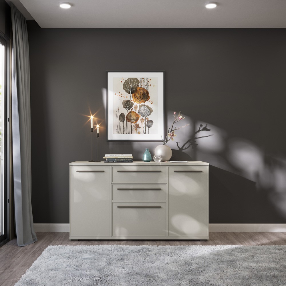 Funkcionalna komoda iz kolekcije Opera. Korpus i fronta lakirani soft mat UV lakom u boji kašmira. Unutrašnjost u textil dekoru, fronta s ukrasnim profiliranim MDF okvirom. Tri krila i dvije ladice, soft-close šarke, skriveni klizači soft-close na ladicama. Podesive nogice, pod i strop debljine 25 mm. Ručke u boji cortado braon mat. Moderna i elegantna komoda za dnevnu sobu.