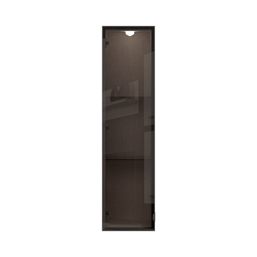 Viseća komoda iz kolekcije Opera. Korpus lakiran soft mat UV lakom u boji kašmira. Unutrašnjost u textil dekoru. Fronta sa aluminijskim okvirom sa parsol staklom. Soft-close šarke, pod i strop debljine 25 mm. Montira se samostalno ili s drugim visećim elementima. LED rasvjeta.