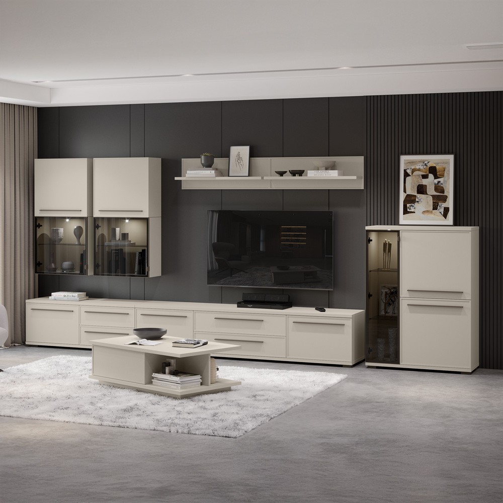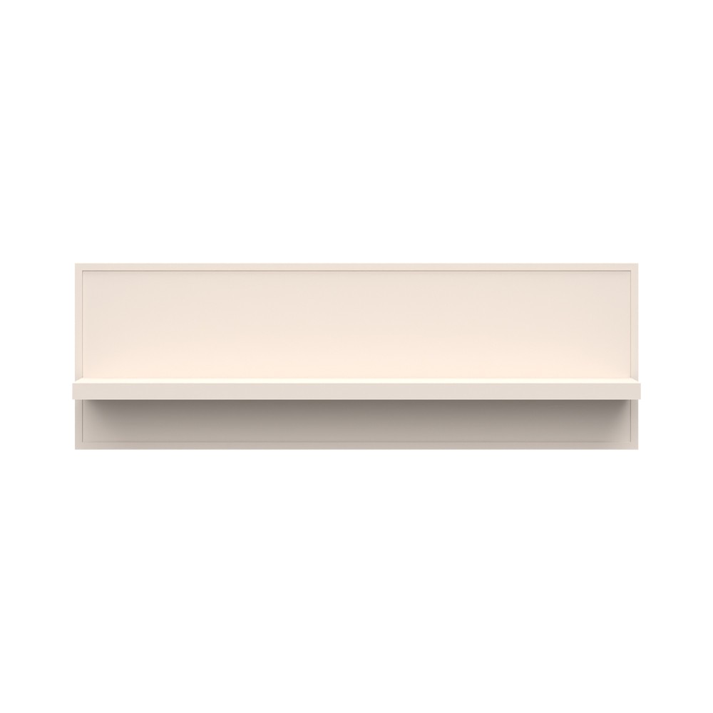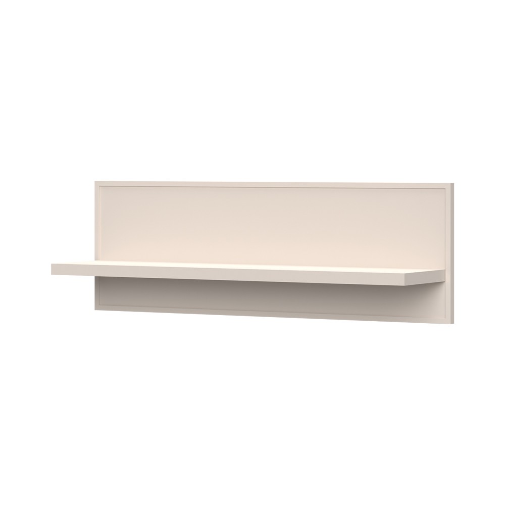 Viseća polica potpuno lakirani soft mat UV lakom u kašmir dekoru, širine 90 cm. Korpus s ukrasnim profiliranim MDF okvirom. Montira se samostalno ili s drugim visećim elementima.