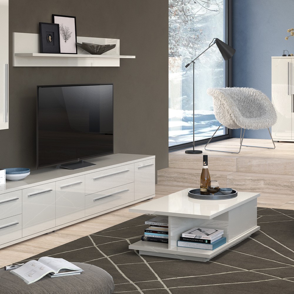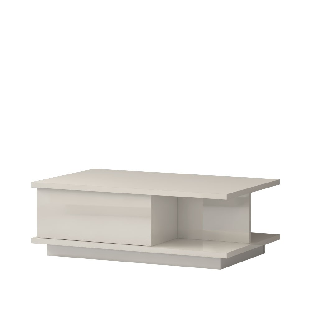 Funkcionalan i moderan klub stol iz kolekcije namještaja Piano, s jednom ladicom fronta i kompletan korpus elementa lakirani su UV lakom visokog sjaja, u toploj bež ili kristalno bijeloj boji. Unutarnji dijelovi korpusa su u bijeloj boji. Klub stol ima kotačiće za lakše rukovanje i klizače s usporivačima na ladicama.
