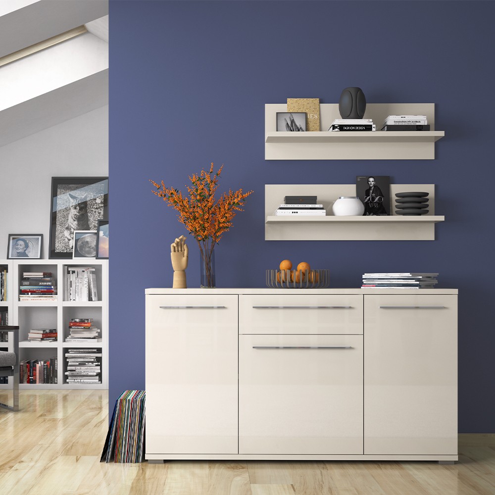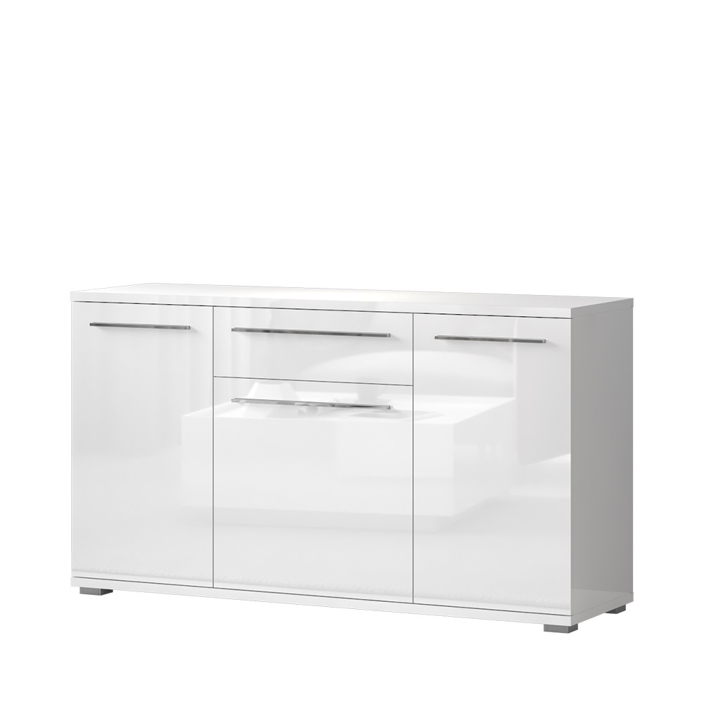 Funkcionalna komoda iz kolekcije namještaja Piano s tri puna krila i jednom ladicom, dizajnirana u geometrijskim oblicima. Fronte, stranice i strop elementa lakirani su UV lakom u visokom sjaju, u toploj bež ili kristalno bijeloj boji. Unutarnji dijelovi korpusa su u bijeloj boji. Soft-close šarke i klizači omogućuju tiho zatvaranje krila i ladica, što daje dodatnu udobnost tijekom stalne uporabe. Zbog tri unutarnje police koje su dio standardne opreme vrlo je praktična. Moderna, elegantna i funkcionalna komoda za dnevni boravak.