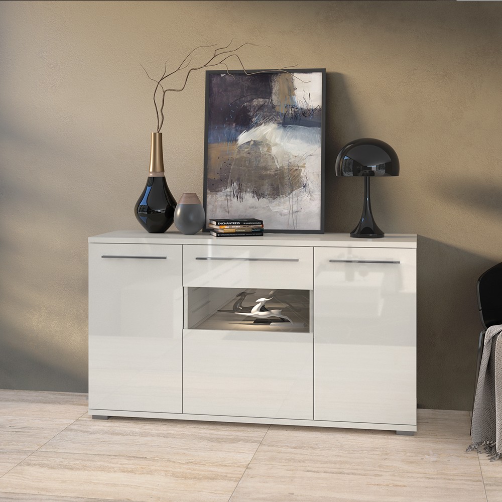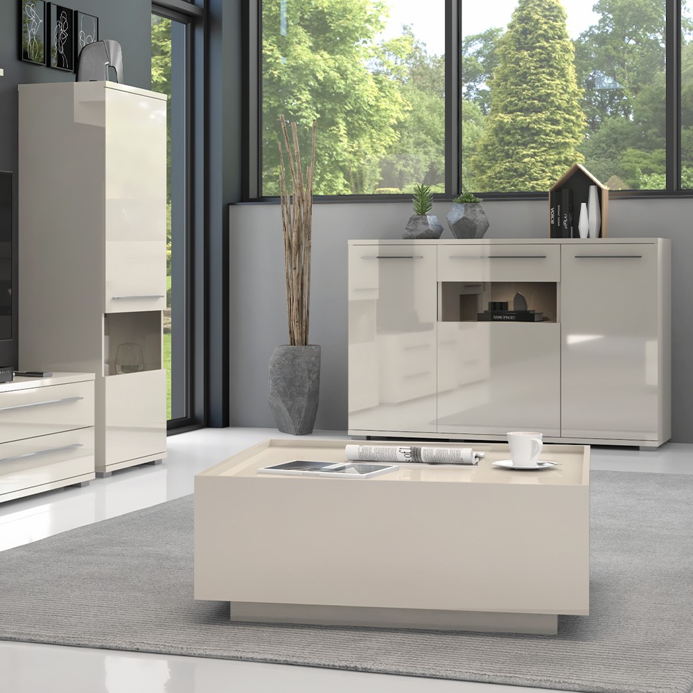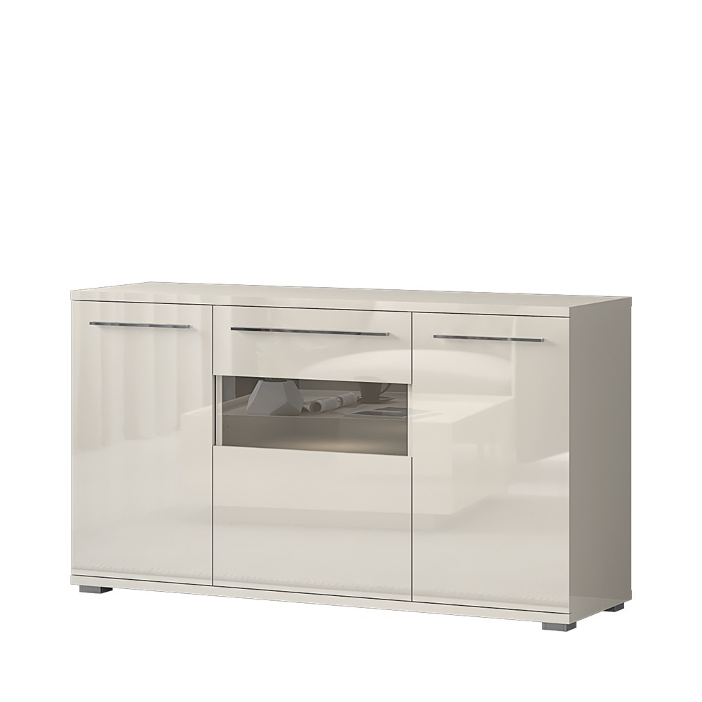 Funkcionalna komoda iz kolekcije namještaja Piano s dva puna i jednim staklenim krilom, dizajnirana u geometrijskim oblicima. Fronte, stranice i strop elementa lakirani su UV lakom u visokom sjaju, u toploj bež ili kristalno bijeloj boji. Unutarnji dijelovi korpusa su u bijeloj boji. Soft-close šarke i omogućuju tiho zatvaranje krila, što daje dodatnu udobnost tijekom stalne uporabe. Zbog četiri unutarnje police koje su dio standardne opreme vrlo je praktična. Stopsol staklo i LED rasvjeta u komodi doprinose ugodnom ambijentu Vašeg dnevnog boravka. Moderna, elegantna i funkcionalna komoda za dnevni boravak.