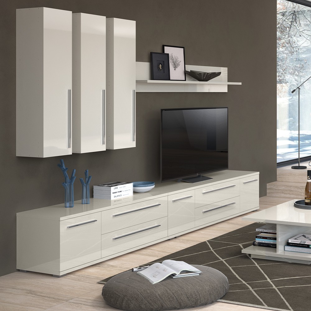 TV komoda za dnevni boravak iz kolekcije namještaja Piano, pogodna za male prostore, jednokrilna sa dvije ladice. Fronte, stranice i strop elementa lakirani su UV lakom visokog sjaja, u toploj bež ili kristalno bijeloj boji. Unutarnji dijelovi su u bijeloj boji. Soft-close šarke i klizači omogućuju tiho zatvaranje krila i ladica, što pruža dodatnu udobnost tijekom stalne uporabe. Moderna, elegantna i funkcionalna TV komoda za dnevni boravak.