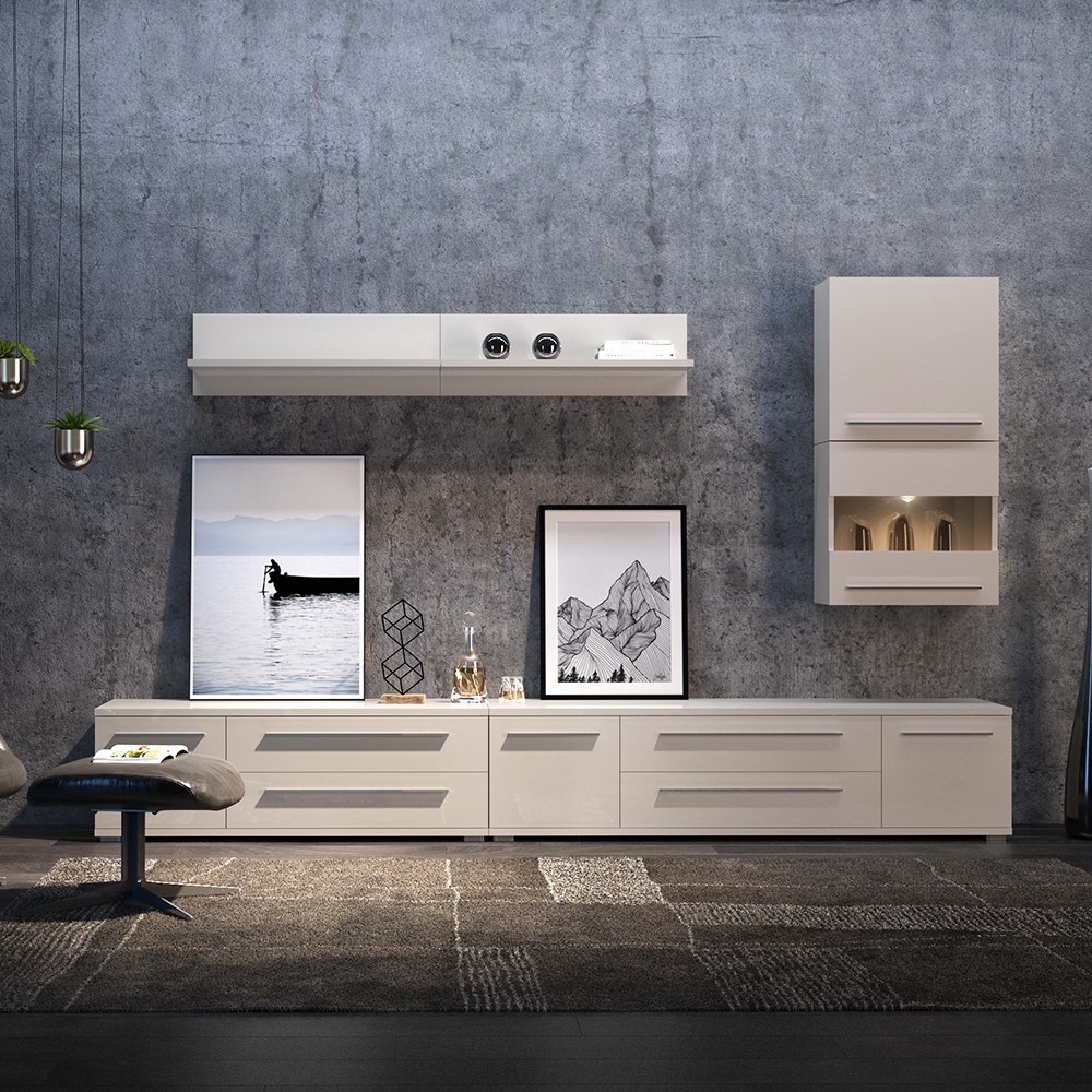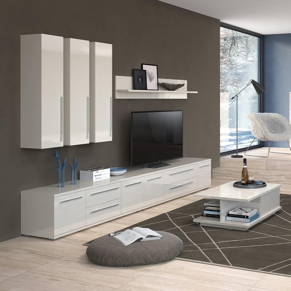 TV komoda za dnevni boravak iz kolekcije namještaja Piano sa dva krila i dvije ladice, kompletno lakirana najnovijom tehnologijom UV lakiranja. Fronte, stranice i strop elementa lakirani su UV lakom visokog sjaja, u toploj bež ili kristalno bijeloj boji. Unutarnji dijelovi korpusa su u bijeloj boji. Soft-close šarke i klizači omogućuju tiho zatvaranje krila i ladica, što pruža dodatnu udobnost tijekom stalne uporabe. Moderna, elegantna i funkcionalna TV komoda za dnevni boravak.