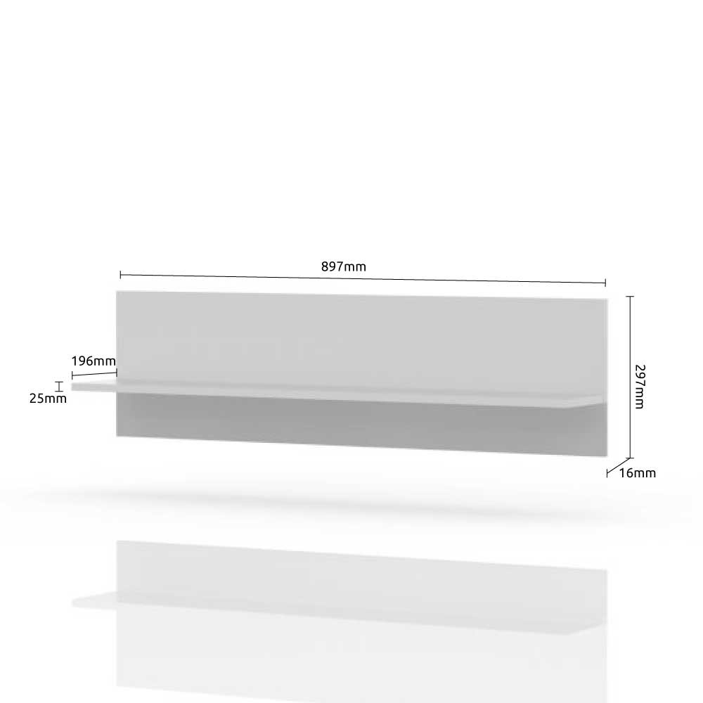 Viseća polica širine 90 cm kompletno lakirana visokosjajnim UV lakom najnovije tehnologije. Element je opremljen okovom za vješanje na zid.