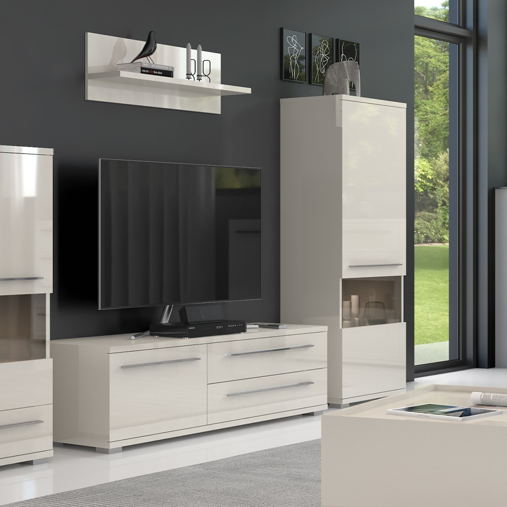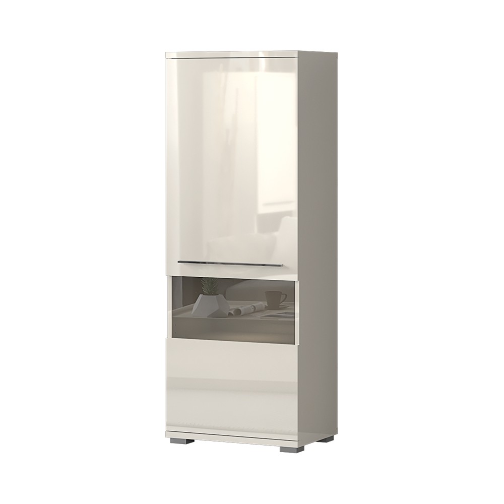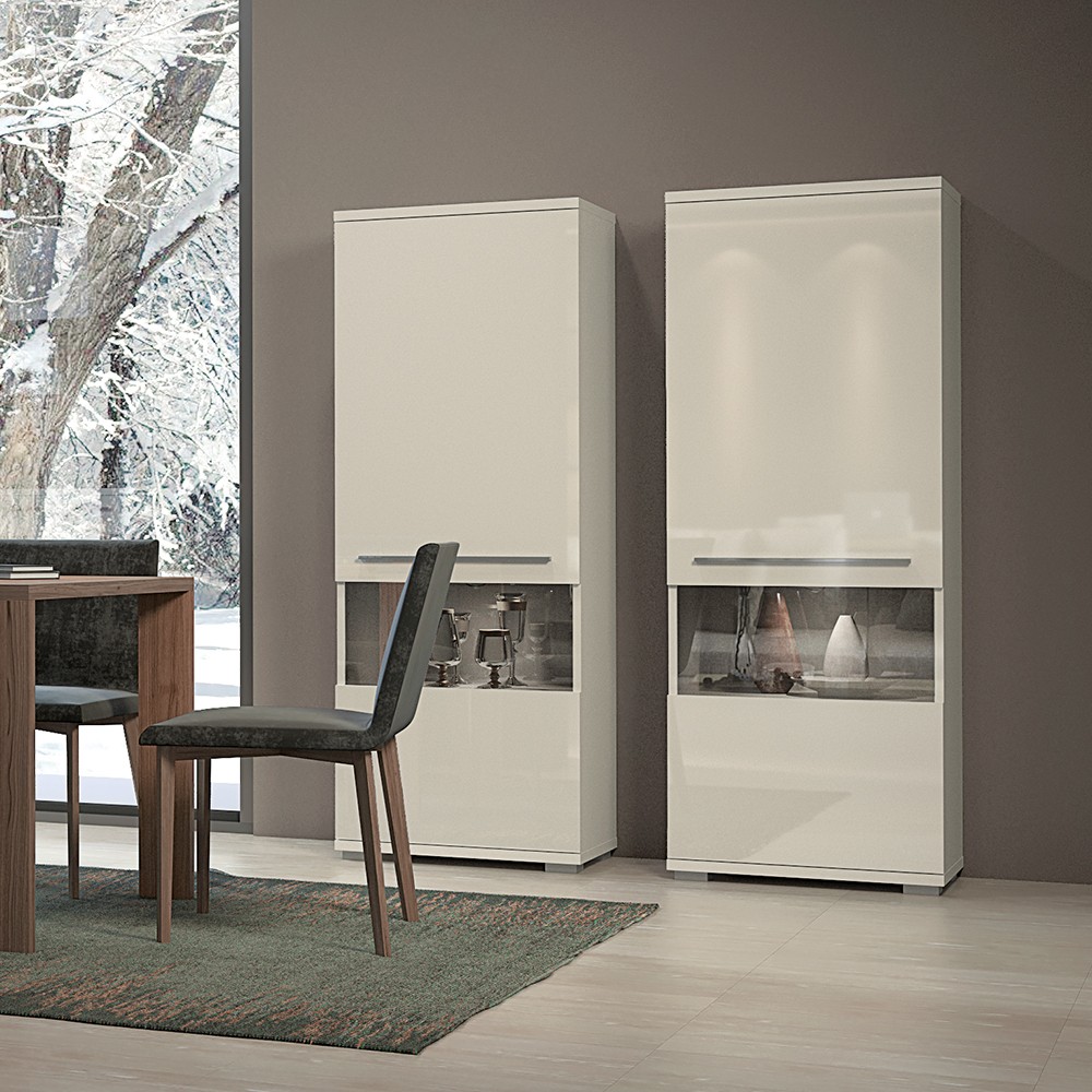 Funkcionalna vitrina iz kolekcije namještaja Piano s jednim staklenim krilom, dizajnirana u geometrijskim oblicima. Fronte, stranice i strop elementa lakirani su UV lakom visokog sjaja, u toploj bež ili kristalno bijeloj boji. Unutarnji dijelovi korpusa su u bijeloj boji, soft-close šarke omogućuju tiho zatvaranje krila što pruža dodatnu udobnost tijekom stalne uporabe. Zbog četiri unutarnja pretinca koji su dio standardne opreme vrlo je praktična. Stopsol staklo i led rasvjeta u vitrini doprinose ugodnom ambijentu Vašeg dnevnog boravka. Konstrukcija vitrine omogućuje otvaranje vrata na lijevu ili desnu stranu po vašem izboru. Moderna, elegantna i prije svega funkcionalna vitrina za dnevni boravak.