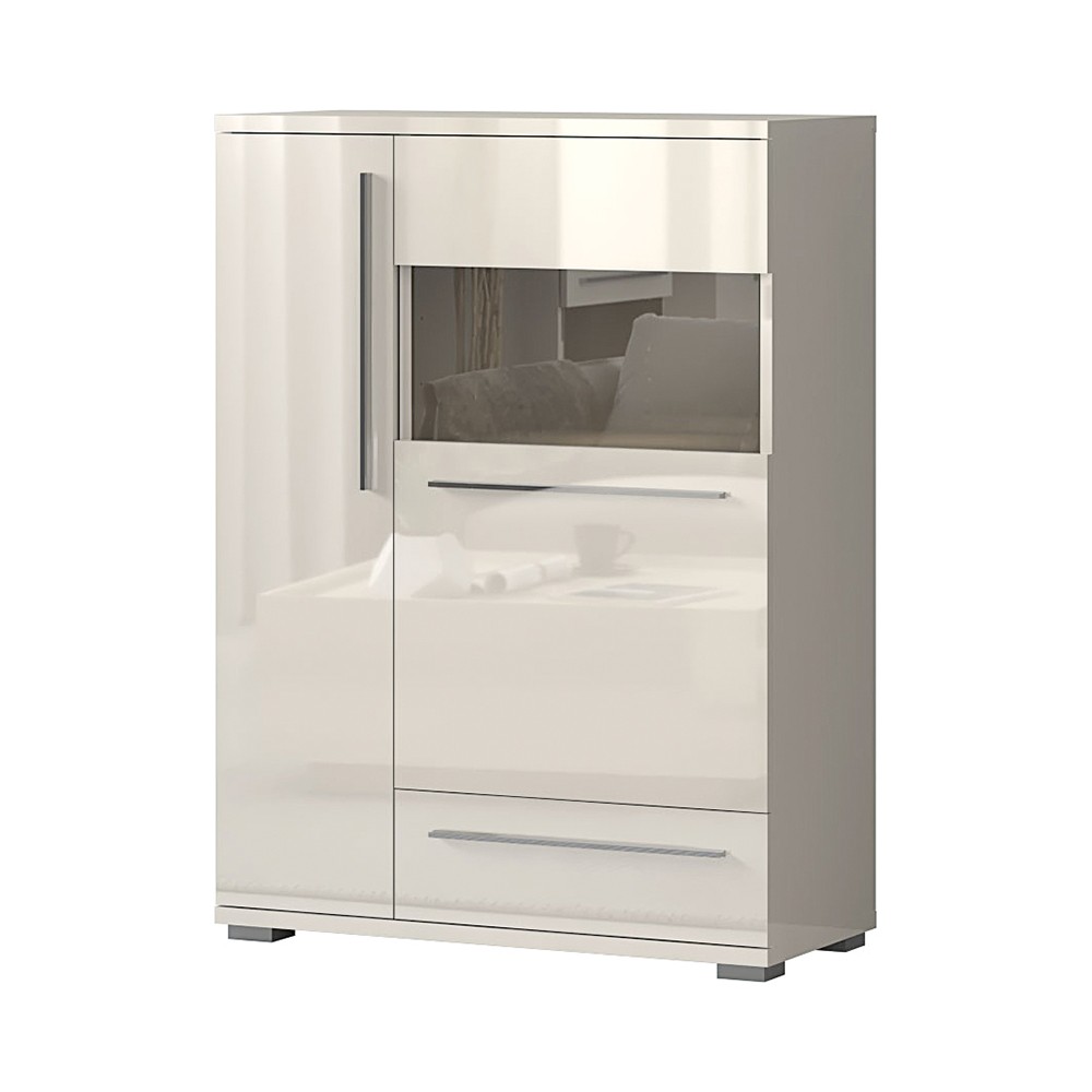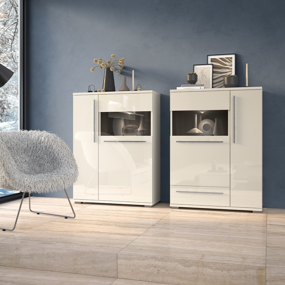 Funkcionalna vitrina sa jednim punim i jednim staklenim krilom i jednom ladicom, dizajnirana u geometrijskom obliku. Fronte, stranice i strop elementa lakirani su UV lakom visokog sjaja, u toploj bež ili kristalno bijeloj boji. Unutarnji dijelovi korpusa su u bijeloj boji. Soft-close šarke i klizači omogućuju tiho zatvaranje krila i ladica, što pruža dodatnu udobnost tijekom stalne uporabe. Zbog pet unutarnjih polica koje su dio standardne opreme vrlo je praktična. Stopsol staklo i led rasvjeta u vitrini doprinose ugodnom ambijentu Vašeg dnevnog boravka. Konstrukcija vitrine omogućuje otvaranje vrata na lijevu ili desnu stranu po Vašem izboru. Moderna, elegantna i prije svega funkcionalna vitrina za dnevni boravak.