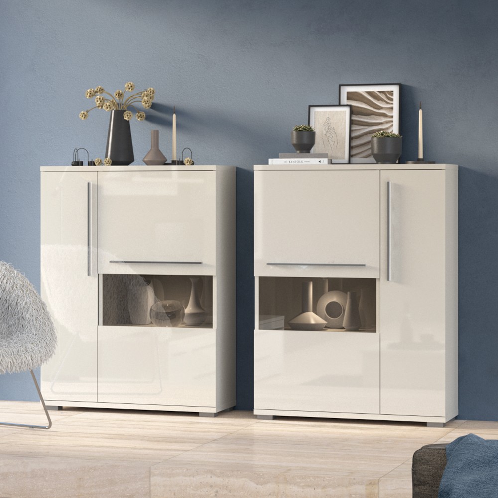 Funkcionalna vitrina sa jednim punim krilom i jednim sa staklenim detaljem, dizajnirana u geometrijskim formama. Fronte, stranice i strop elementa lakirani su UV lakom visokog sjaja, u toploj bež ili kristalno bijeloj boji. Unutarnji dijelovi korpusa su u bijeloj boji. Soft-close šarke i klizači omogućuju tiho zatvaranje krila i ladica, što daje dodatnu udobnost tijekom stalne uporabe. Zbog pet unutarnjih pretinaca koji su dio standardne opreme vrlo je praktična. Stopsol staklo i LED rasvjeta u vitrini doprinose ugodnom ambijentu Vašeg dnevnog boravka. Konstrukcija vitrine omogućuje otvaranje vrata na lijevu ili desnu stranu po vašem izboru. Moderna, elegantna i prije svega funkcionalna vitrina za dnevni boravak.