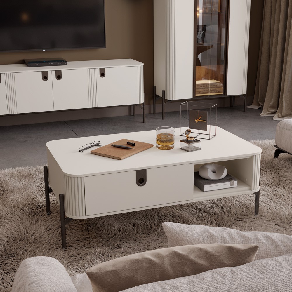 Klub stol za dnevni boravak iz kolekcije Rondo. Ladica stola s mehanizmom za lagano zatvaranje. Unutrašnjost ladice u textil dekoru. Dvostruko ojačani strop i pod od iverala u kašmir mat UV lak dekoru. Stranice i fronte ladica izrađene od iverala, lakirane u kašmir mat UV lak dekoru. Ukrasne reljefne letvice od MDF-a. Ručke i nogice u dekoru midnight copper. Klizači za soft-close zatvaranje.