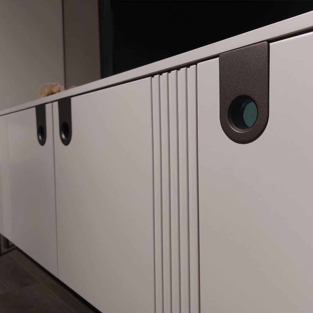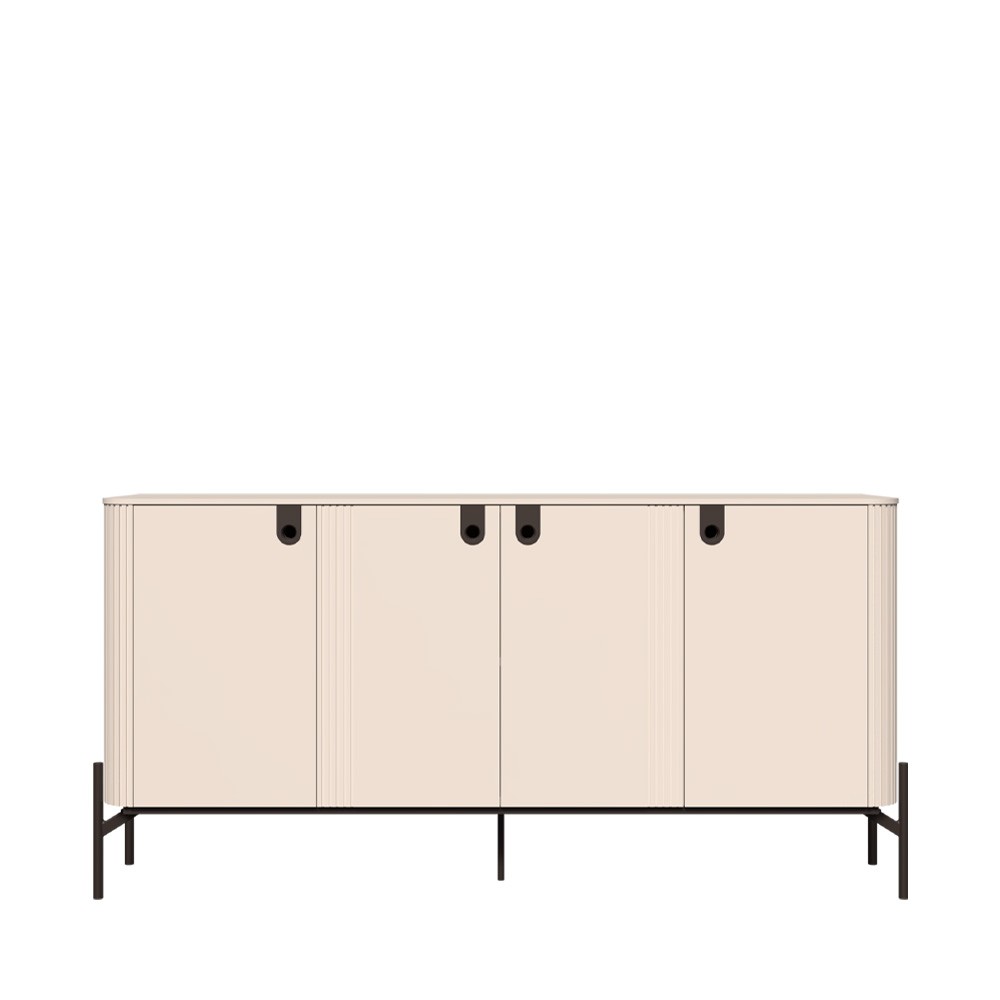 Komoda za dnevni boravak iz kolekcije Rondo sa četiri krila. Četiri krila, fronte lakirane UV lakom u kašmir mat dekoru. Unutrašnjost elementa u textil dekoru. Dvostruko ojačani stropni element u iveralu, u dekoru kašmir mat UV lak. Stranice i pod izrađeni od iverala, u dekoru kašmir mat UV lak. Ukrasne reljefne letvice od MDF-a. Metalne ručke i nogice u dekoru midnight copper. Metalni okvir kao osnova elementa. Soft-close šarke.