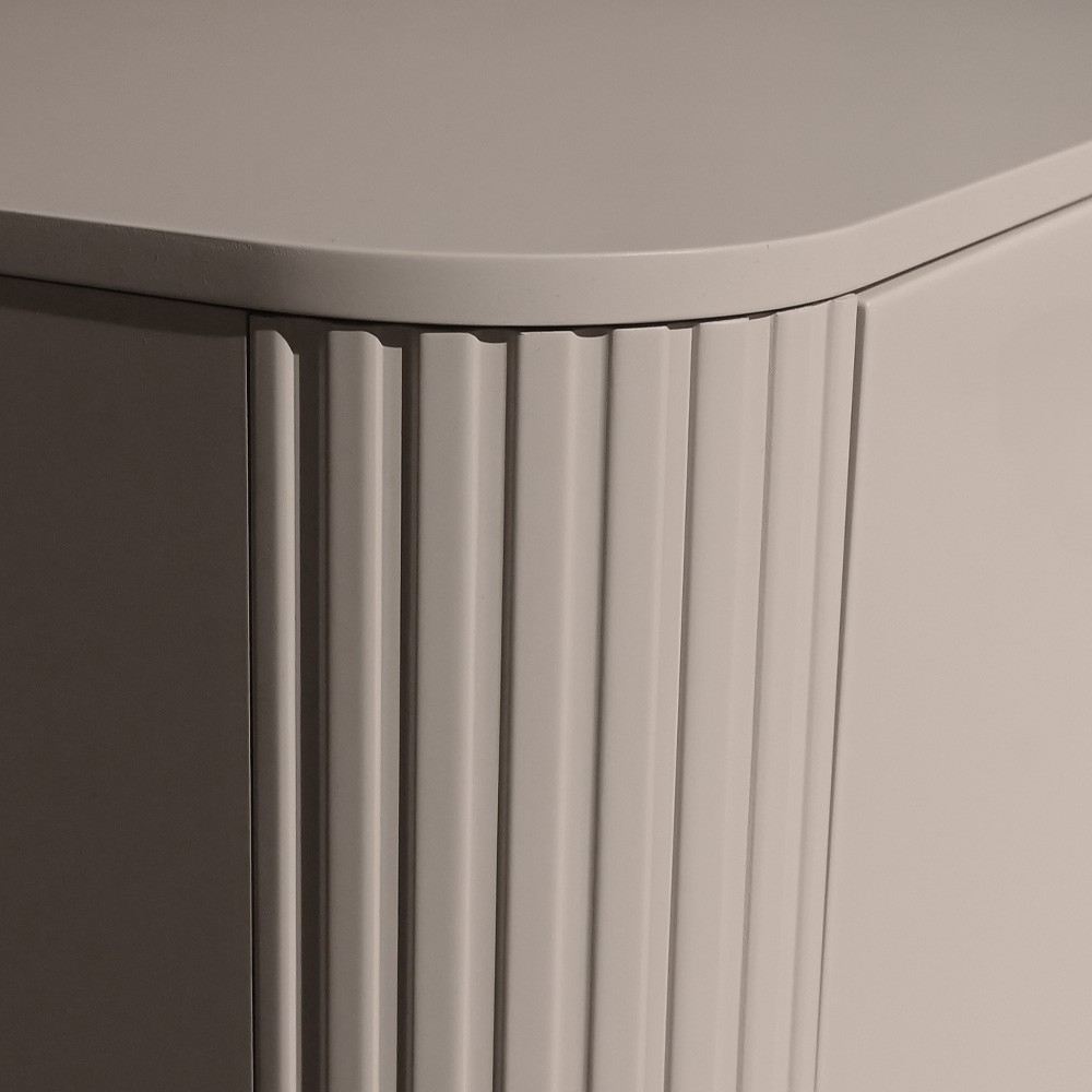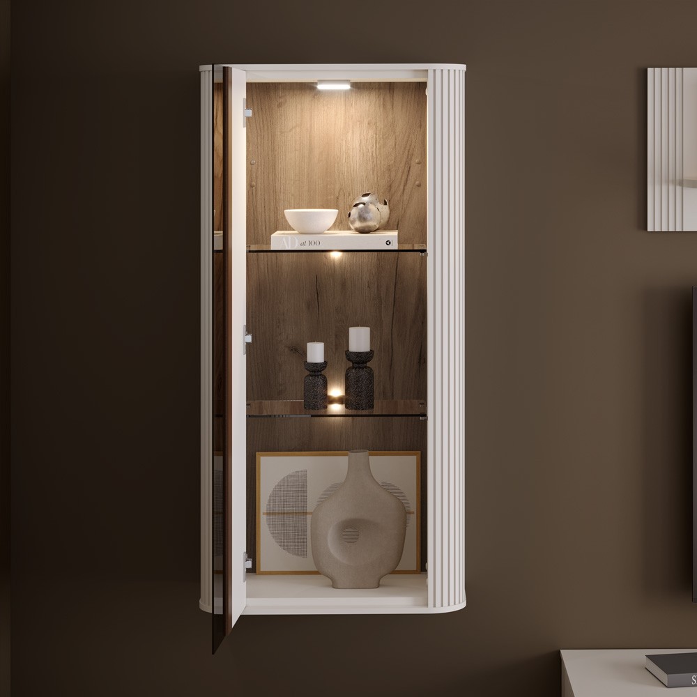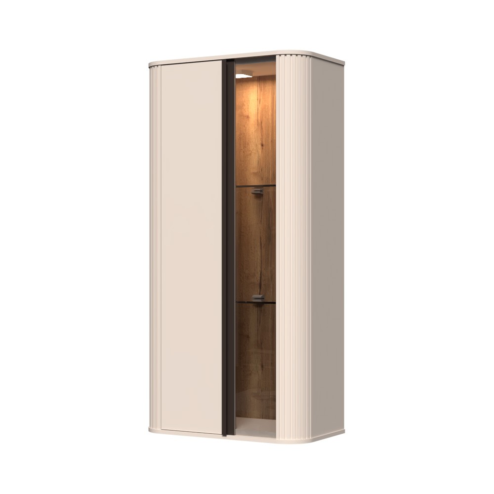Jednokrilna viseća komoda za dnevni boravak iz kolekcije Rondo sa parsol staklom. Krilo s parsol smeđim staklom, dvostruko ojačani strop i pod od iverala, u kašmir mat UV lak dekoru. Krila elementa i stranice od iverala, lakirane u kašmir mat UV lak dekoru. Ukrasne reljefne letvice od MDF-a, stražnja strana elementa u dekoru tobacco hrast. Police od parsol smeđeg stakla, aluminijski profil duž cijele prednje strane u funkciji ručke u dekoru midnight copper. Integrirana LED rasvjeta, soft-close šarke, komoda se postavlja na tračnicu.