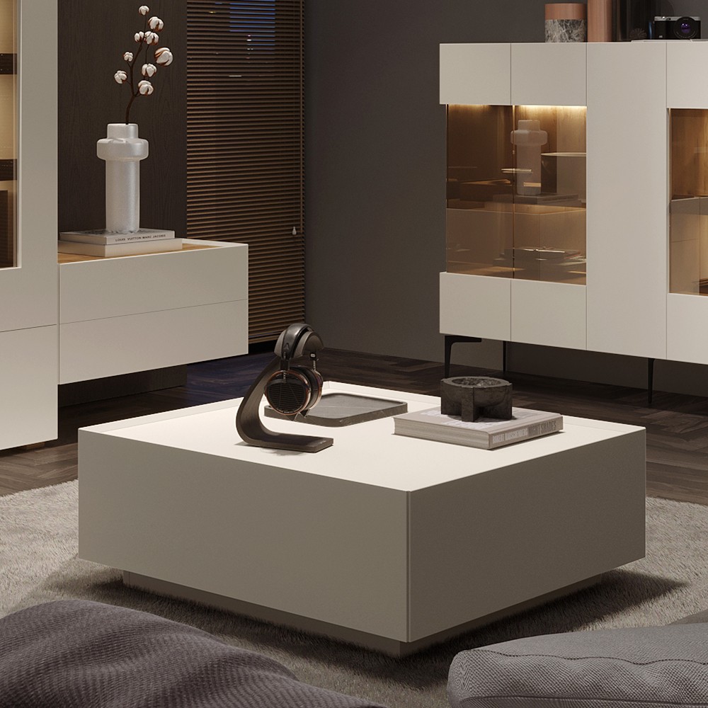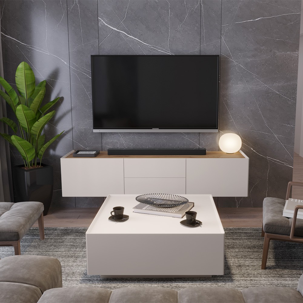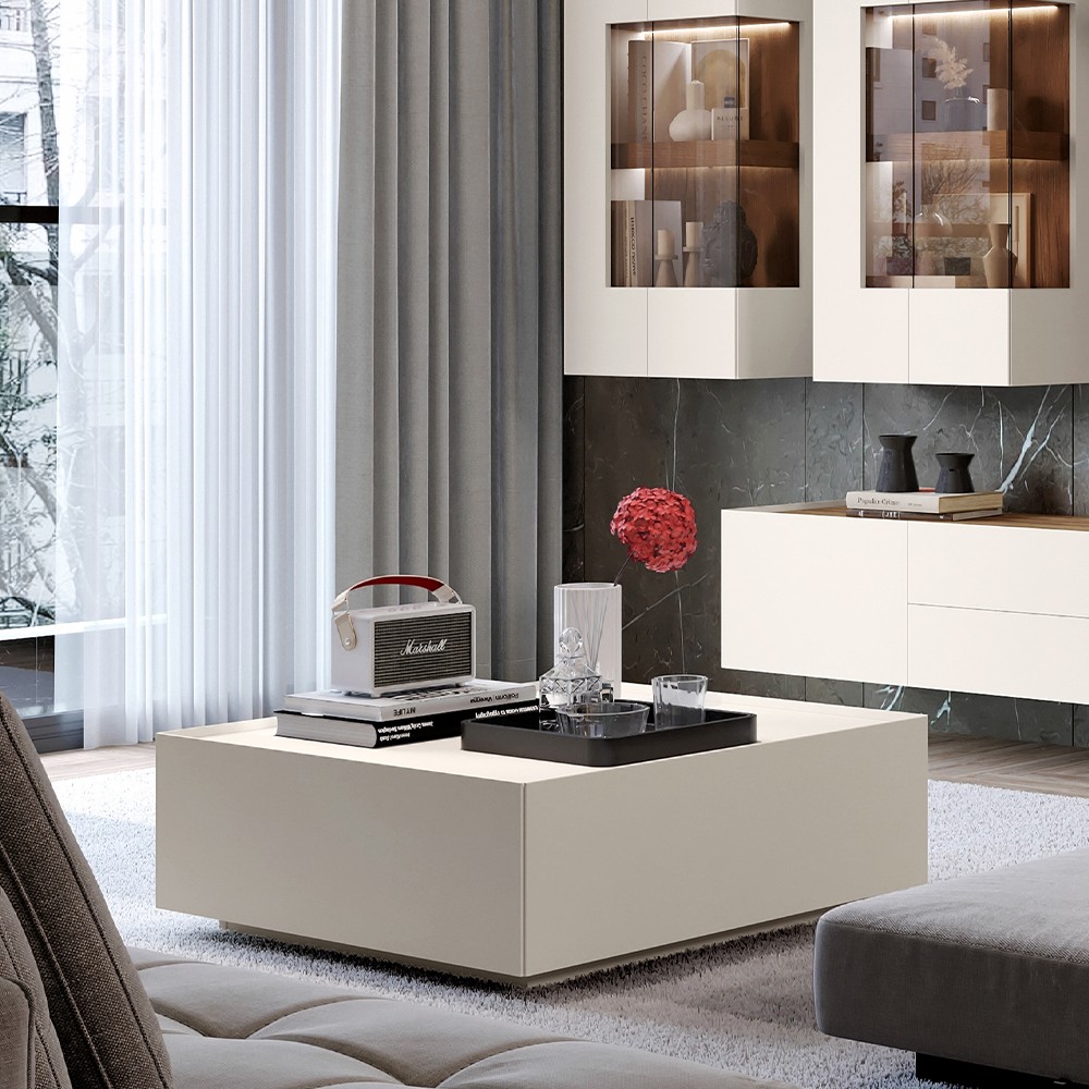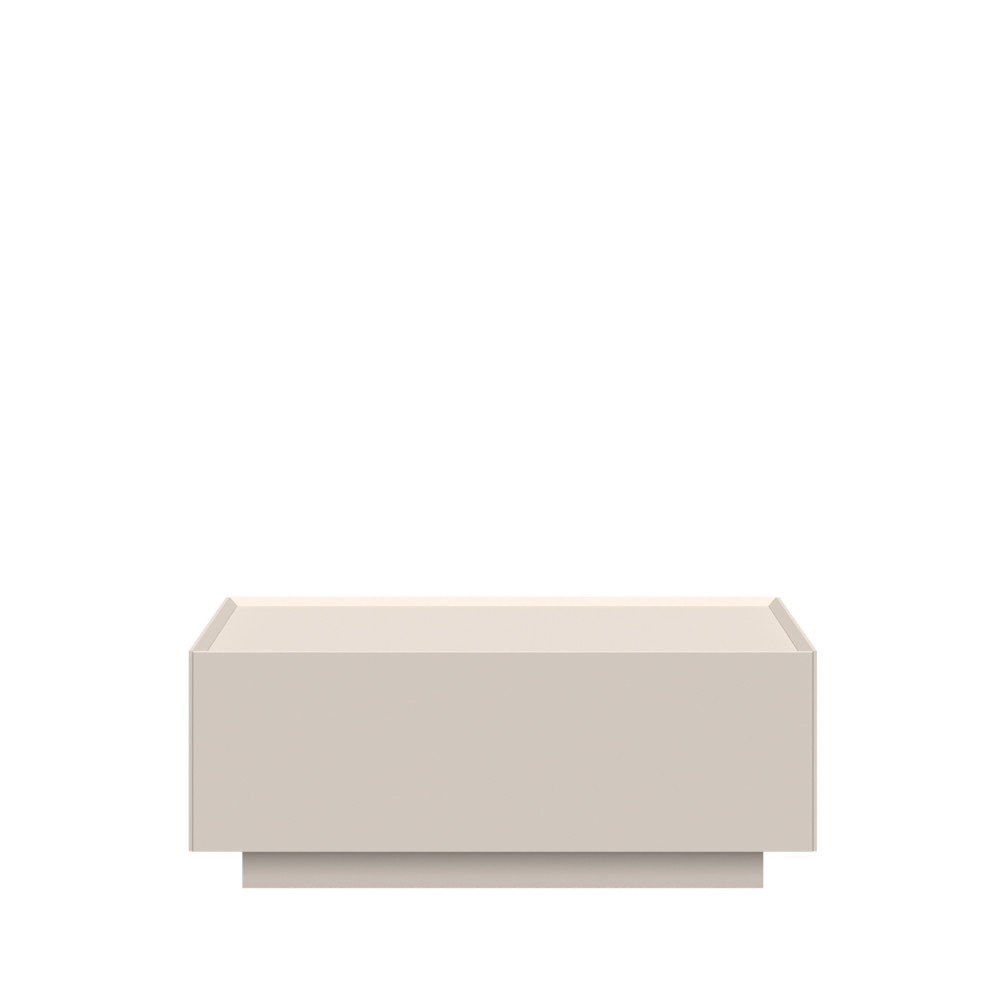 Klub stol za dnevni boravak iz kolekcije Sky 45 sa dvije ladice, dizajnerski iskorak u dizajnu i načinu spajanja stranica i fronti pod kutom od 45 stupnjeva. Stranice i fronte ladica izrađene su od medijapana obostrano lakiranog UV lakom s nježnim mat efektom u boji kašmira. Stropni element lakiran u boji kašmira, unutrašnjost ladica je u tekstil dekoru. Soft-close klizači ladica smanjuju trenje tijekom uporabe, otporniji su na habanje i osiguravaju maksimalnu dugovječnost u svakodnevnoj uporabi.
