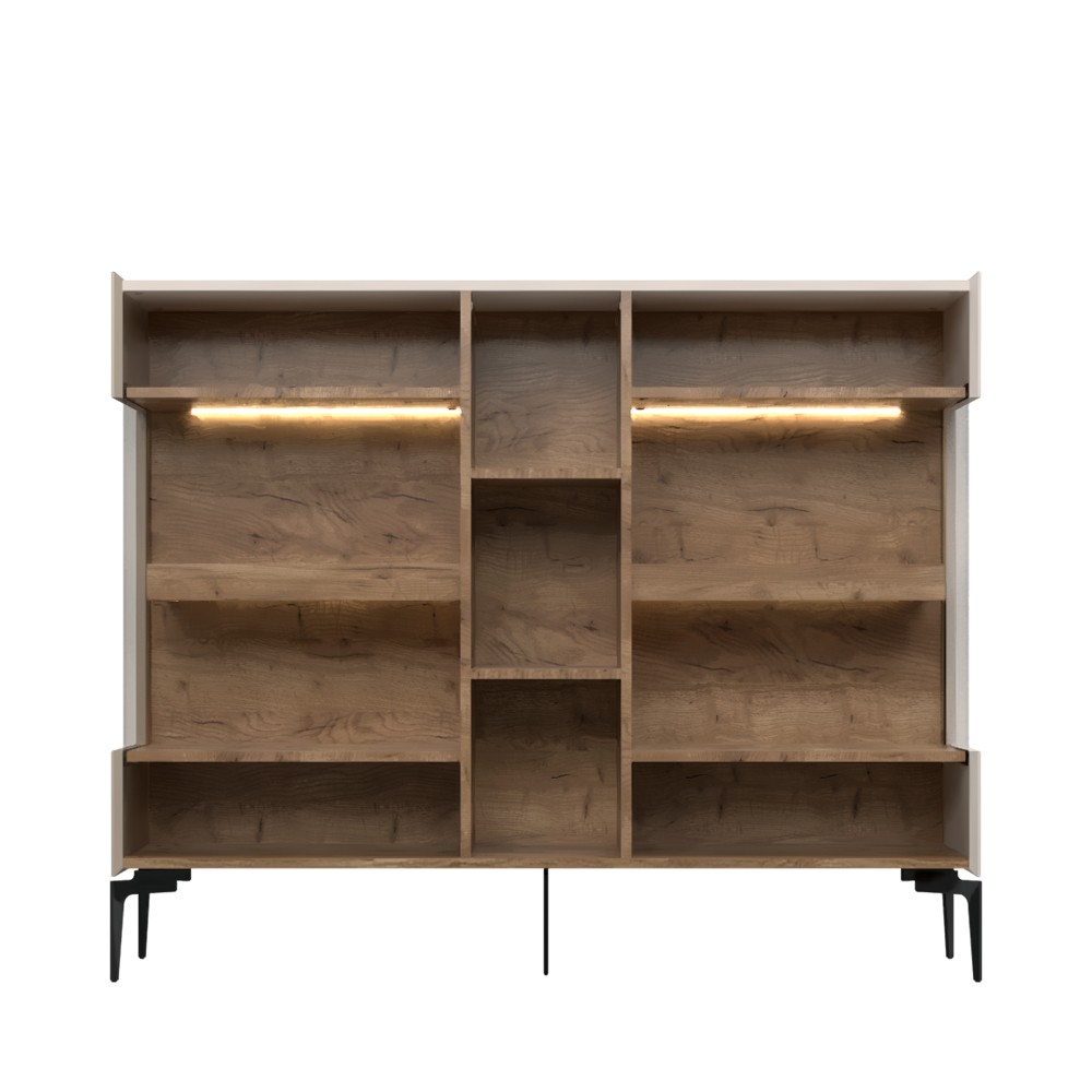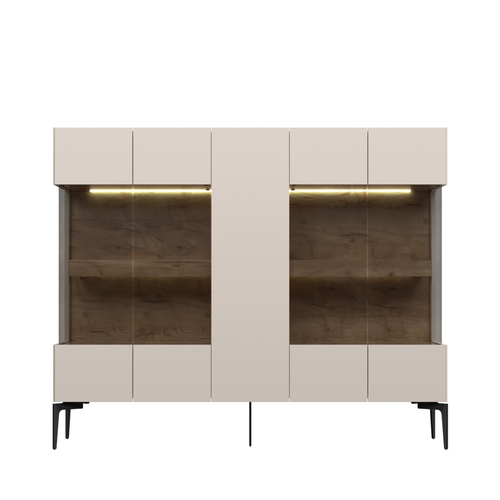 Komoda za dnevni boravak iz kolekcije Sky 45 sa jednom punim i 4 staklena krila. Masivne police unutar elemenata sa skrivenom LED rasvjetom i punim naslonom u drvo dekoru tobacco hrast kao i parsol staklom u braon boji, ovoj komodi daju jedinstven izgled. Dizajnerski iskorak u oblikovanju i spajanju stranica i fronti pod kutom od 45 stupnjeva stranice i fronte izrađene od medijapana obostrano lakirane UV lakom s nježnim mat efektom u boji kašmira. Elegantne tanke metalne nogice, soft-close šarke koje omogućuju otvaranje vrata do 170 stupnjeva. LED rasvjeta je uključena u cijenu proizvoda.