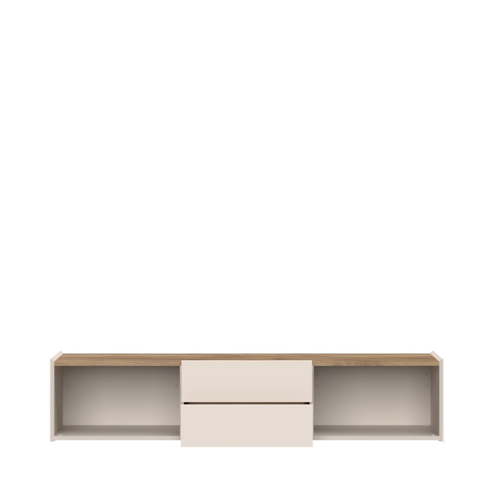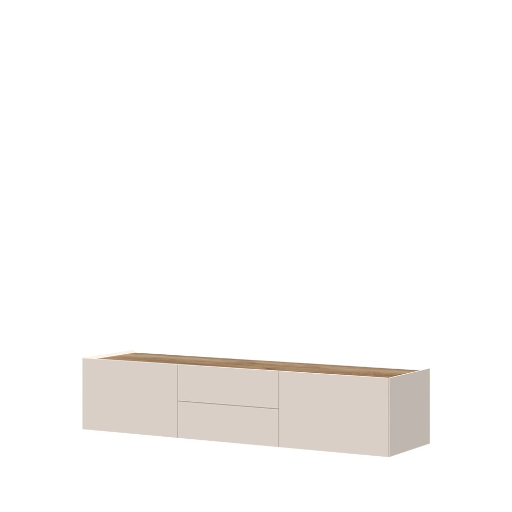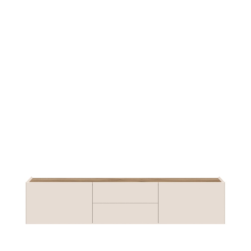 TV komoda za dnevni boravak iz kolekcije Sky 45 sa dva krila i dvije ladice. Dizajnerski iskorak u oblikovanju i spajanju stranica i fronti pod kutom od 45 stupnjeva. Bočne stranice, krila i fronte ladica su od medijapana obostrano lakiranog UV lakom s nježnim mat efektom u boji kašmira. Stropni element u dekoru tobacco hrast daje dodatnu toplinu ambijentu. Praktičan i moderan način pričvršćivanja konzole na zid, unutrašnjost ladica je u tekstil dekoru. Soft-close šarke koje omogućuju otvaranje vrata do 170 stupnjeva. Soft-close klizači ladica smanjuju trenje tijekom uporabe, otporniji su na habanje i osiguravaju maksimalnu dugovječnost u svakodnevnoj uporabi.