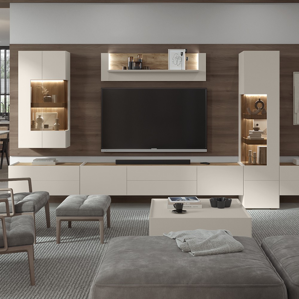 TV komoda za dnevni boravak iz kolekcije Sky 45 sa dva krila i dvije ladice. Dizajnerski iskorak u oblikovanju i spajanju stranica i fronti pod kutom od 45 stupnjeva. Stranice, krila i fronte ladica izrađene su od medijapana obostrano lakiranog UV lakom s nježnim mat efektom u boji kašmira. Stropni element u dekoru tobacco hrast daje dodatnu toplinu ambijentu. Praktičan i moderan način pričvršćivanja konzole na zid, unutrašnjost ladicaje u tekstil dekoru. Soft-close šarke koje omogućuju otvaranje vrata do 170 stupnjeva. Soft-close klizači ladica smanjuju trenje tijekom uporabe, otporniji su na habanje i osiguravaju maksimalnu dugovječnost u svakodnevnoj uporabi.