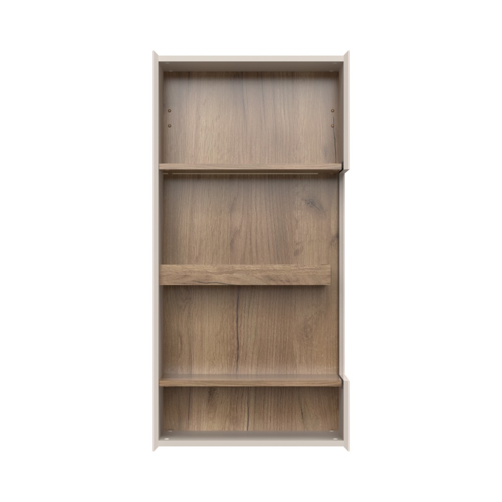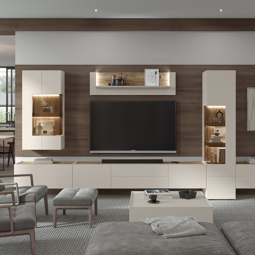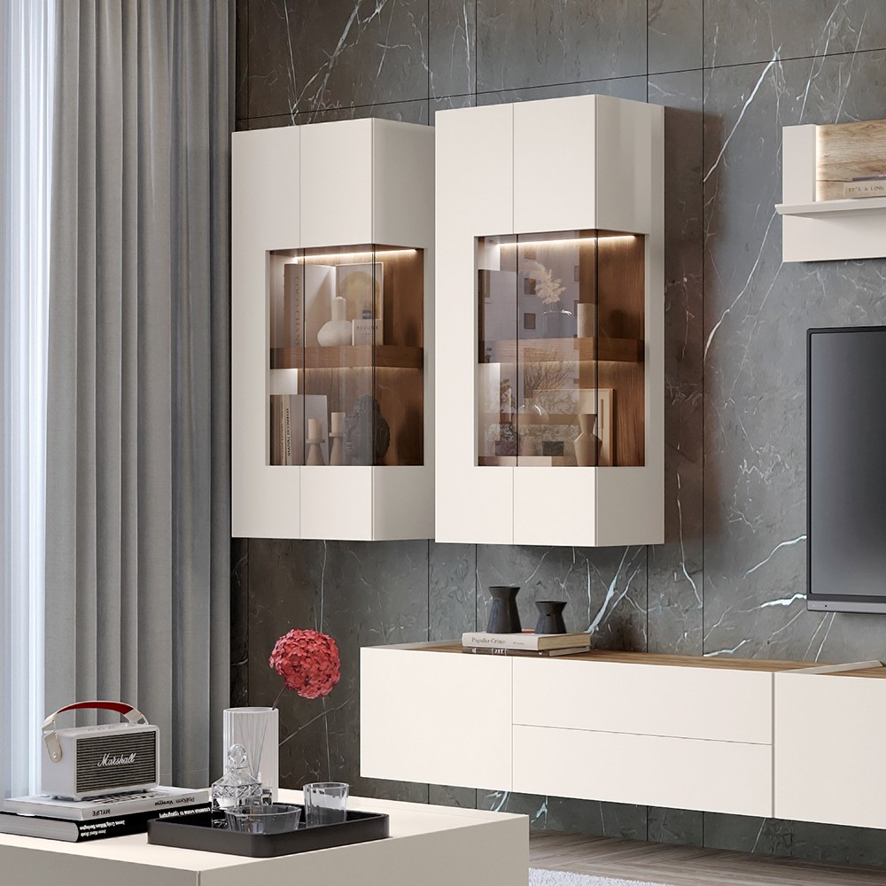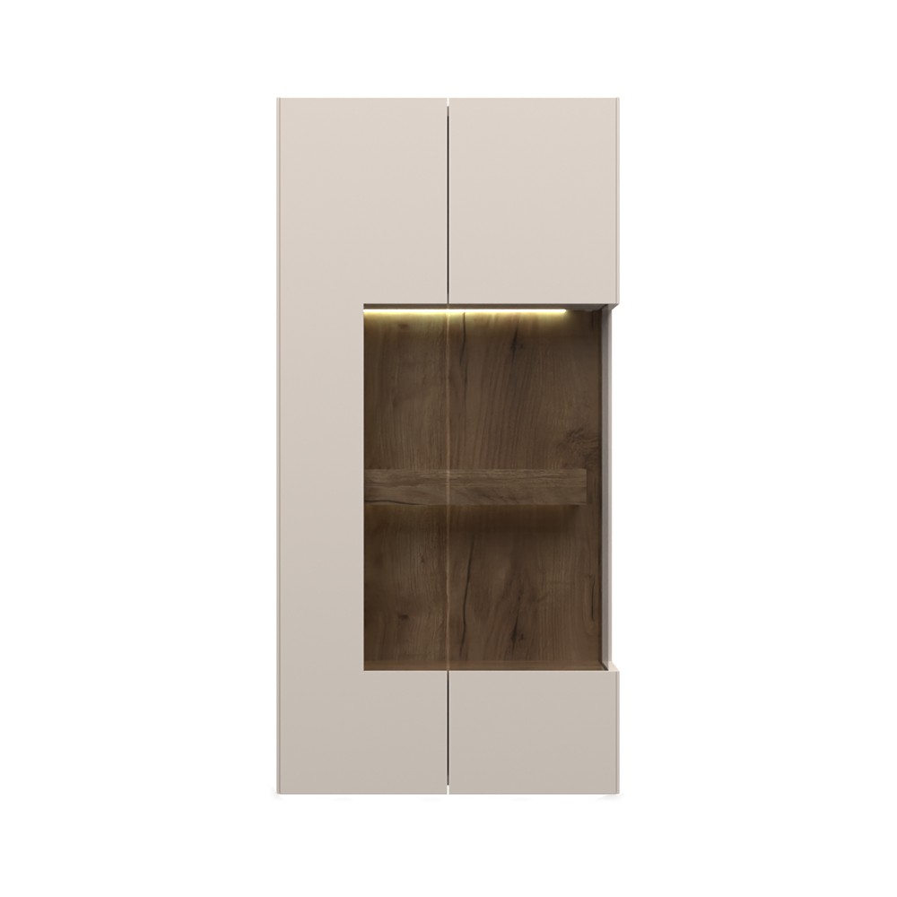 Komoda za dnevni boravak iz kolekcije sa dva staklena krila. Masivne police unutar elemenata sa skrivenom LED rasvjetom i punim naslonom u dekoru tobacco hrasta kao i parsol staklom u braon boji, ovoj komodi daju jedinstven izgled. Dizajnerski iskorak u oblikovanju i spajanju stranica i fronti pod kutom od 45 stupnjeva. Stranice i fronte izrađene od medijapana obostrano lakirane UV lakom s nježnim mat efektom u boji kašmira. Soft-close šarke koje omogućuju otvaranje vrata do 170 stupnjeva. Okovi za fiksiranje na zid i led rasvjeta uključeni su u cijenu proizvoda.