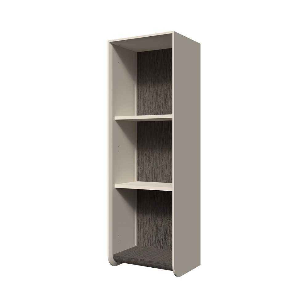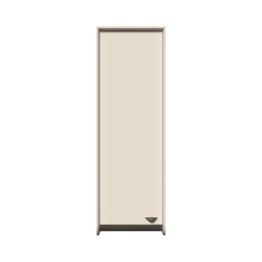 Viseća komoda za dnevni boravak iz kolekcije Soffy sa jednim punim krilom. Prednja strana lakirana u dekoru pepper white soft mat UV lak. Stranice i strop od MDF-a lakirani u dekoru pepper white soft mat UV lak. Unutrašnjost elementa u textil dekoru. Zakrivljeni pod elementa od MDF-a, s folijom u dekoru oak melinga grey. Police od parsol grey stakla. Ručke u antracit dekoru, soft-close šarke.