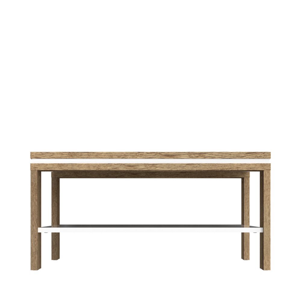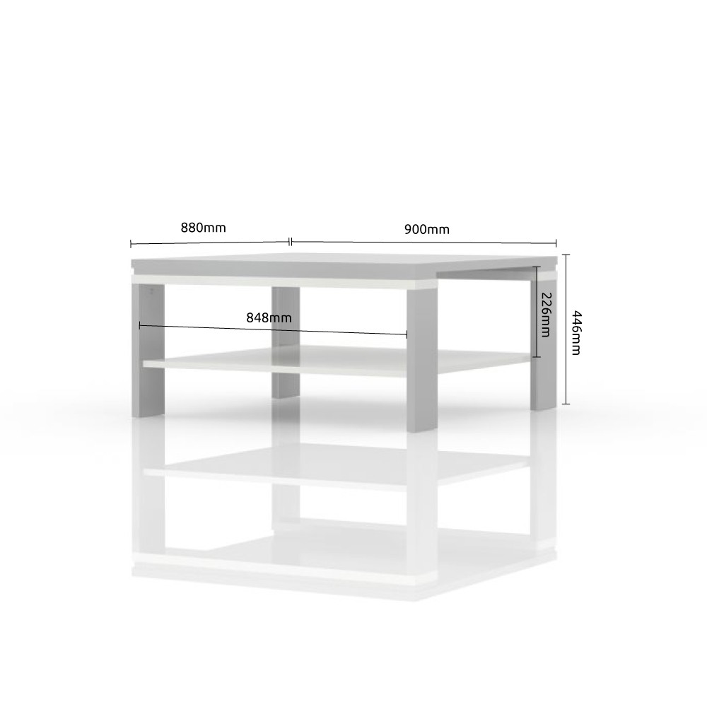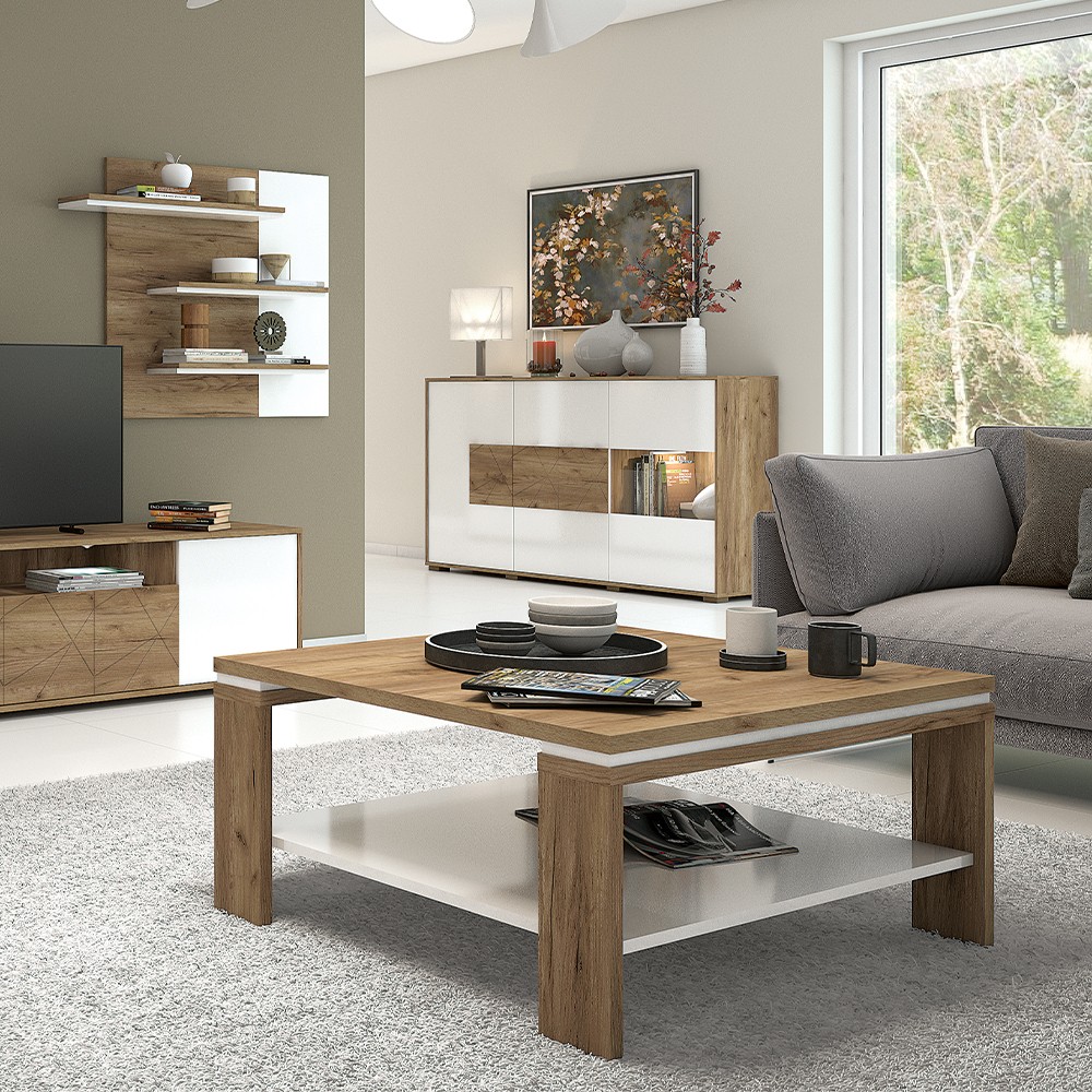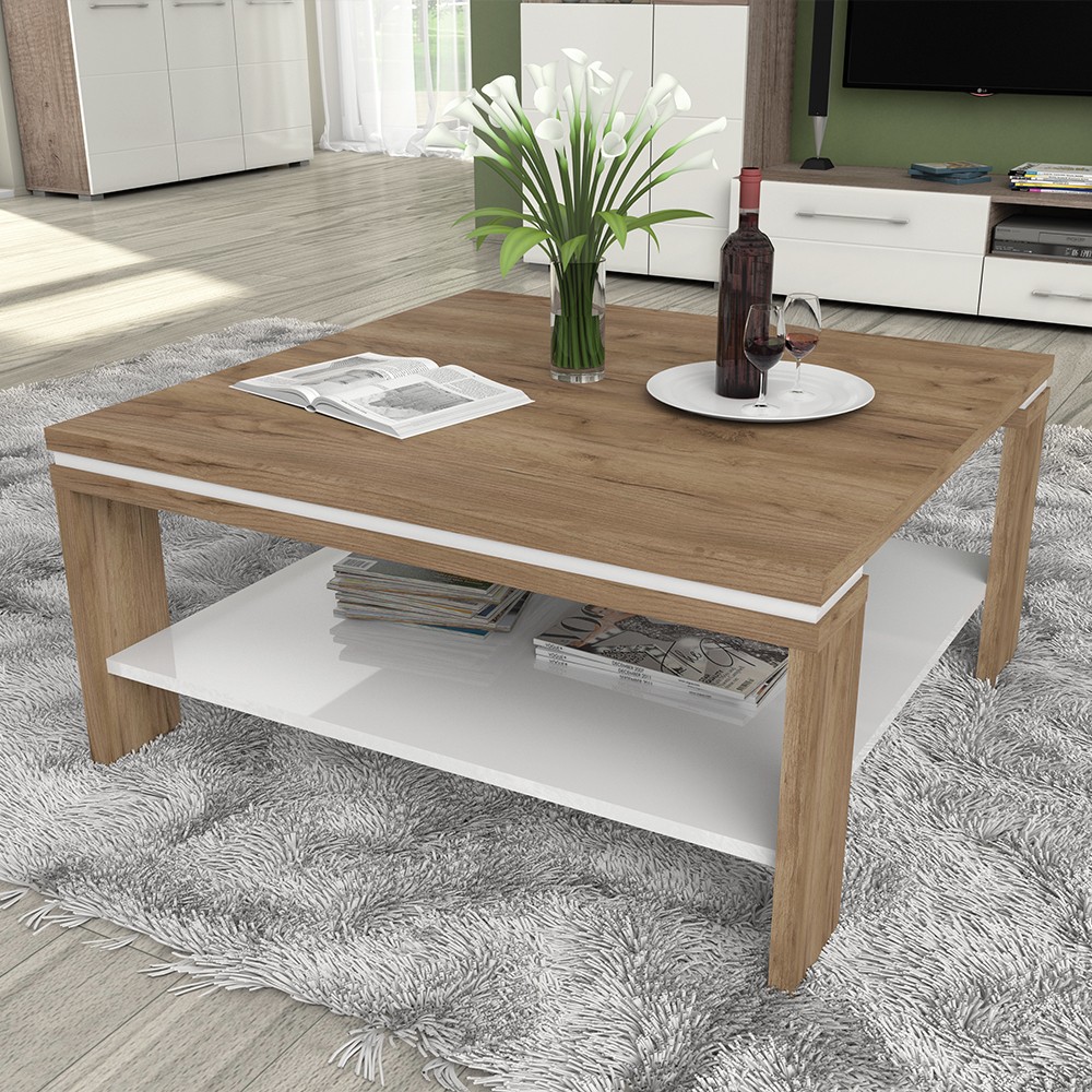 Klub stol iz kolekcije Stela koji se svojim modernim dizajnom savršeno uklapa u suvremeni ambijent dnevnog boravka. Ploča stola je u dekoru tobacco hrast s kristalno bijelom aplikacijom visokog sjaja. Element sadrži jednu policu lakiranu bijelim UV lakom u visokom sjaju, nogice stola su u dekoru tobacco hrast.