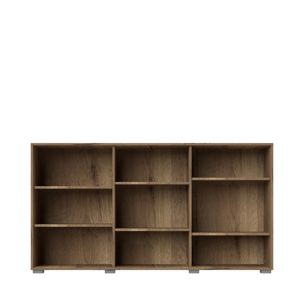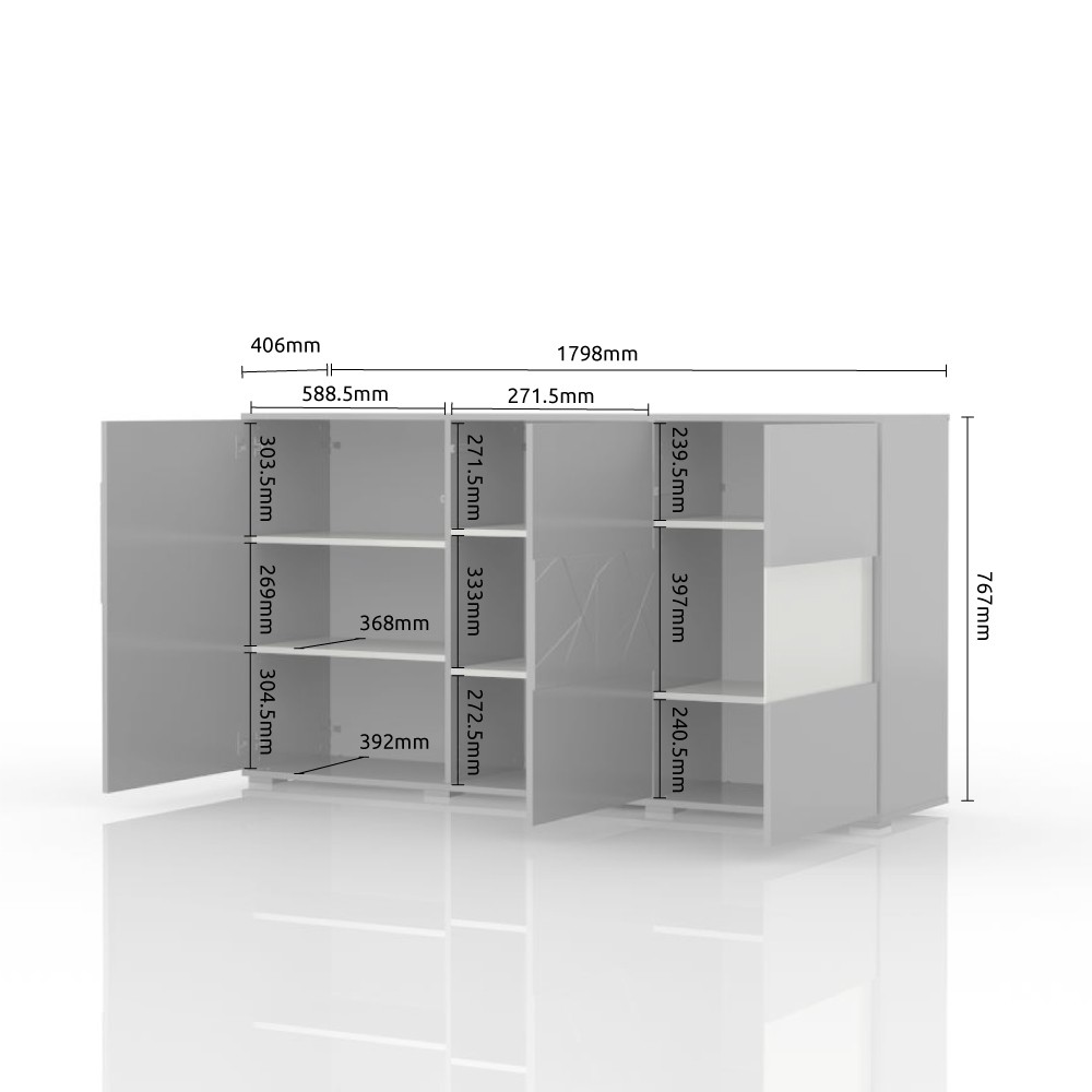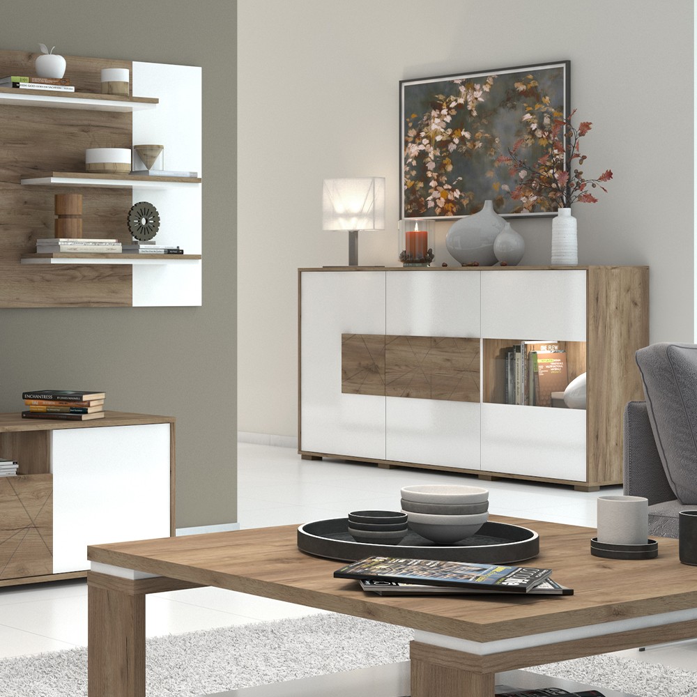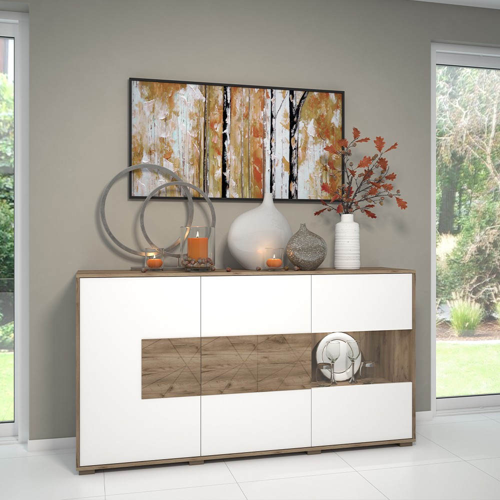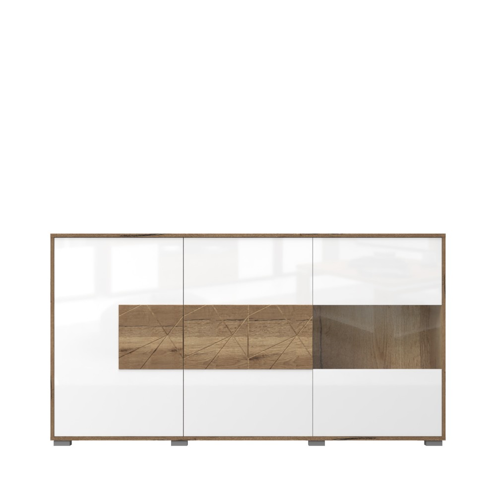 Komoda za dnevni boravak, iz kolekcije Stela, sa dva puna krila i jednim krilom sa staklom. Ovaj komad namještaja je suvremenog dizajna, te će se savršeno uklopiti u moderne dnevne sobe. Fronta punog krila lakirana UV lakom u bijeloj boji u visokom sjaju sa rezbarenom aplikacijom od medijapana u drvo-dekoru tobacco hrast. Krilo sa staklom je lakirano bijelim UV lakom u visokom sjaju. Korpus elementa je u drvo dekoru tobacco hrast. Soft-close šarke omogućuju tiho zatvaranje krila što pruža dodatnu udobnost tijekom stalne uporabe. Otvaranje krila je olakšano mehanizmom push-to-open. Komoda ima šest polica u dekoru tobacco hrast, kao i LED rasvjetu 0,3W. Podesive nogice pružit će mogućnost niveliranja na neravnim površinama.