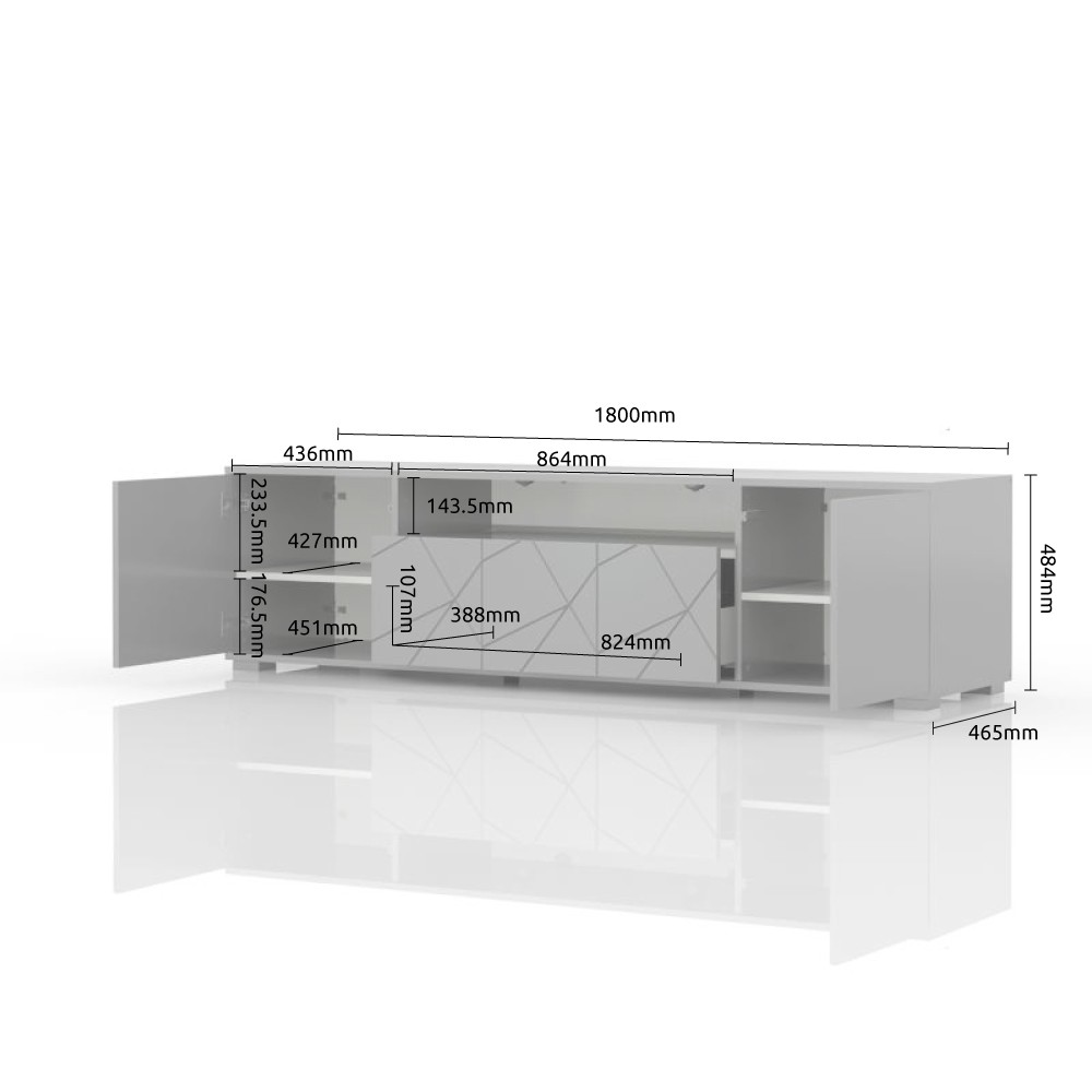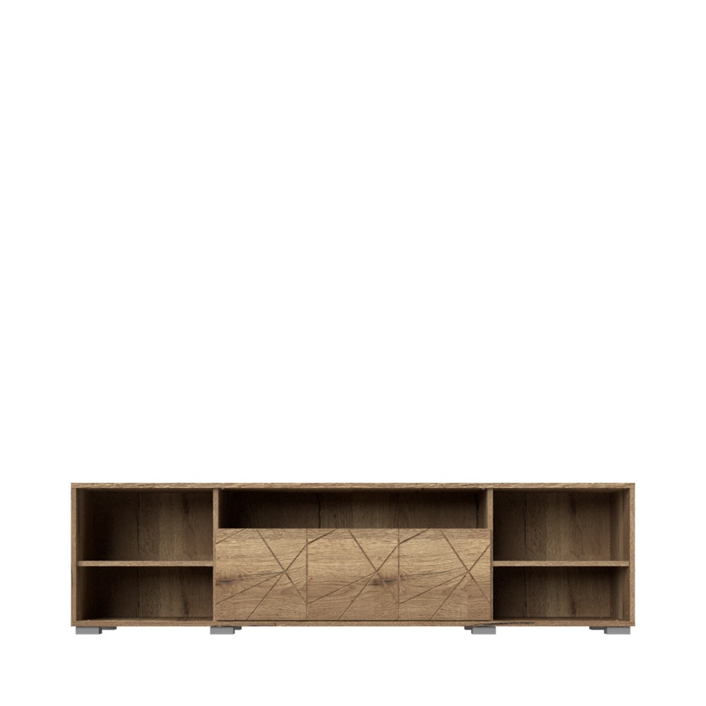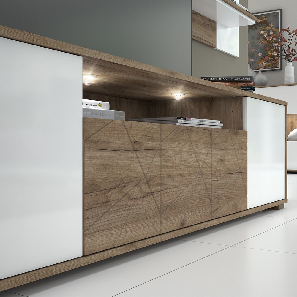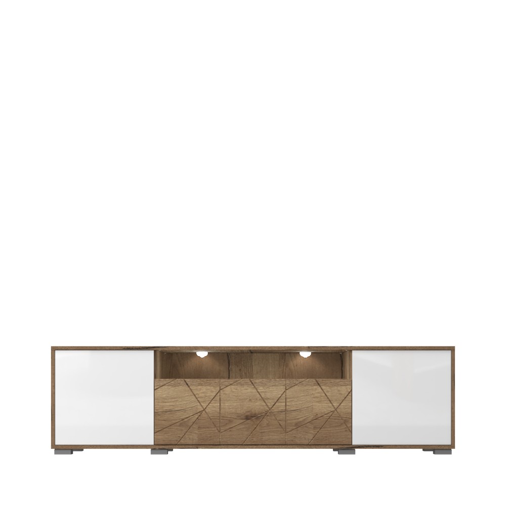 TV komoda za dnevni boravak, iz kolekcije Stela, s dva krila, otvorenom policom i ladicom, bez ručki, u skladu s novim trendovima u dizajnu namještaja. Prednja strana krila je lakirana UV lakom u bijeloj boji u visokom sjaju. Fronta ladice izrađena je od medijapana u drvo dekoru tobacco hrast s izrezbarenom aplikacijom. Otvorena polica i korpus elementa su u dekoru tobacco hrast. Soft-close mehanizmi omogućuju tiho zatvaranje ladice i krila, što pruža dodatnu udobnost tijekom stalne uporabe. Otvaranje krila je olakšano mehanizmom push-to-open. Dvije police u dekoru tobacco hrast, podesive nogice za izravnavanje na neravnim površinama, kao i LED rasvjeta 0,6W, uključeni su u cijenu elementa.