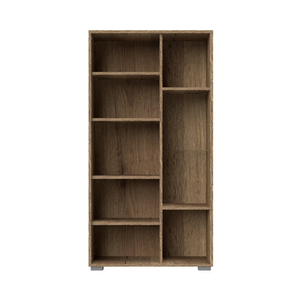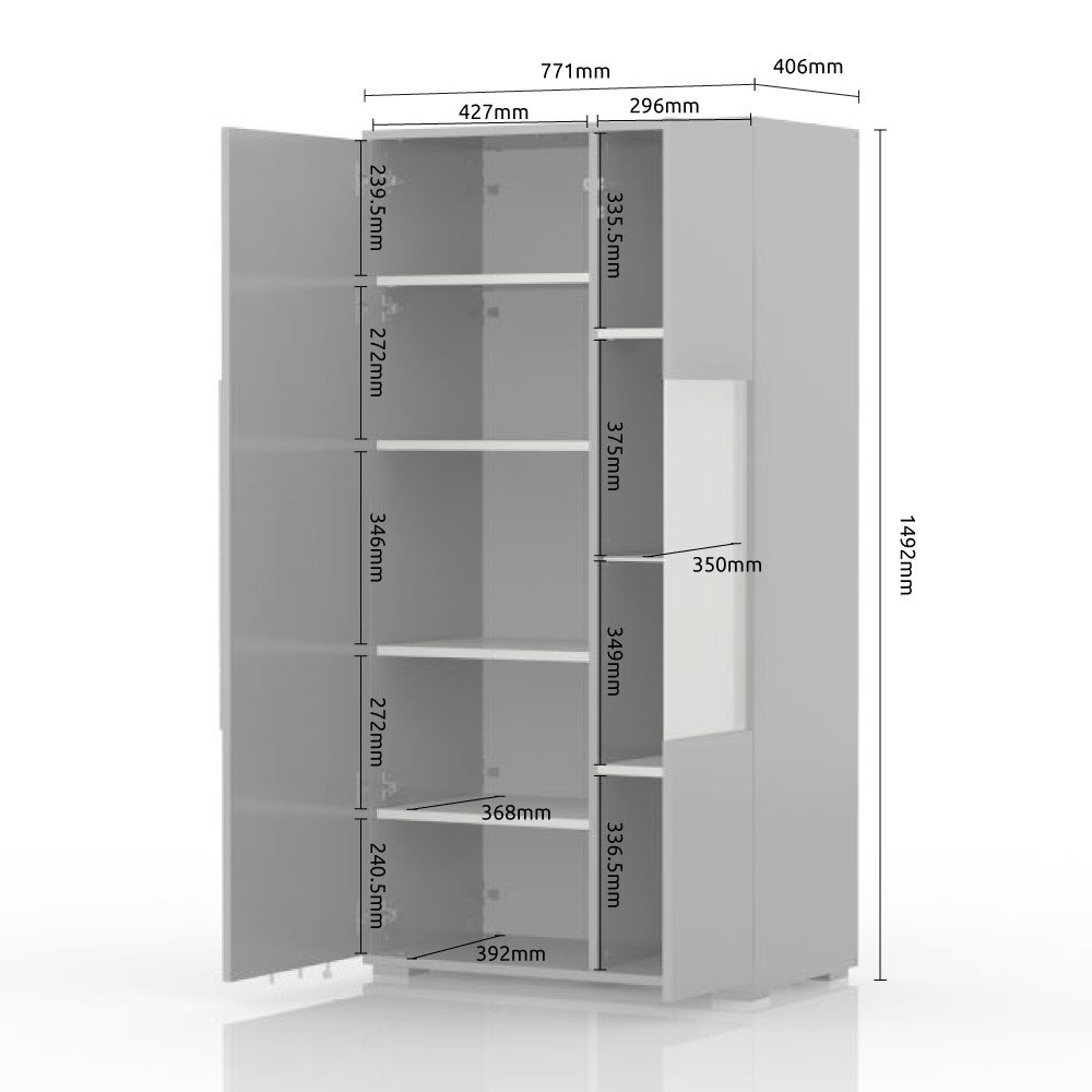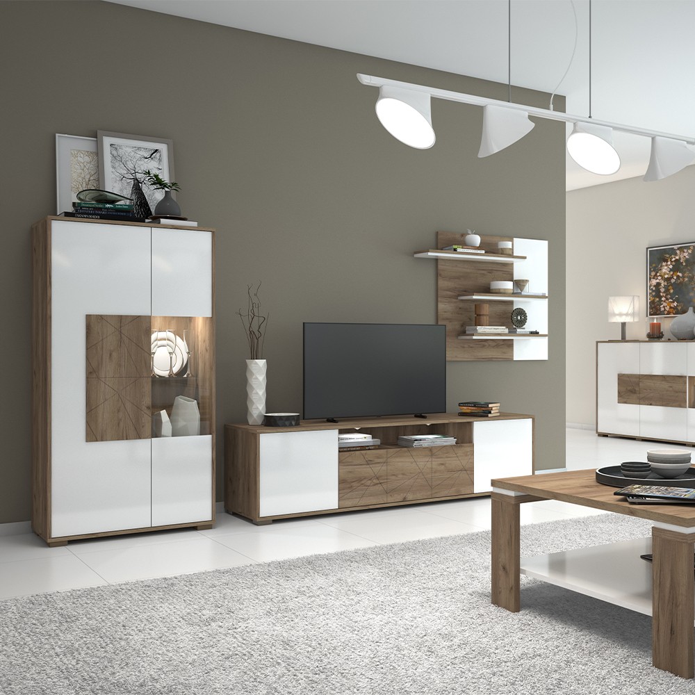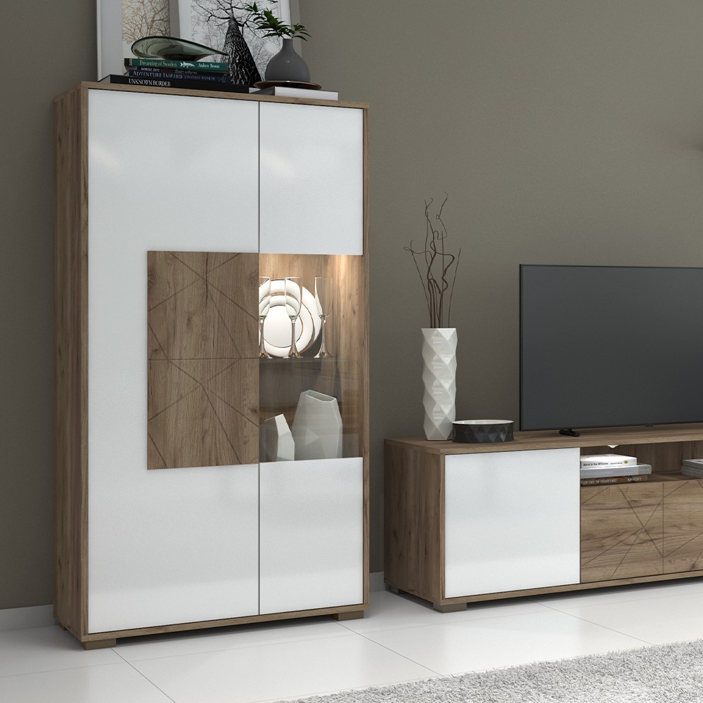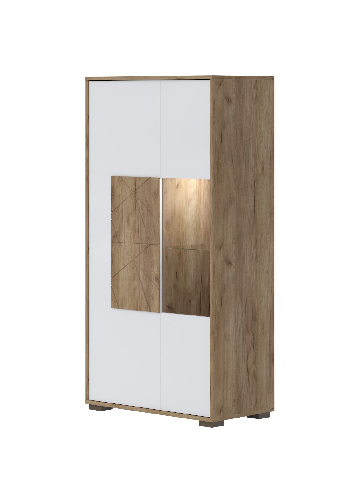 Vitrina za dnevni boravak iz kolekcije Stela u bijeloj boji sa dva krila. Ovaj element namještaja je suvremenog dizajna, bez ručkica i u skladu je s novim trendovima u dizajnu namještaja. Fronta punog krila lakirana UV lakom u bijeloj boji u visokom sjaju sa rezbarenom aplikacijom od medijapana u drvo-dekoru tobacco hrast, drugo krilo ima kaljeno staklo debljine 4 mm. Korpus elementa je u drvo dekoru tobacco hrast. Soft-close šarke omogućuju tiho zatvaranje krila što pruža dodatnu udobnost tijekom stalne upotrebe, a otvaranje krila olakšava mehanizam push-to-open. Vitrina ima četiri police u dekoru tobacco hrast, dvije staklene police, kao i podesive nogice za niveliranje na neravnim površinama.