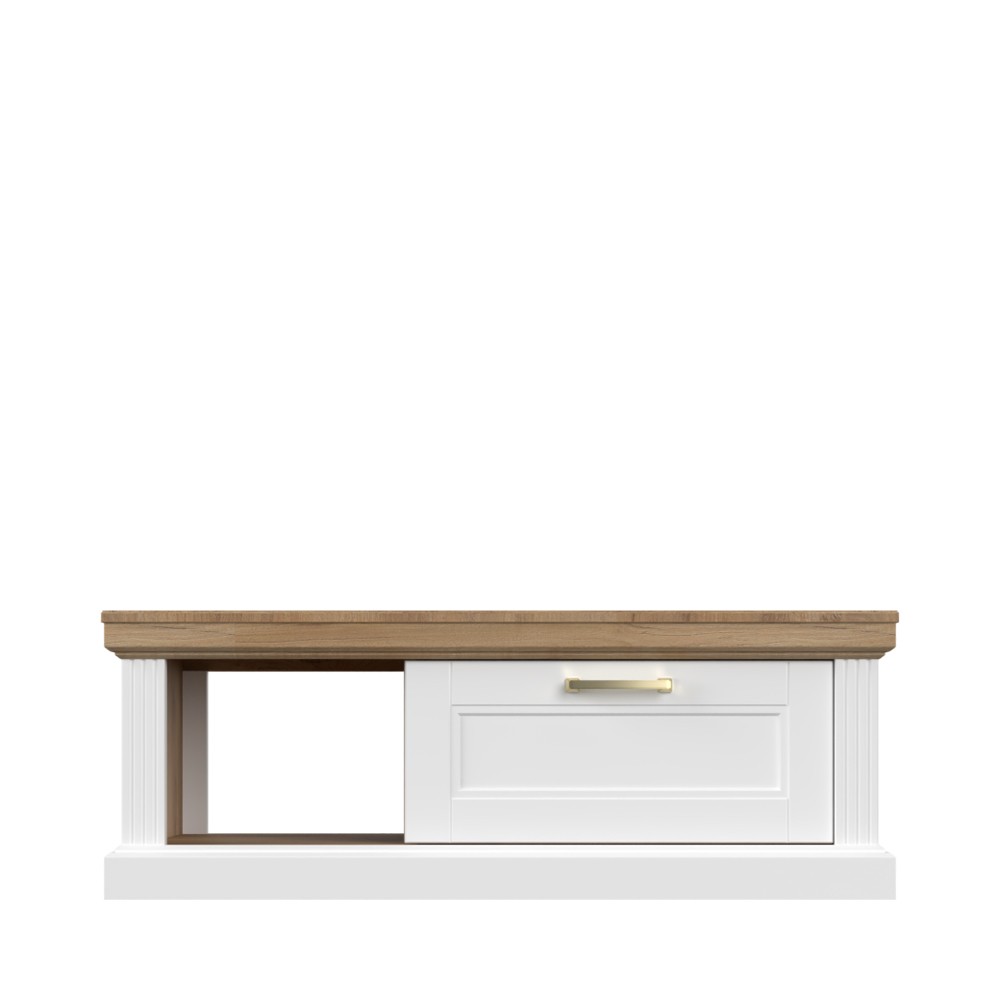 Klub stol za dnevni boravak iz kolekcije Tara sa jednom ladicom i otvorenom policom. Proizveden je od medijapana potpuno lakiranog UV lakom s mekanim mat efektom u grafitnoj ili bijeloj boji. Dekorativna masivna pokrovna ploča izrađena je od medijapana presvučene folijom u dekoru pacifik orah. Stilski profilirane lajsne izrađene su od MDF-a debljine 25 mm. Unutrašnjost ladice je u dekoru tekstil. Stol ima soft-close klizače za tiho i elegantno zatvaranje ladice. Skriveni kotačići za lakšu manipulaciju i ukrasna ručka (R-30) uključeni su u cijenu elementa.