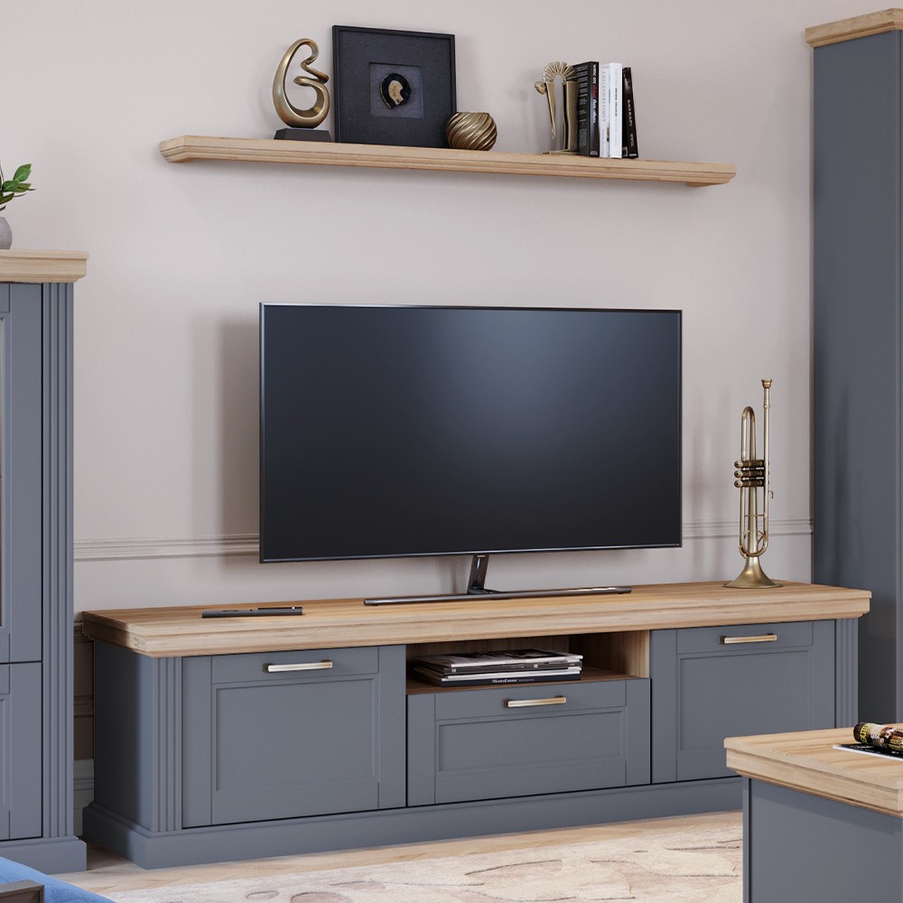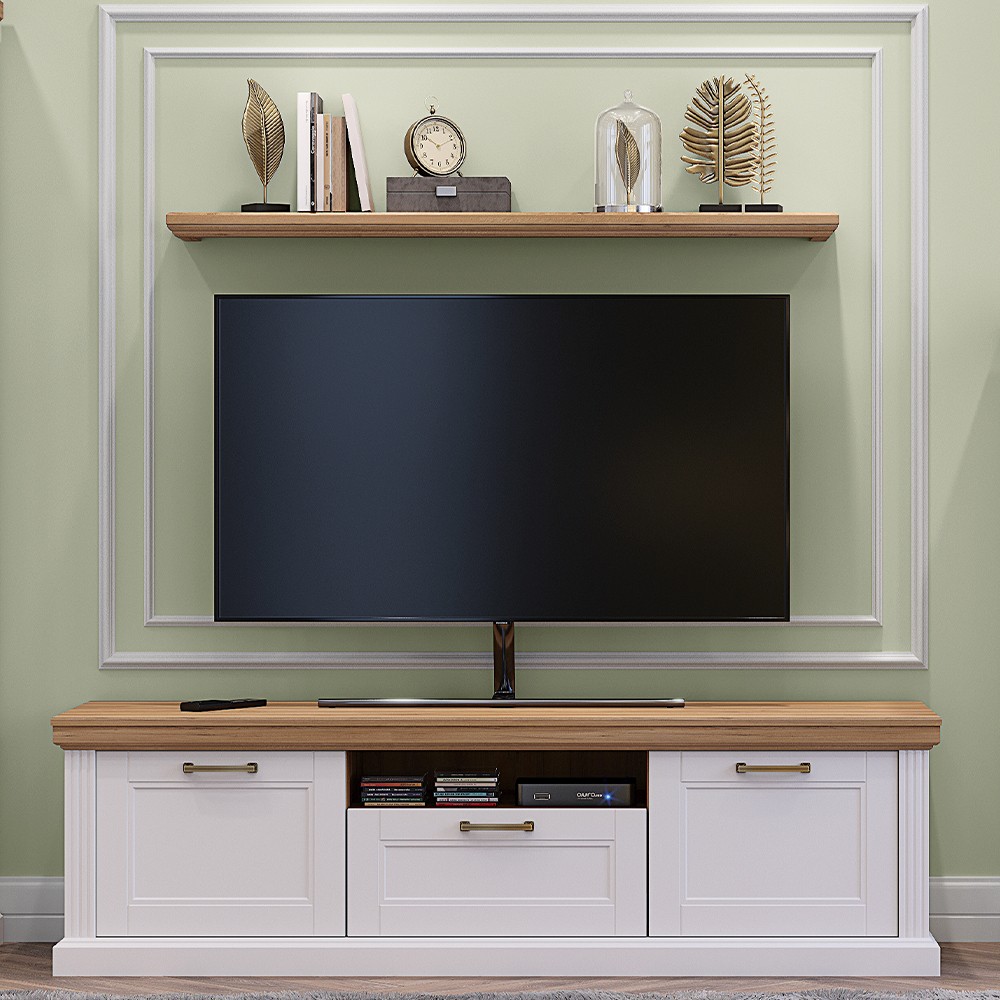 Viseća polica za dnevni boravak, iz kolekcije Tara, izrađena od medijapana u dekoru pacifik orah. Polica ima stilski profilirane lajsne element ima okov za vješanje.