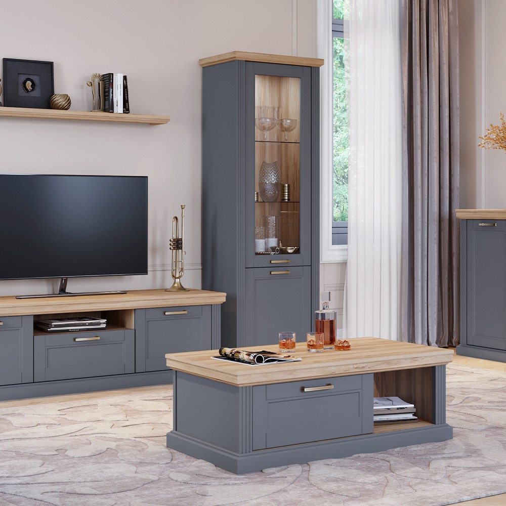 Luksuzna vitrina za dnevni boravak iz kolekcije Tara sa jednim staklenim i jednim punim krilom. Prednja strana vitrine izrađena je od rezbarene iverice lakirane UV lakom s nježnim mat efektom u grafitnoj ili bijeloj boji. Korpus elementa izrađen je od iverala u dekoru pacifik orah, s vidljive strane lakirano UV lakom s soft mat efektom u grafitnoj ili bijeloj boji. Gornje krilo ima okvir s ispunom od kaljenog stakla stilski profilirane lajsne, koje su dio ove komode, izrađene su od MDF-a debljine 25 mm. Element sadrži dvije staklene police i dvije od iverala. Vitrina ima soft-close šarke za tiho i elegantno zatvaranje. Ukrasne mesingane ručke (R-30) i LED rasvjeta uključeni su u cijenu elementa. Podesive nogice omogućuju izravnavanje na neravnim površinama.