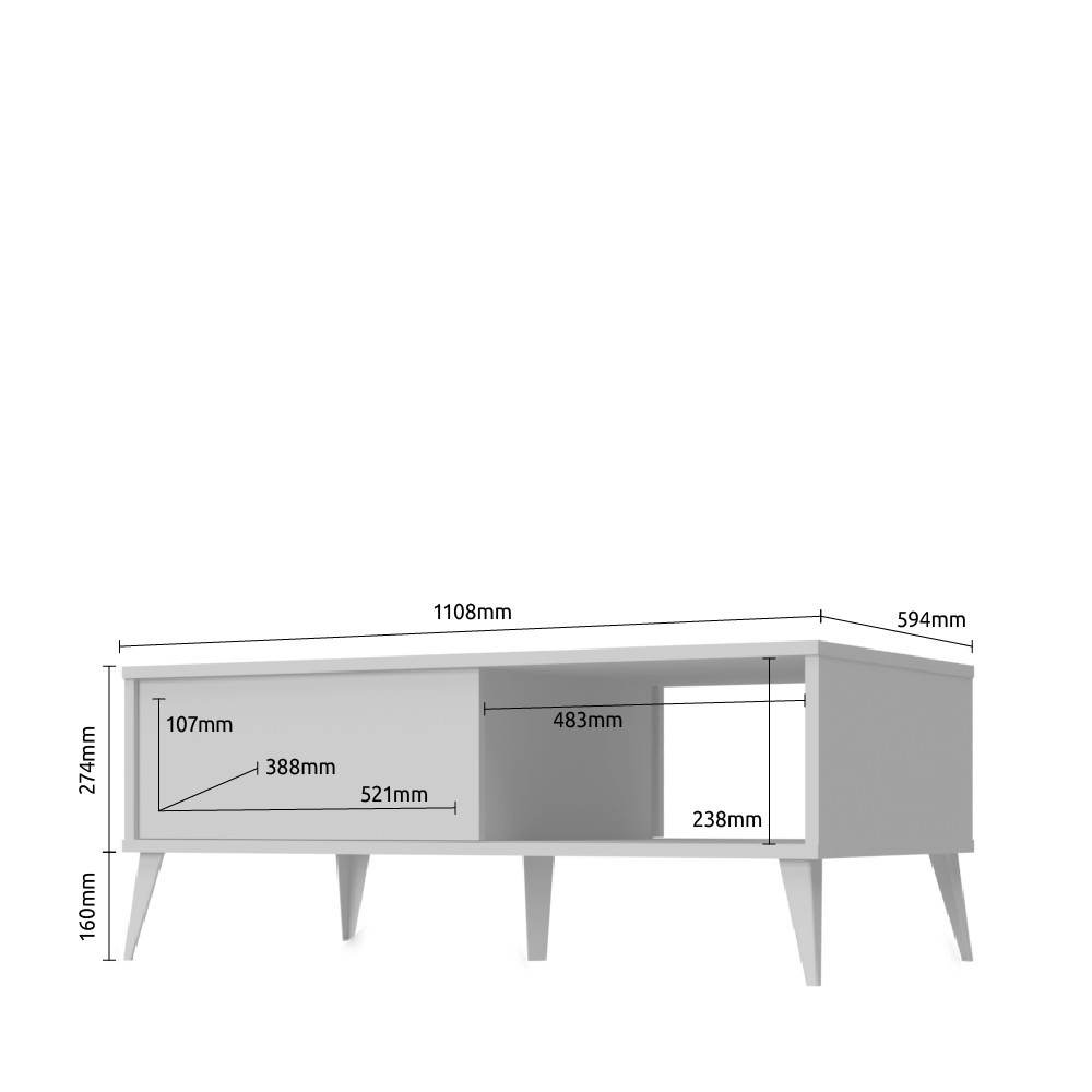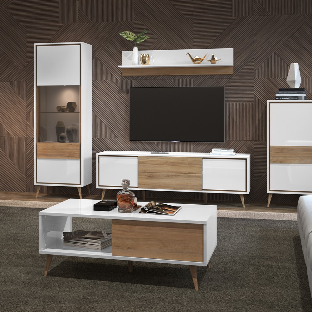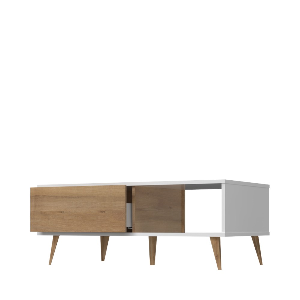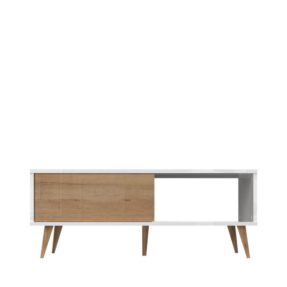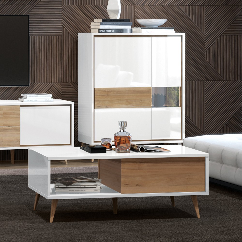 Klub stol za dnevni boravak iz kolekcije Vida u kristalno bijeloj boji s frontama ladica u drvo dekoru pacifik orah. Ovaj komad namještaja unijet će duh 60-ih u Vaš dnevni boravak. Svi vidljivi dijelovi elementa lakirani su UV lakom visokog sjaja, ukrasne nogice stola su u drvo dekoru pacifik orah.