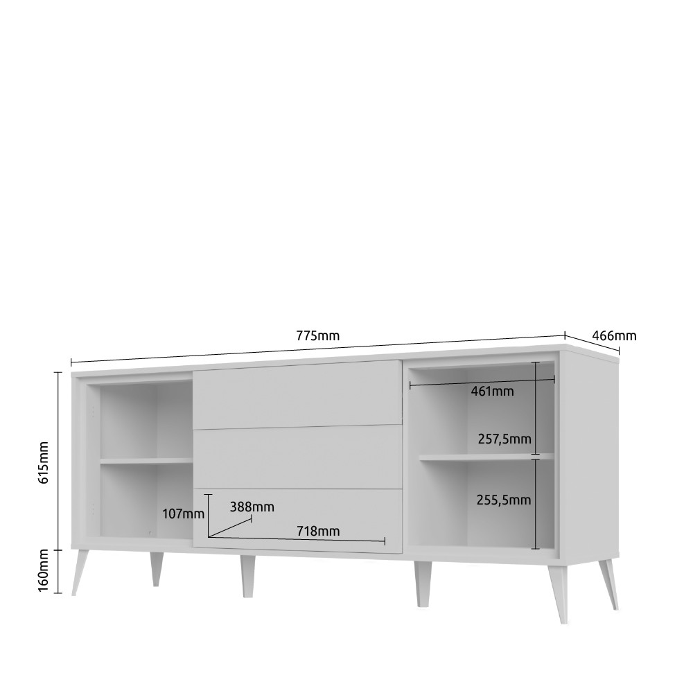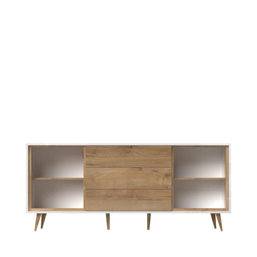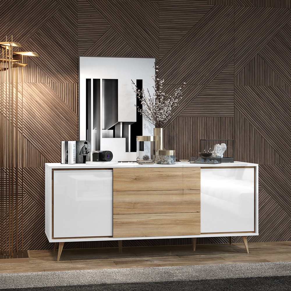 Komoda iz kolekcije Vida, s dva krila u kristalno bijeloj boji i tri ladice u drvo dekoru pacifik orah, dizajnirana je u stilu 60-ih. Ova komoda namijenjena je ljubiteljima namještaja retro dizajna. Fronte su lakirane UV lakom u visokom sjaju u kristalno bijeloj boji. Fronte ladica su lakirane u drvo dekoru pacifik orah u visokom sjaju. Otvaranje ladica je olakšano push-to-open mehanizmom za otvaranje. Soft-close klizači omogućavaju tiho zatvaranje ladica što pruža dodatnu udobnost tijekom stalne upotrebe. Ukrasne nogice i leđa su u drvo dekoru pacifik orah. Komoda također ima dvije police.