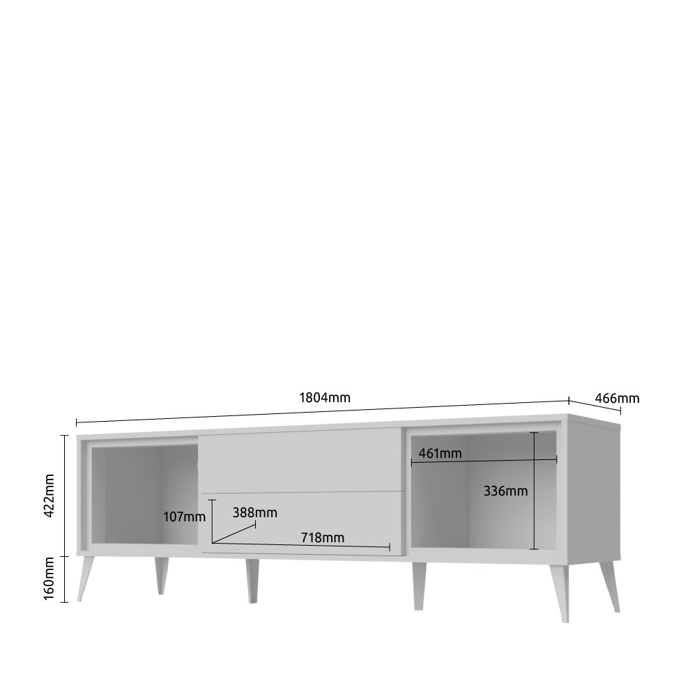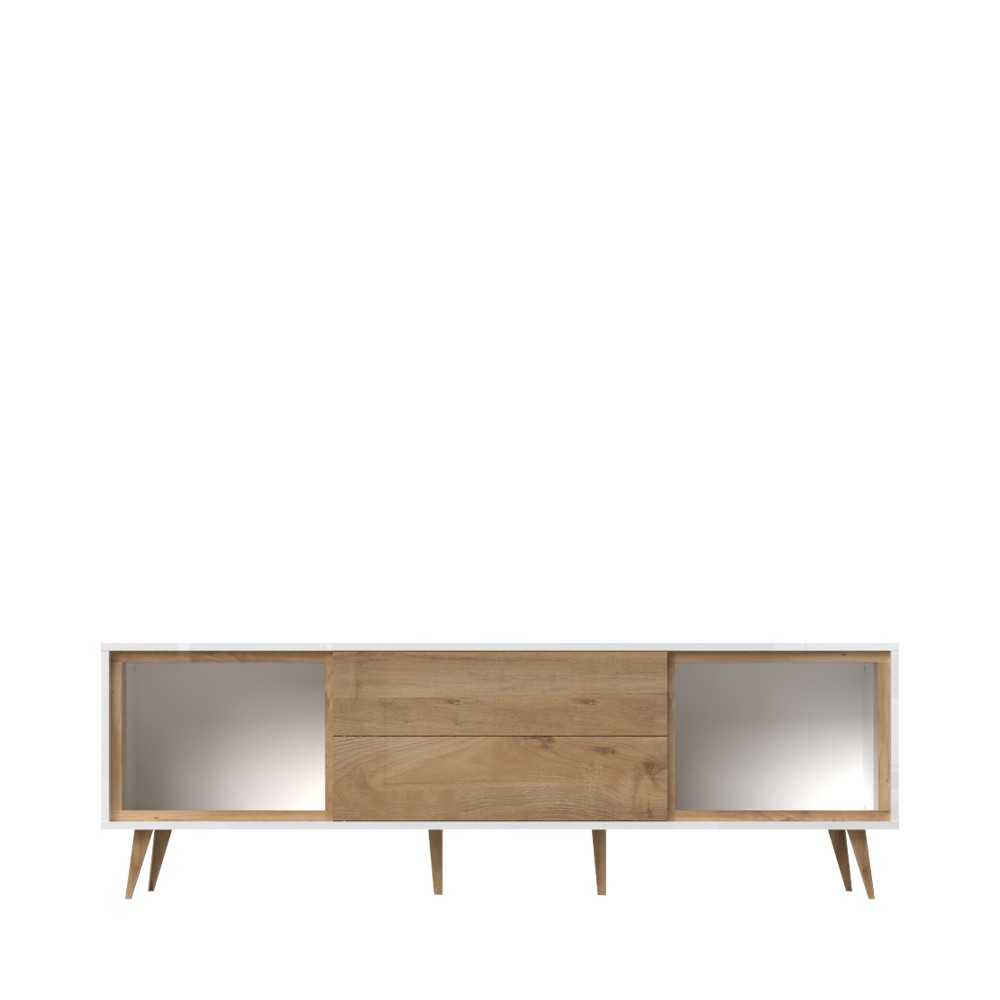 TV komoda za dnevni boravak, dvokrilna i sa dvije ladice, iz kolekcije namještaja Vida. Krila, stranice i strop elementa su lakirani UV lakom u visokom sjaju, u kristalno bijeloj boji. Fronte ladica su u dekoru drva pacifik orah, lakirane UV lakom visokog sjaja. Unutarnji dijelovi korpusa su kombinacija bijele boje i pacifik oraha. Ukrasne noge i leđa su u drvo dekoru pacifik orah. Otvaranje ladica i krila je olakšano push-to-open mehanizmom. Soft-close klizači omogućavaju tiho zatvaranje ladica što pruža dodatnu udobnost tijekom stalne upotrebe.