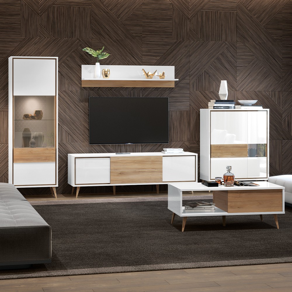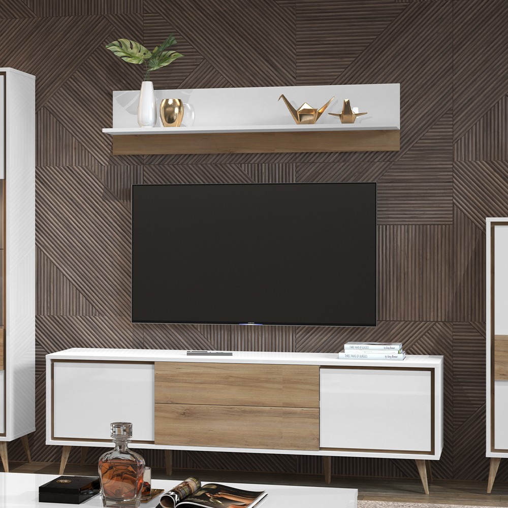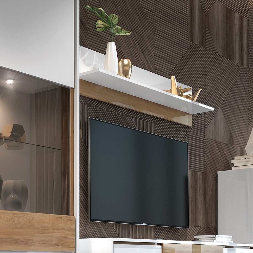Viseća polica za dnevni boravak, iz kolekcije Vida, lakirana UV lakom u kristalno bijeloj boji, s aplikacijom u drvo dekoru pacifik orah u visokom sjaju. Ovaj komad namještaja namijenjen je ljubiteljima retro dizajna.