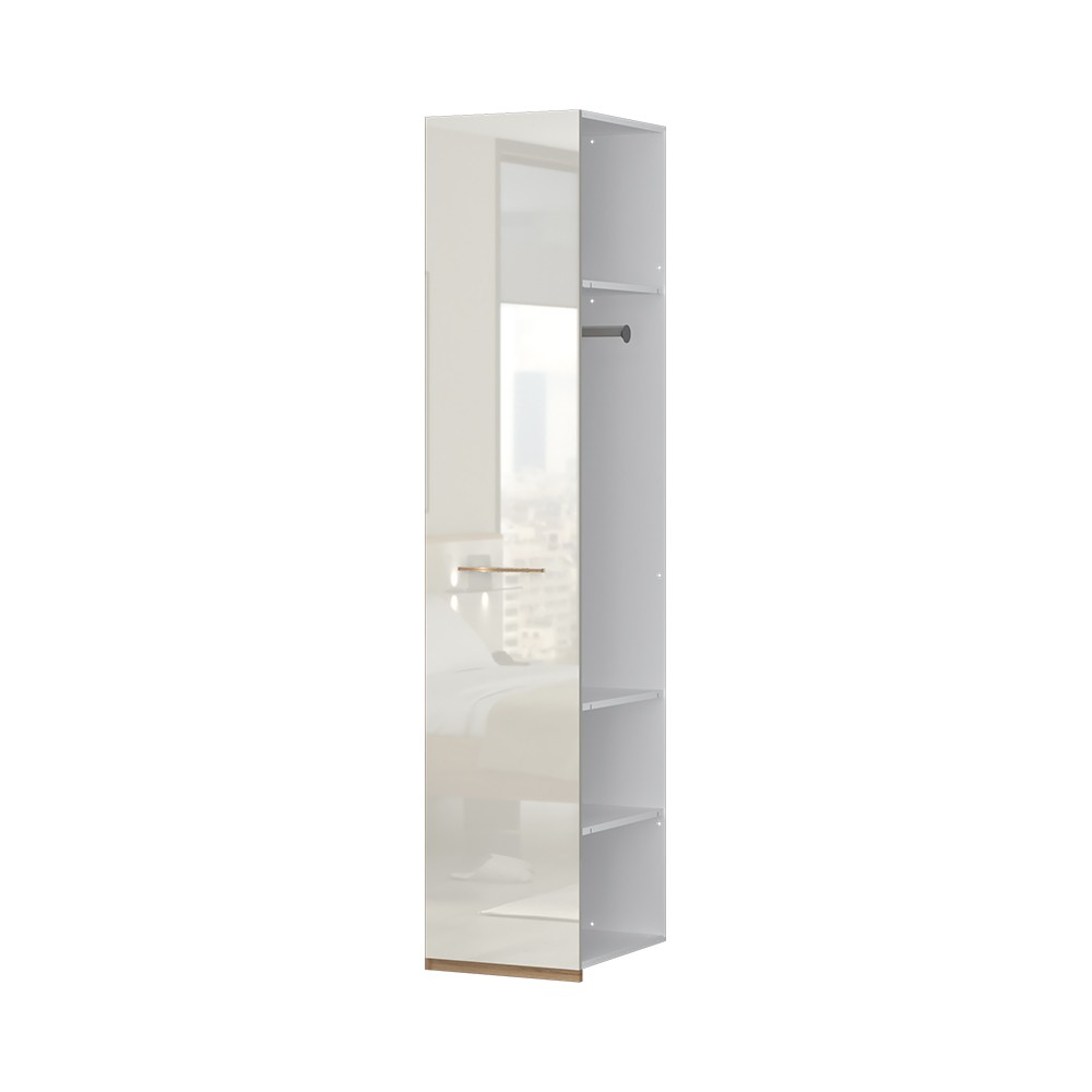 Dodatni jednokrilni ormar za spavaću sobu, iz kolekcije Gala. Proširite već odabranu kompoziciju svoje garderobe za jednu širinu krila. dodatni ormar nije samostalan element, već se kombinira s ormarima P22/GL i P32/GL. Fronta dodatnog ormara je lakirana UV lakom visokog sjaja u bež boji. Unutarnji dijelovi korpusa su bijeli, na ručki je aplikacija u drvo dekoru. Soft-close šarke omogućuju tiho zatvaranje krila što pruža dodatnu udobnost tijekom stalne uporabe. Dodatni ormar sadrži tri manje police, pregradnu vertikalu u bijeloj boji, manju garderobnu šipku, kao i podesive nogice za niveliranje na neravnim površinama. Dodatna oprema pruža mogućnost kreiranja unutrašnjosti ormara prema Vašim potrebama.