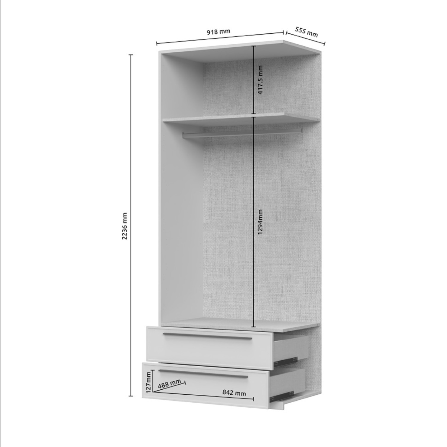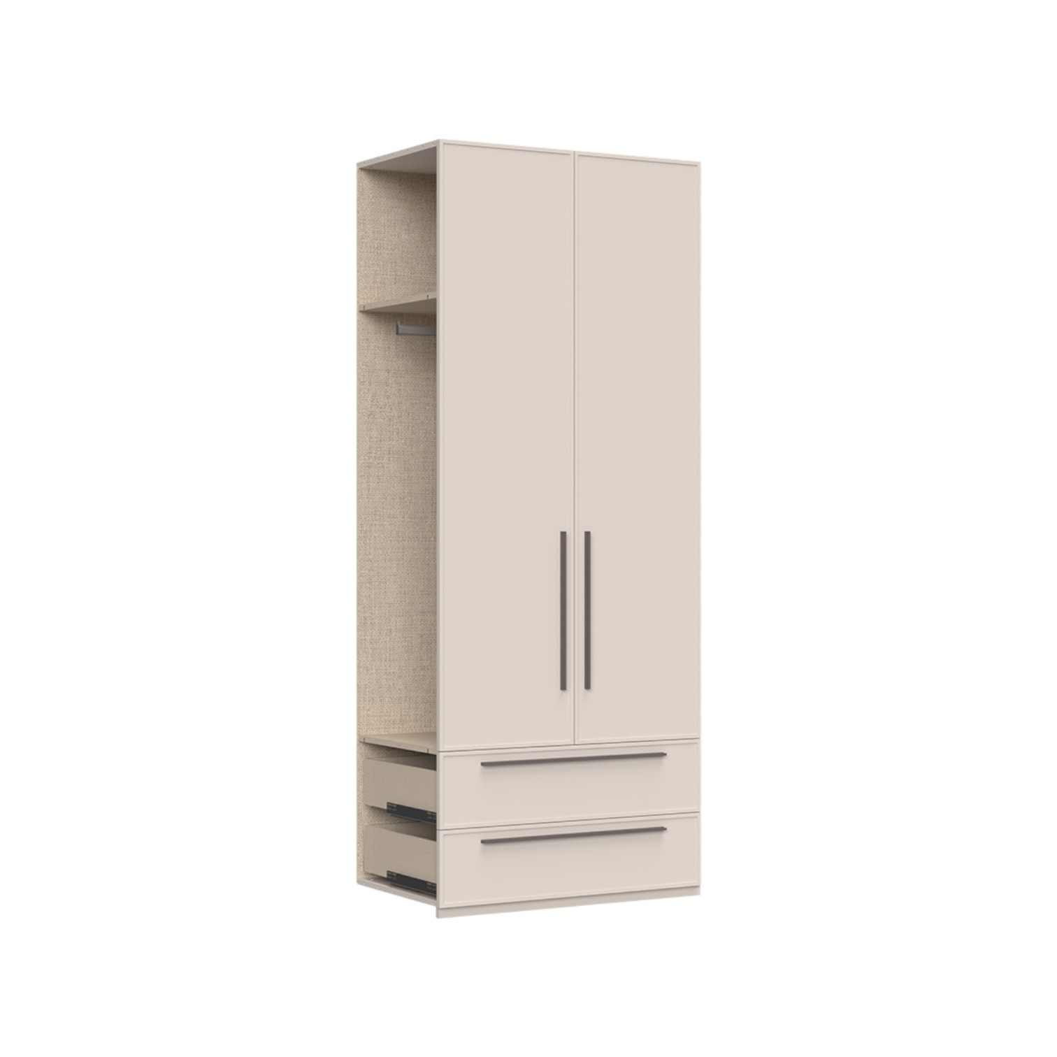 Dodatni ormar iz kolekcije Opera. Dodatak ormarima P1/OP, P2/OP, P2-1OG/OP, P2-AL/OP, P22/OP i PUG/OP. Unutrašnjost u textil dekoru, fronta s ukrasnim profiliranim MDF okvirom, 1 polica i 1 garderoberna šipka, 2 krila i dvije ladice soft mat UV lak u boji kašmira, nivelirajuće nogice, ručke u boji cortado braon mat.