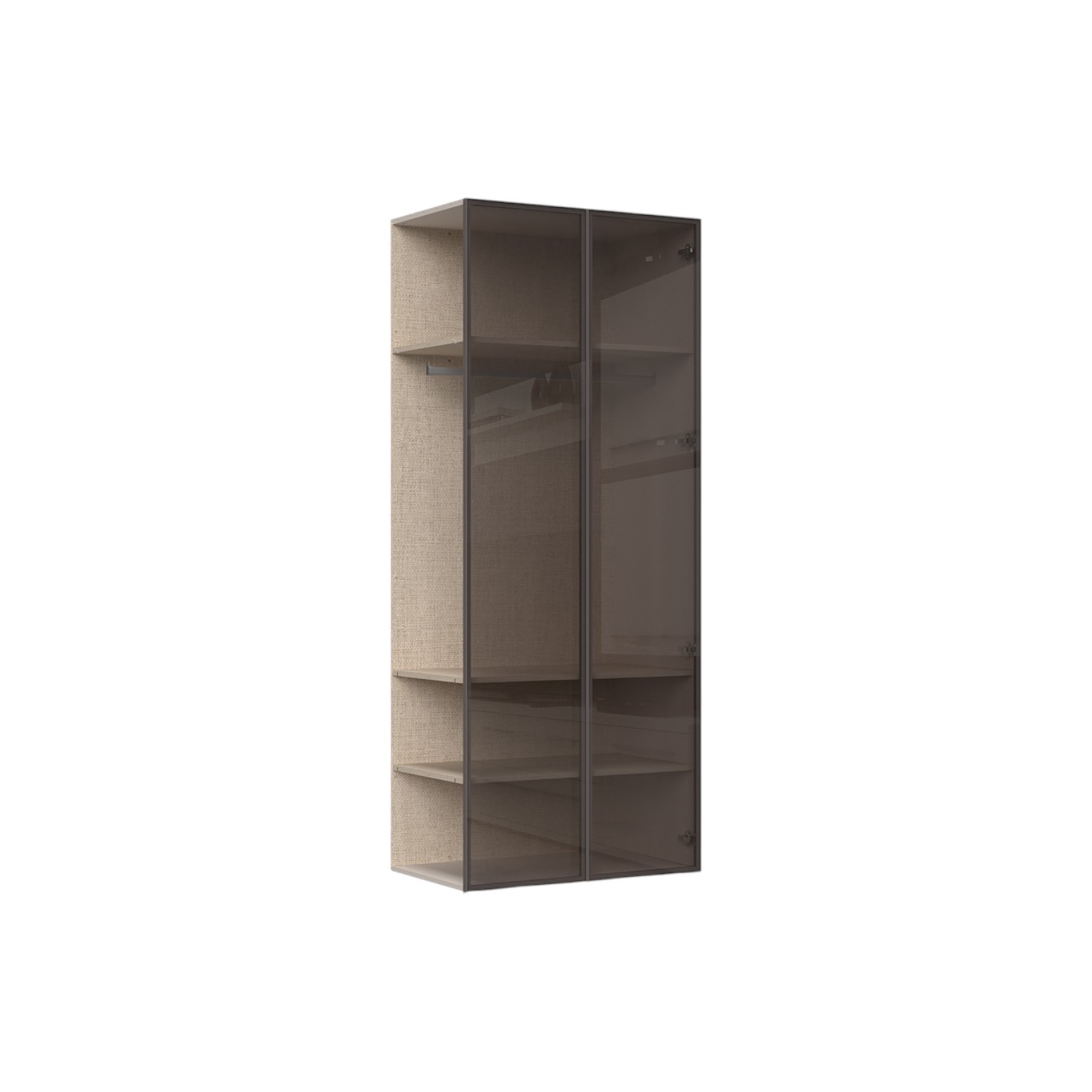 Dodatni dupli ormar sa staklenim frontama s aluminijskim okvirom iz kolekcije Opera. Dodatak ormarima P1/OP, P2/OP, P2-1OG/OP, P2-AL/OP, P22/OP i PUG/OP. Unutrašnjost u textil dekoru, staklene fronte s aluminijskim okvirom, unutarnja rasvjeta ormarića (16W), integrirana u ladice i strop (jedna polica 4W), 3 police i 1 garderoberna šipka, nivelirajuće nogice.