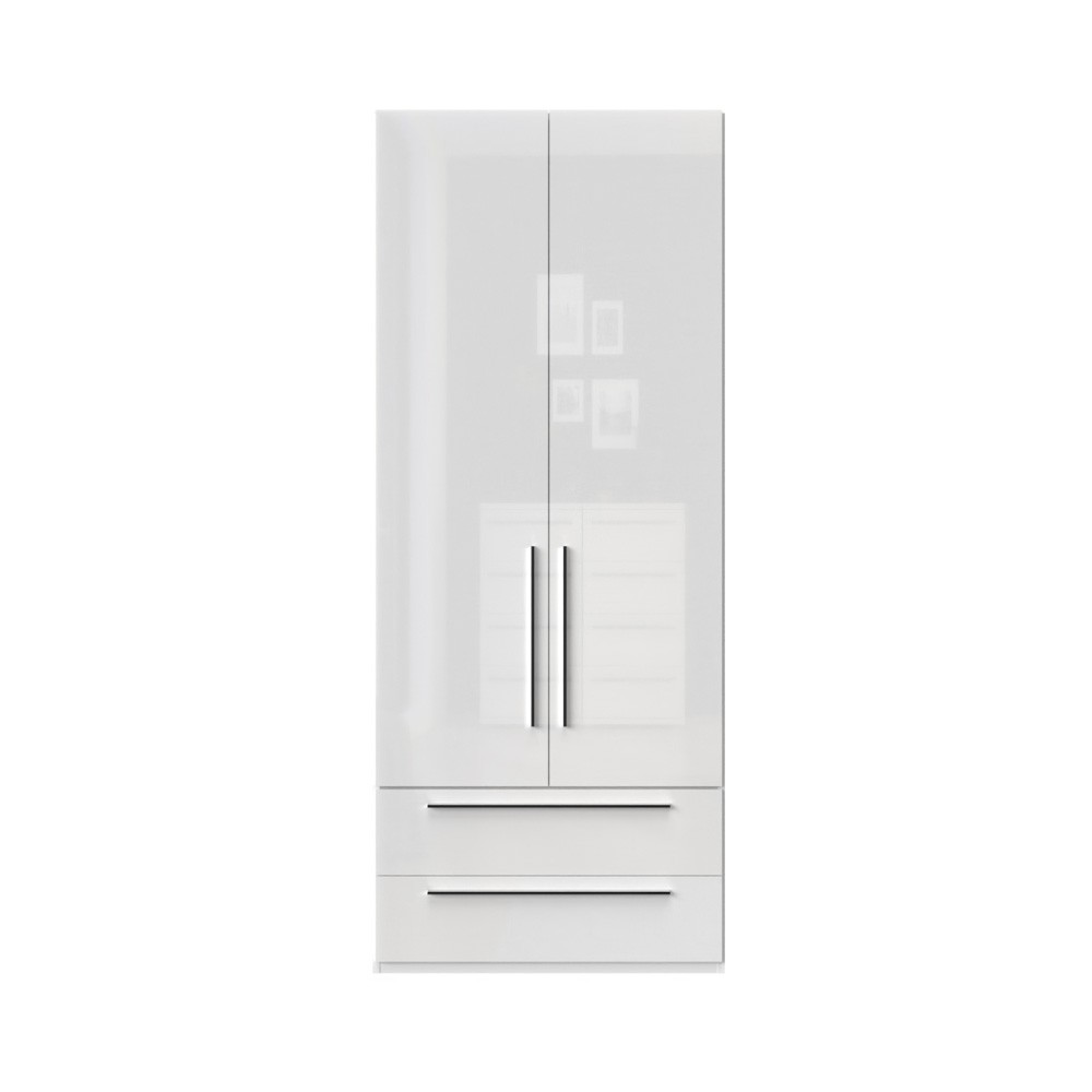 Dodatni ormar dizajniranog geometrijskog oblika, s dva krila i dvije ladice. Uz ovaj ormar već odabranu kompoziciju svog ormara možete proširiti za dvije širine krila sa ladicama. Fronte ormara su lakirane UV lakom visokog sjaja u toploj bež ili kristalno bijeloj boji. Unutarnji dijelovi korpusa su u bijeloj boji. Soft-close šarke omogućuju tiho zatvaranje krila što daje dodatnu pogodnost pri kontinuiranoj uporabi. Metalni segmenti novih klizača ladica s mekim zatvaranjem smanjuju trenje tijekom uporabe, imaju veću otpornost na trošenje i osiguravaju maksimalnu dugovječnost u svakodnevnoj uporabi. Naglasite estetski izgled ormara bočnim i stropnim letvicama, u istoj boji i sjaju, debljine 25 mm. Dodatnom opremom možete kreirati unutrašnjost ormara prema svojim potrebama. Spoj lijepog i jednostavnog u ormaru u kojem su sve stvari uredno posložene.