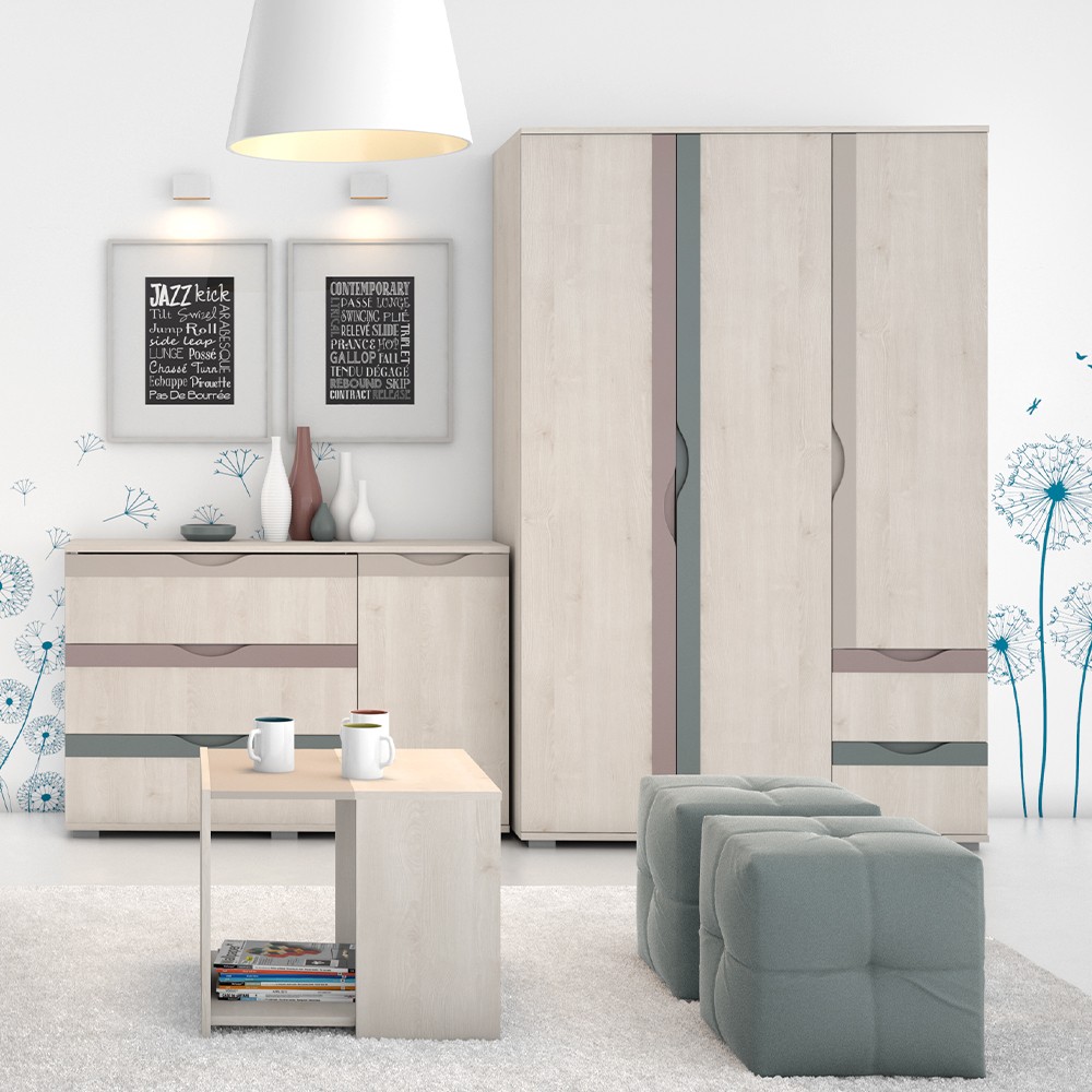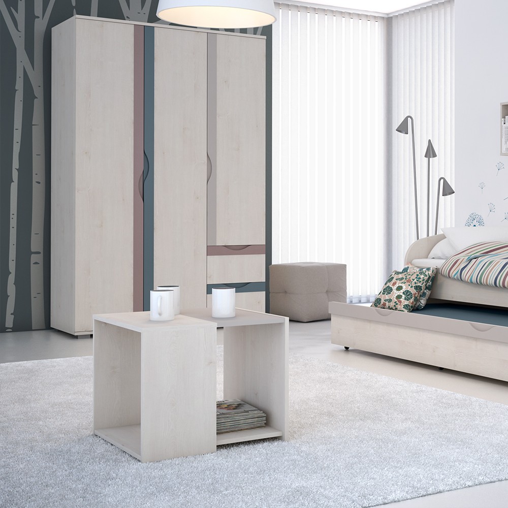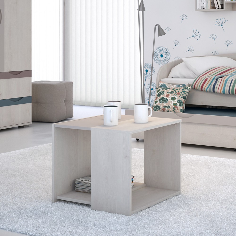 Klub stolić za dječju sobu, iz kolekcije Joy, atraktivnog dizajna. Korpus elementa izrađeno je od šperploče u drvnom dekoru polarni bor u kombinaciji s MDF-om u boji pijeska.